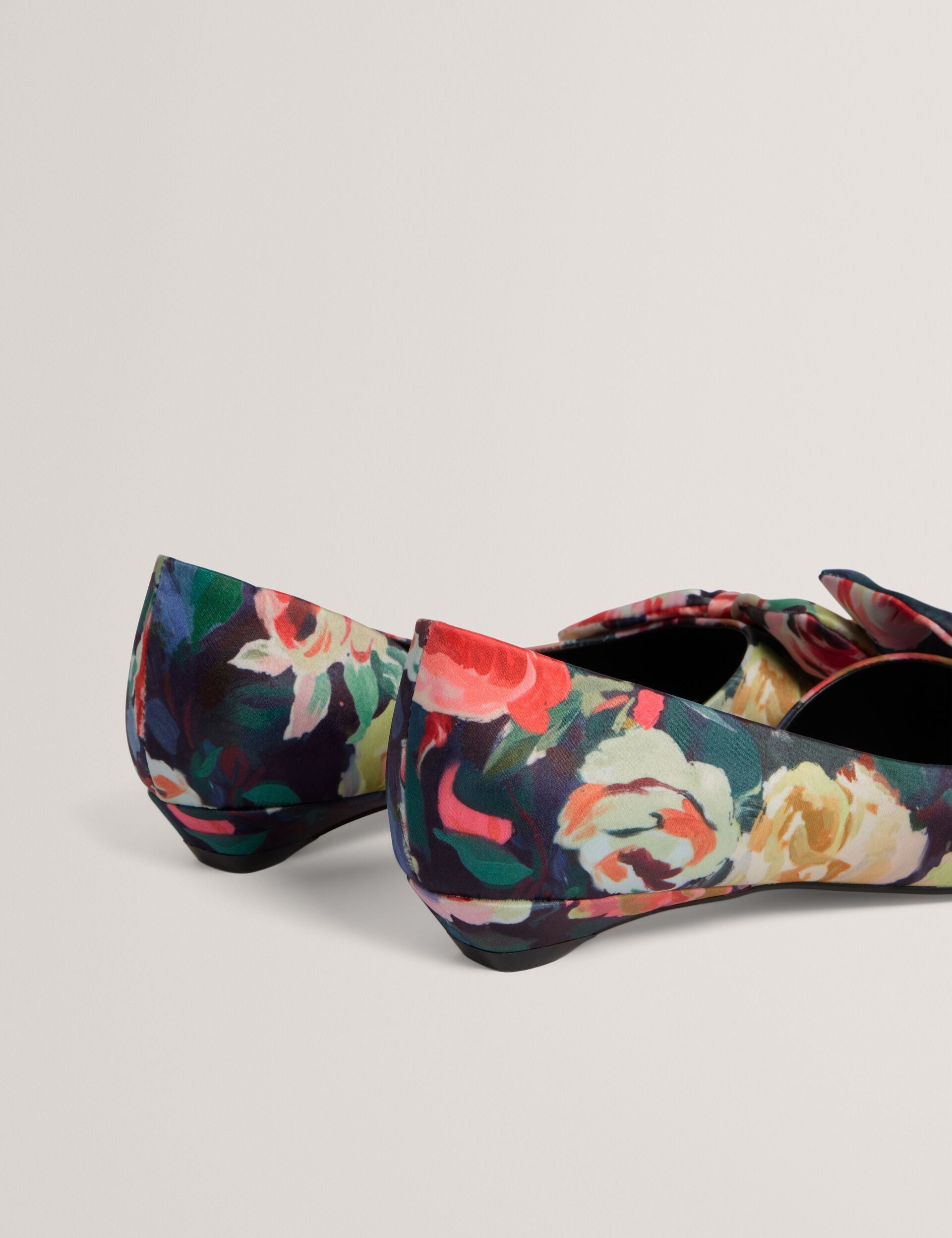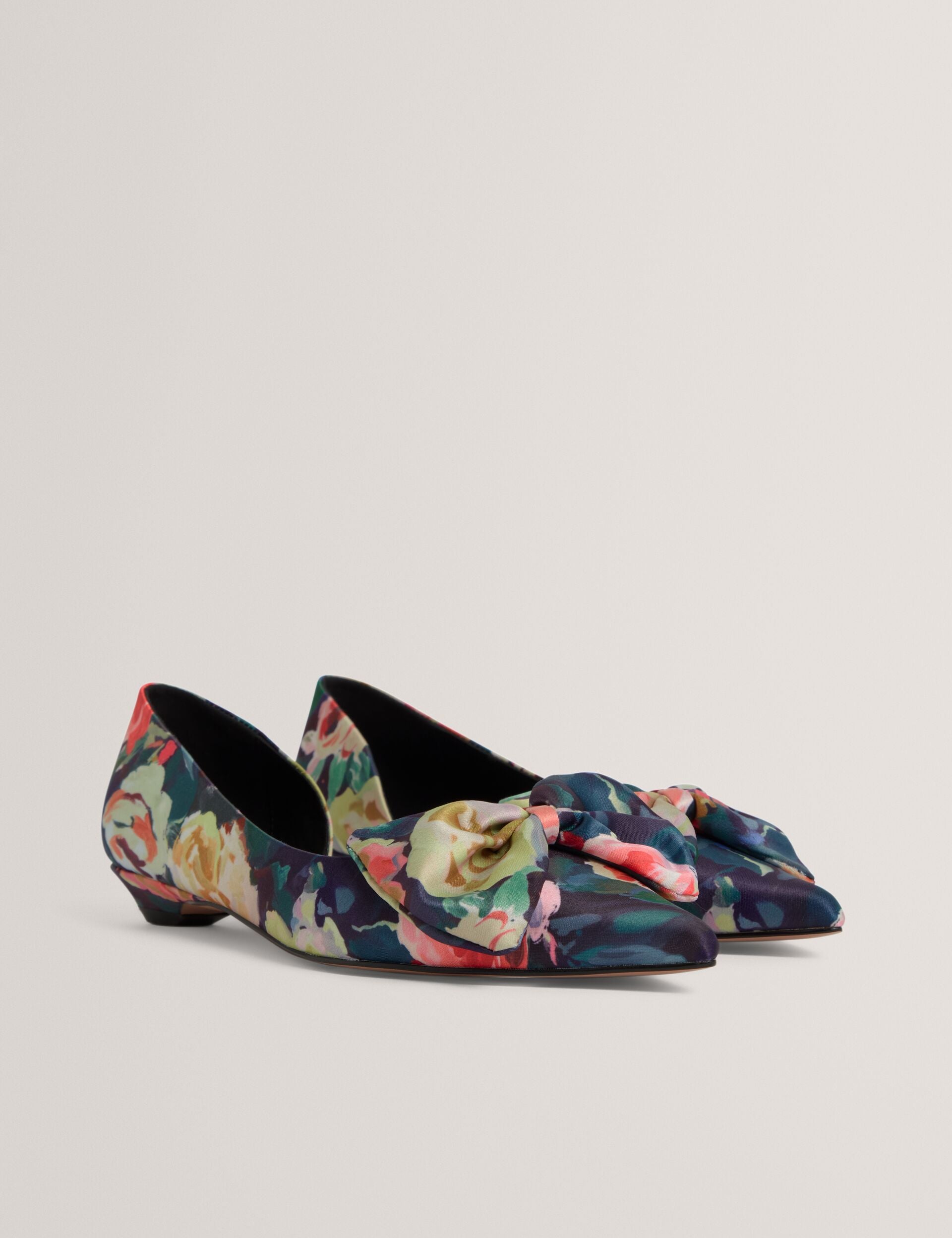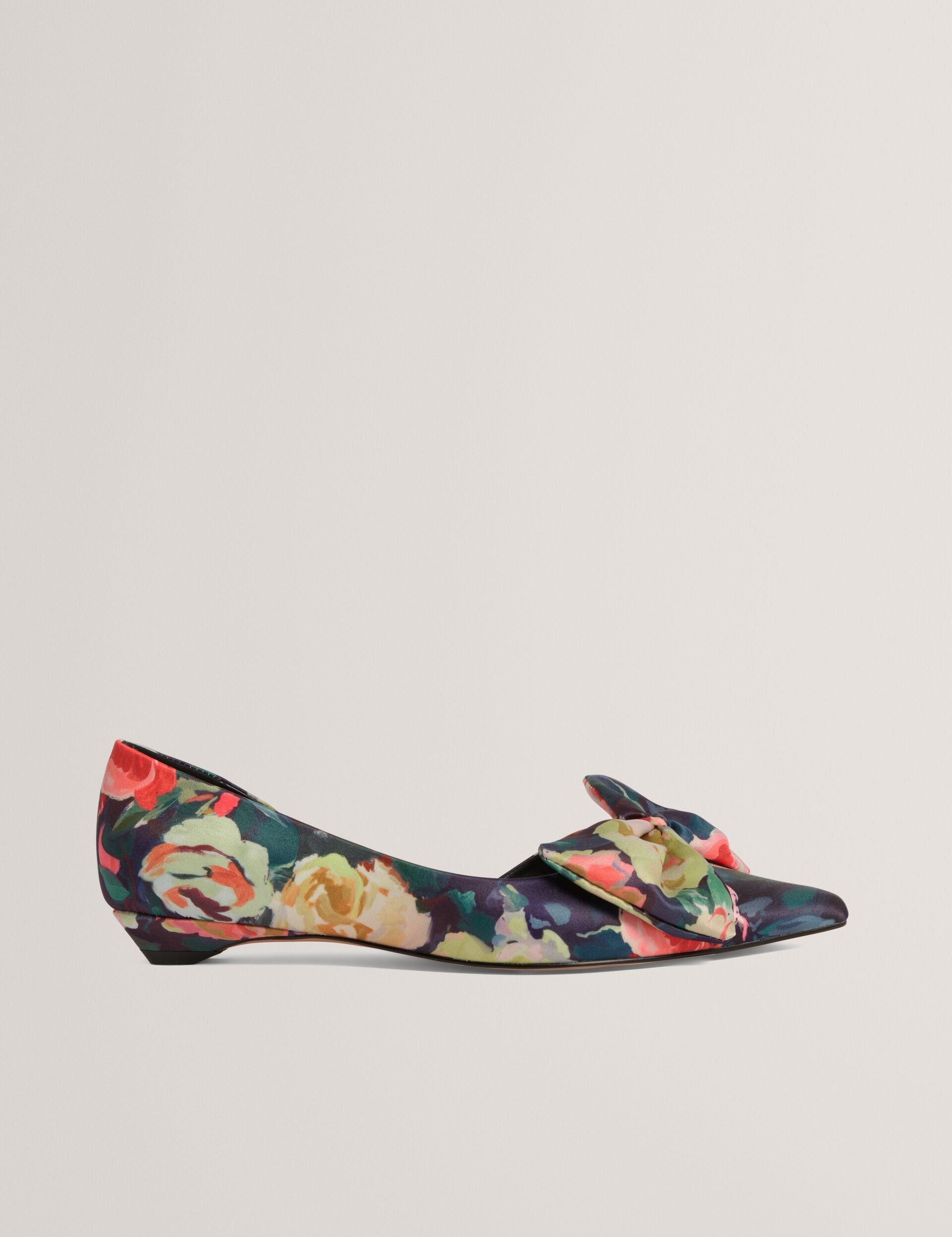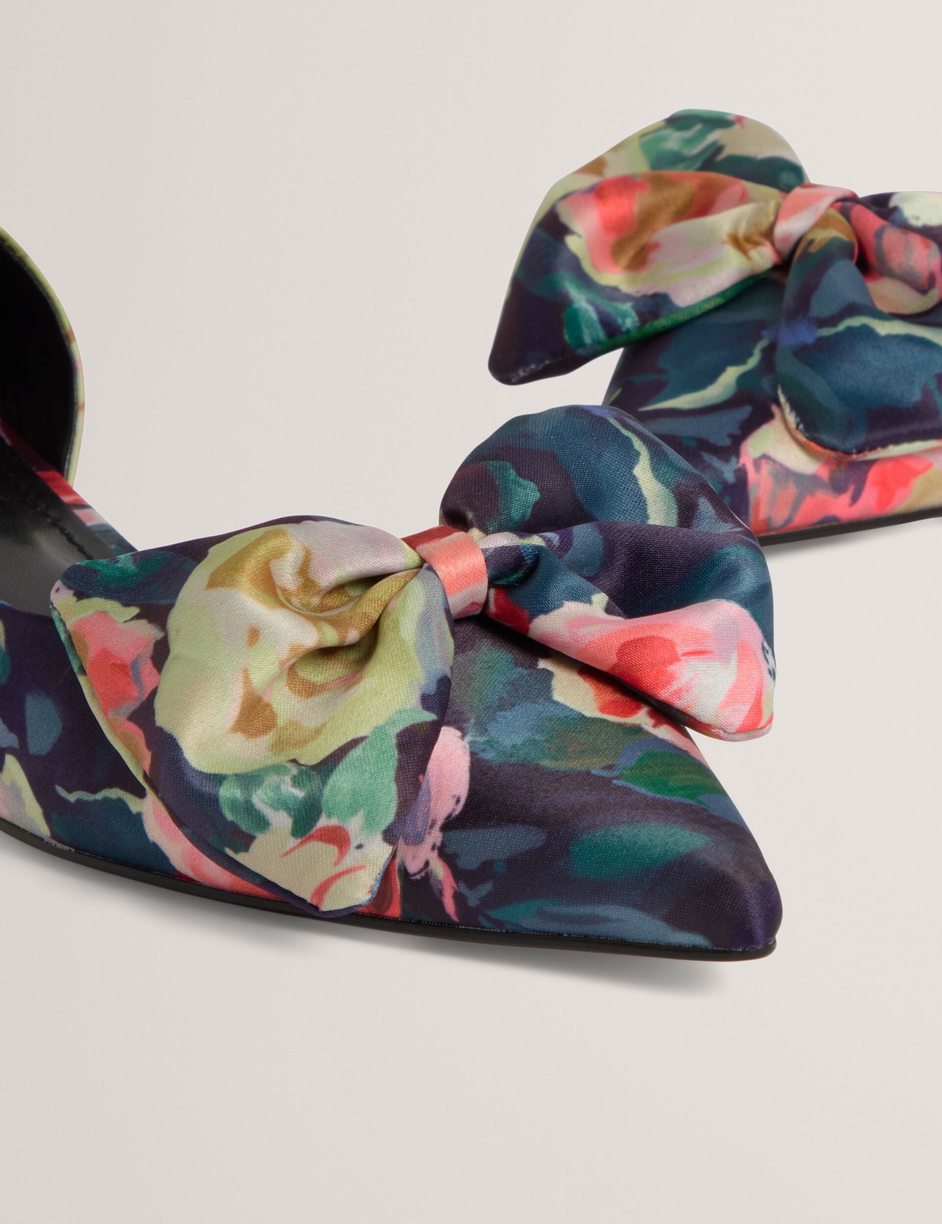 Step into statement style with the PALOUMA kitten heels. Featuring a vivid rose print and a sleek satin finish, these eye-catching shoes are topped with a playful bow for a feminine flair.