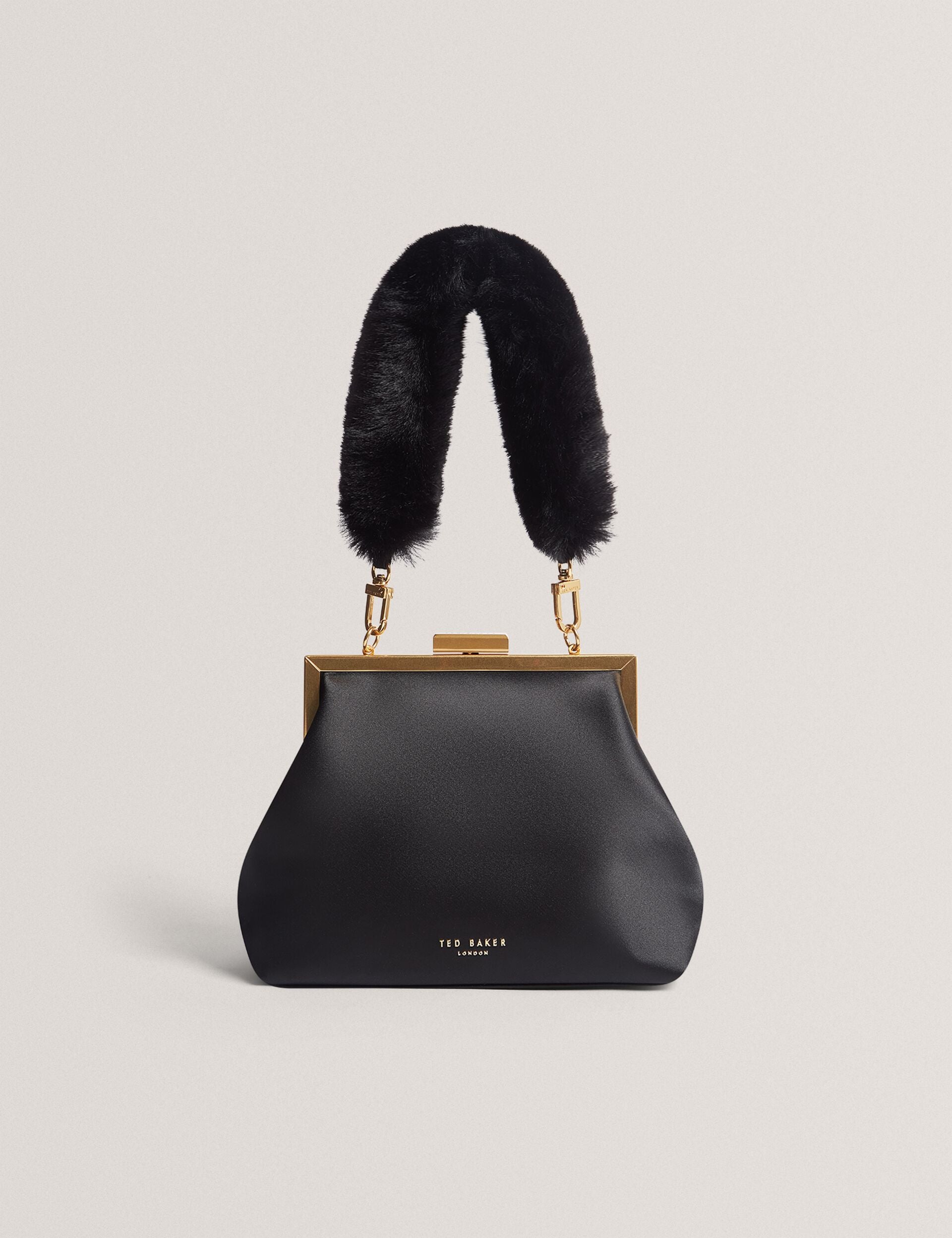 Bold elegance meets playful glam in the PURCEY clutch bag. With its smooth satin, plush faux fur handle, and gold-tone chain detail, this statement piece adds a luxe touch to your evening look.