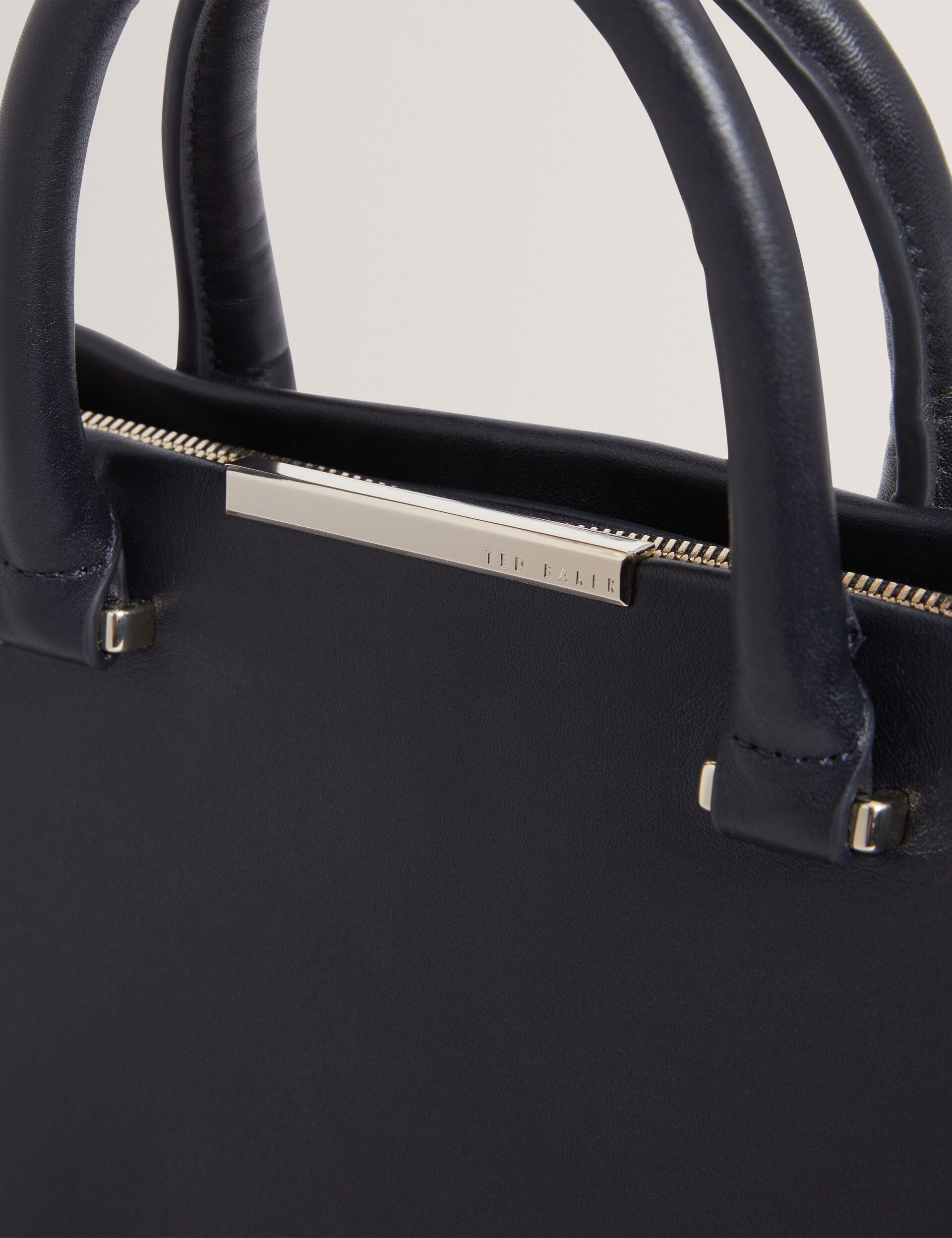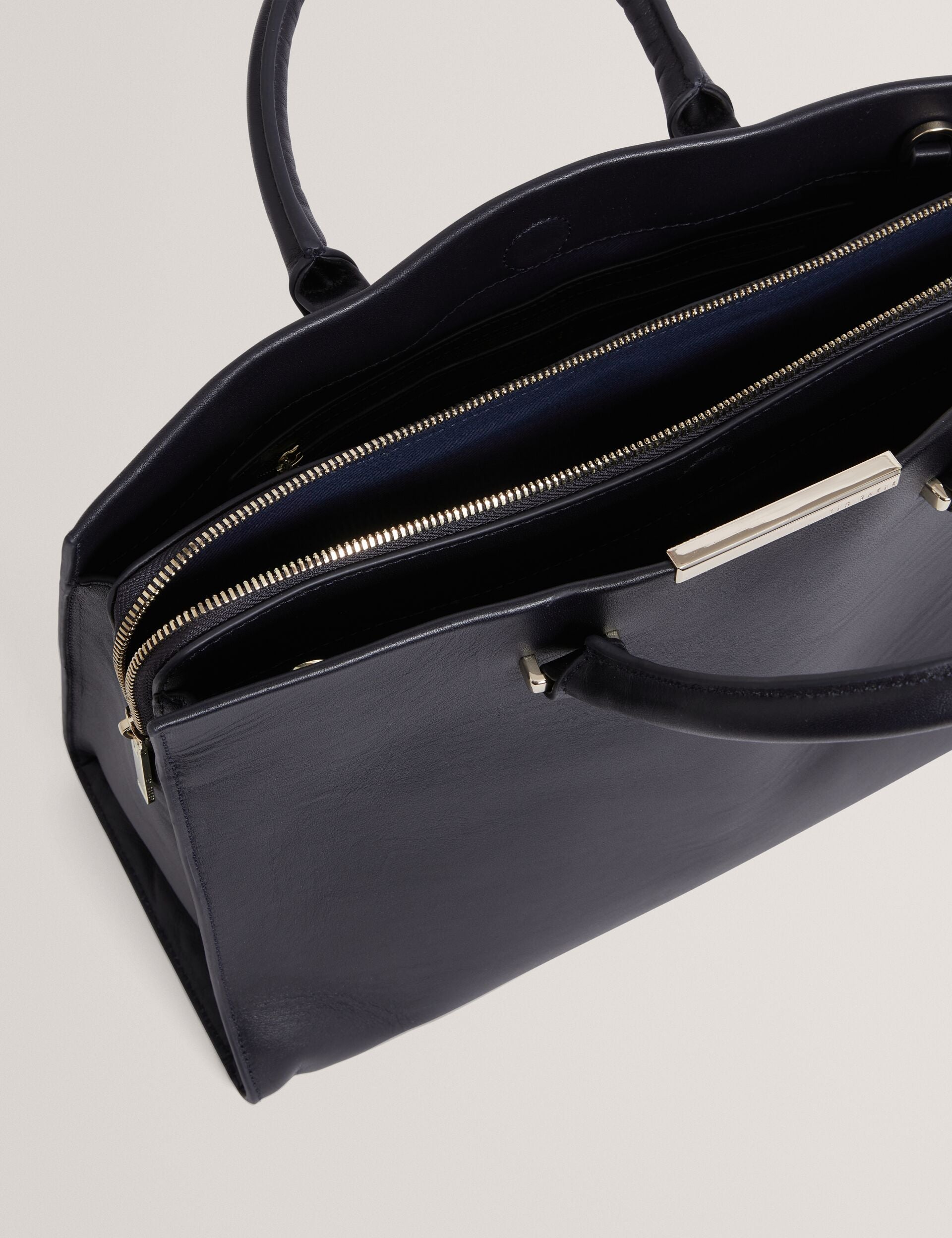 Crafted from premium leather with a sleek metal bar accent, the RENAAE structured tote bag offers generous interior space while keeping a slim, elegant profile for an effortlessly chic look.