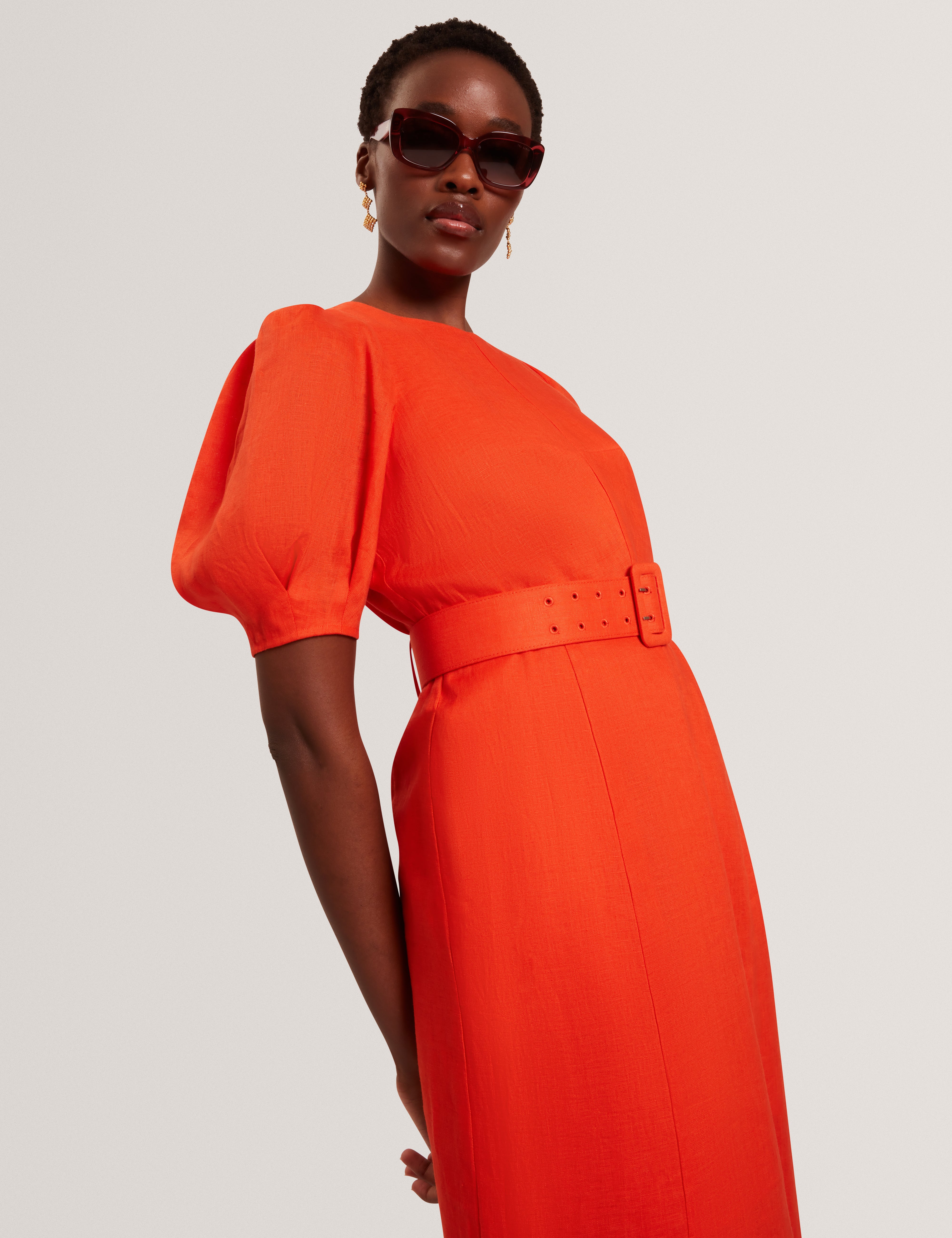 Shaped Puff Sleeve Belted Linen Midi Dress