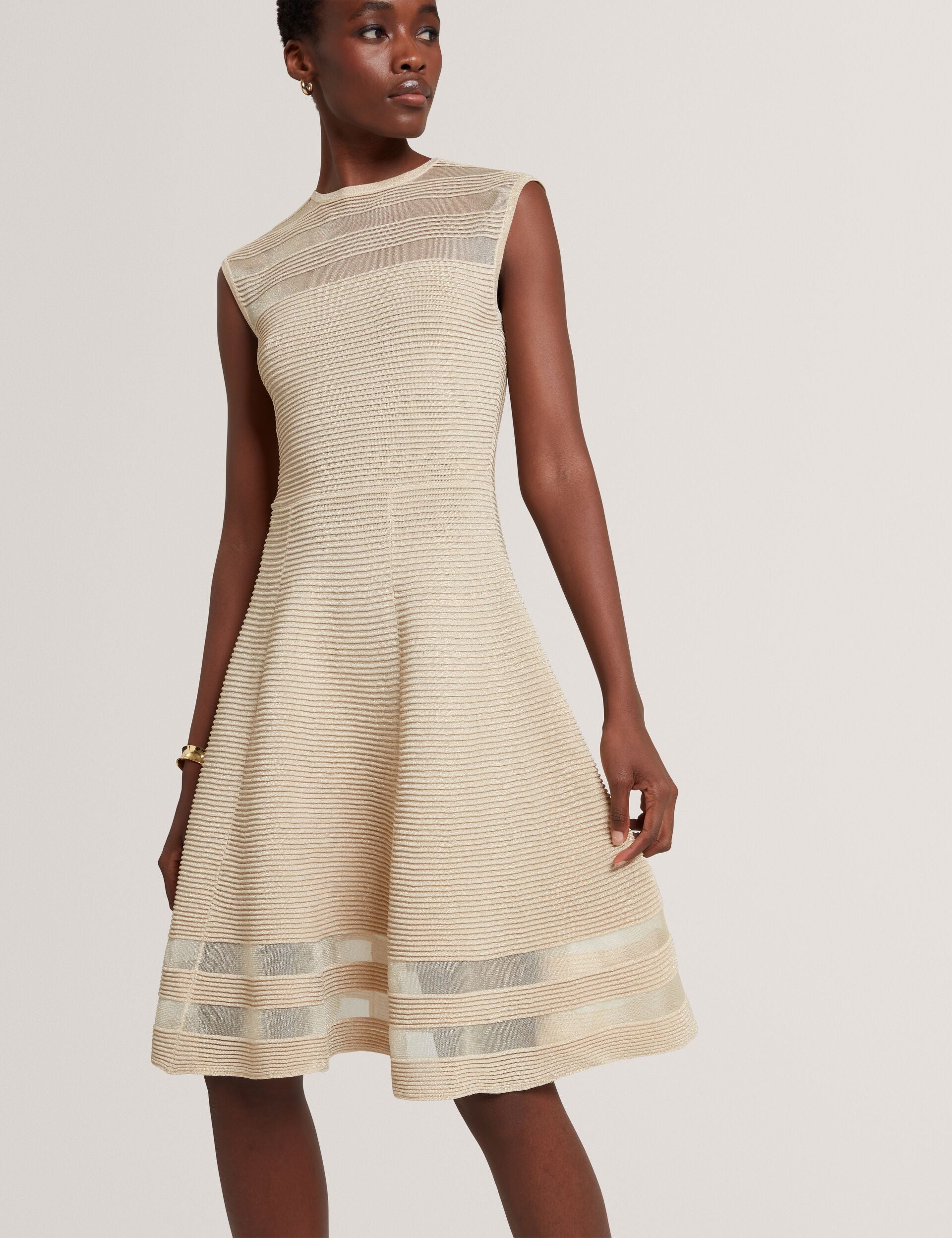 The SAALLI skater dress is feel-good style for the festive season, designed in a comfortable yet flattering silhouette and woven with metallic lurex yarn for a dash of shimmer. Stitched ribbing and sheer panel details introduce a mix of textures, creating a party piece you can't take your eyes off.