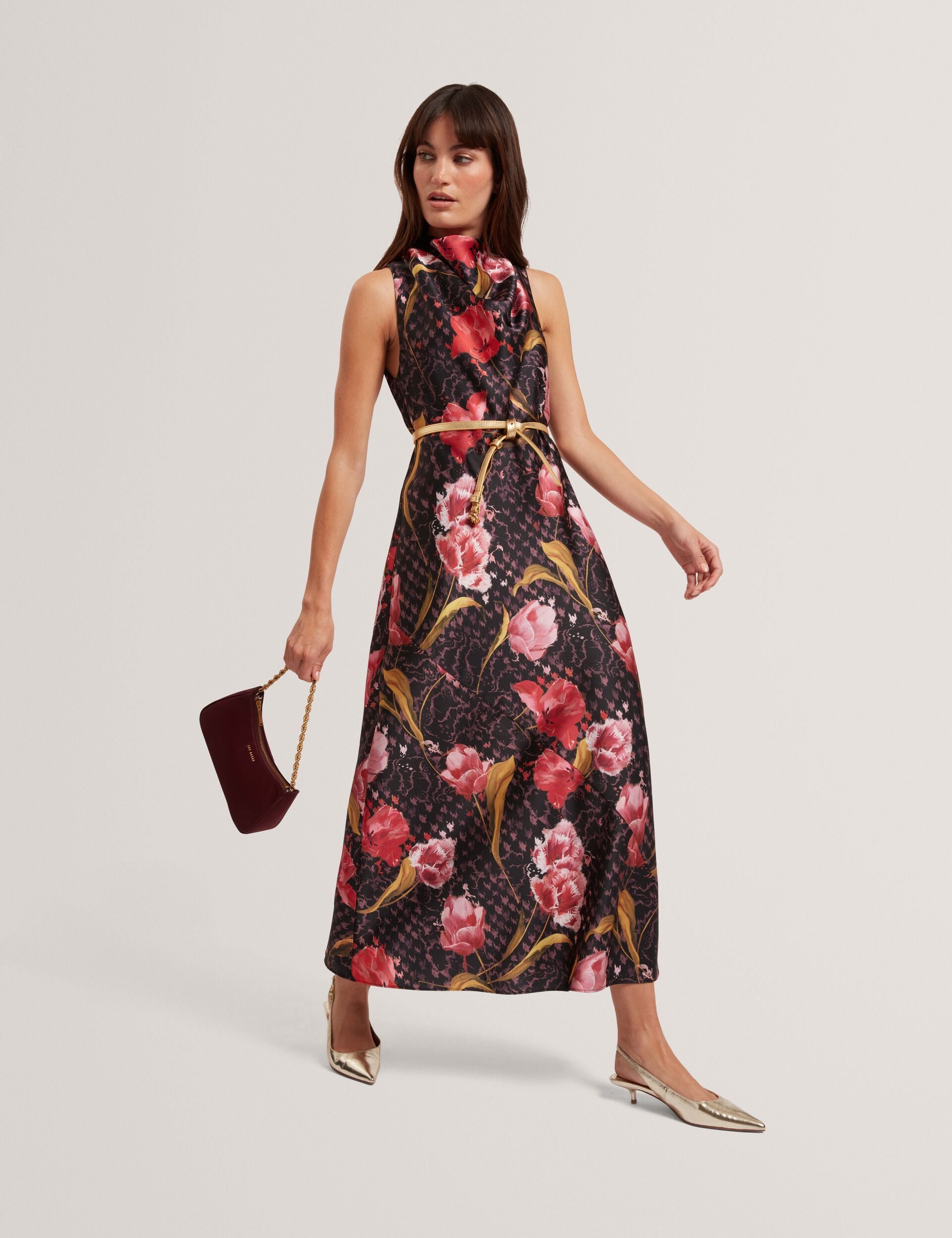 Floral Check Cowl Neck Satin Midi Dress