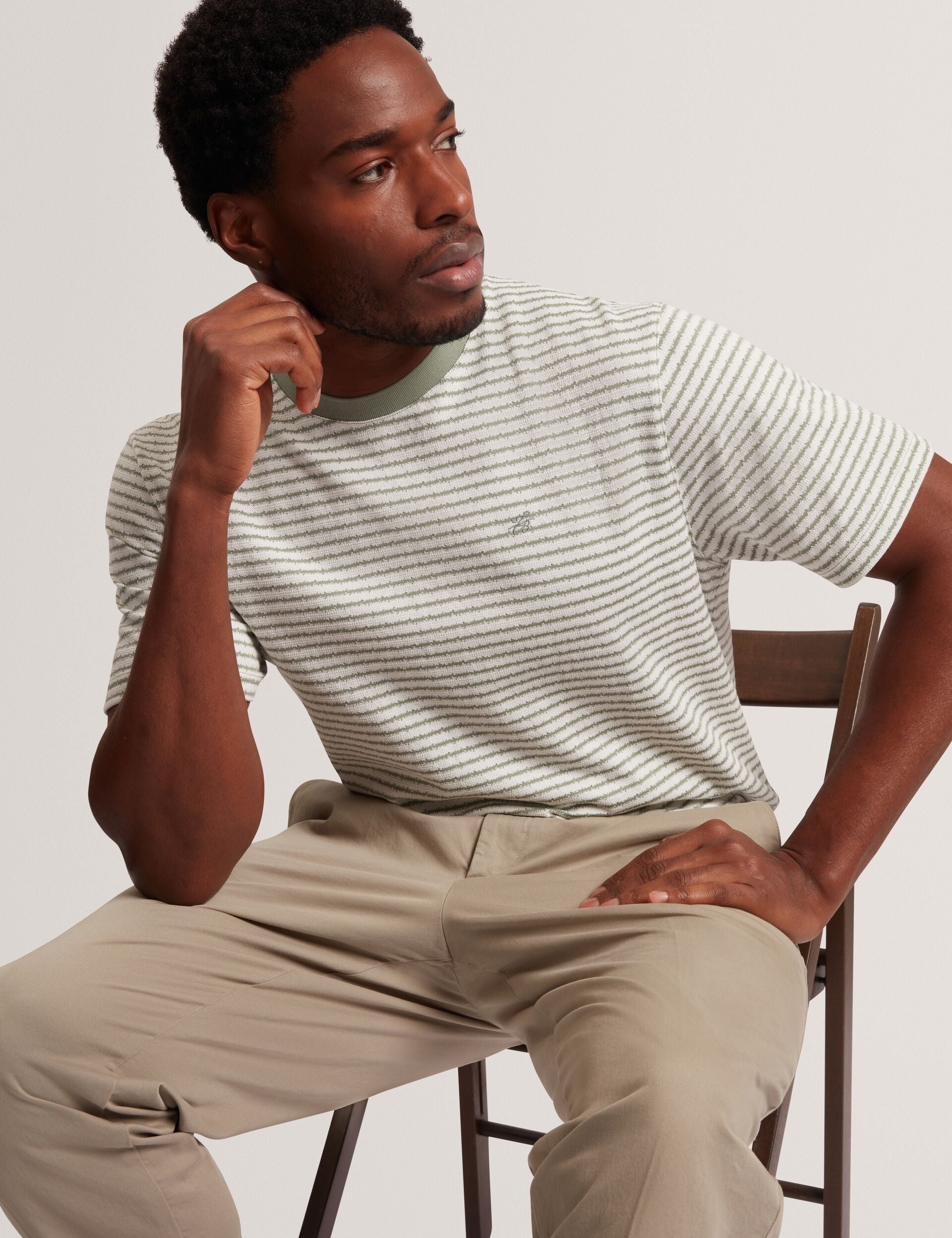 A striped t-shirt is a timeless staple that works in every wardrobe, and VEXRIN offers a modern twist on this classic, adding textural stripes and a contrast neckline to its knitted cotton fabric.
