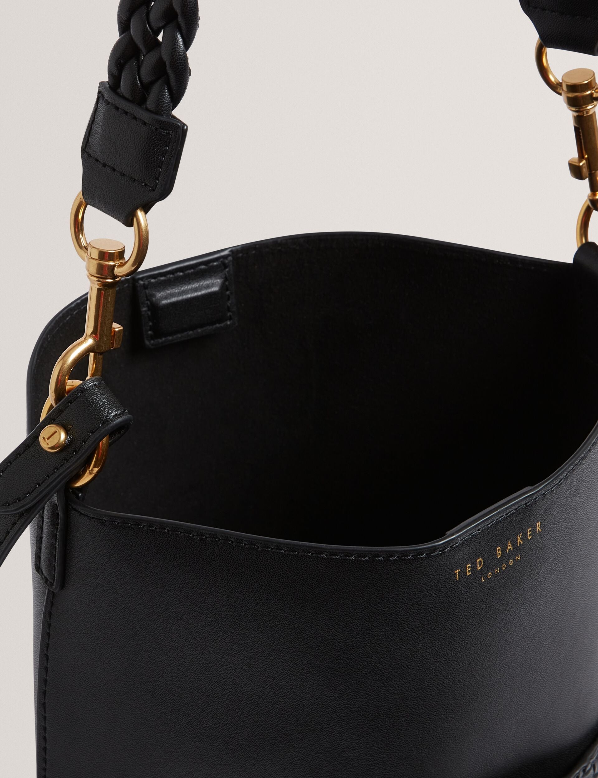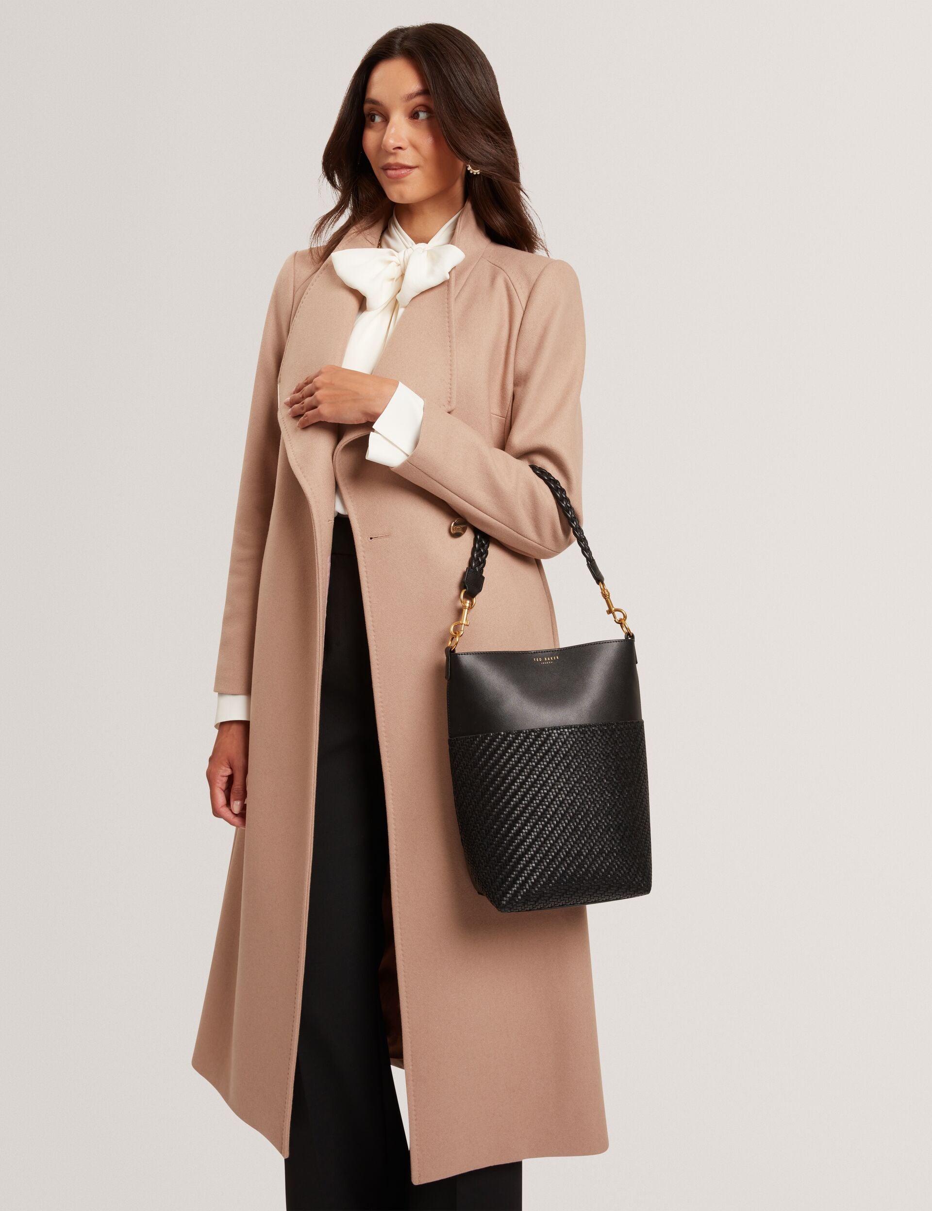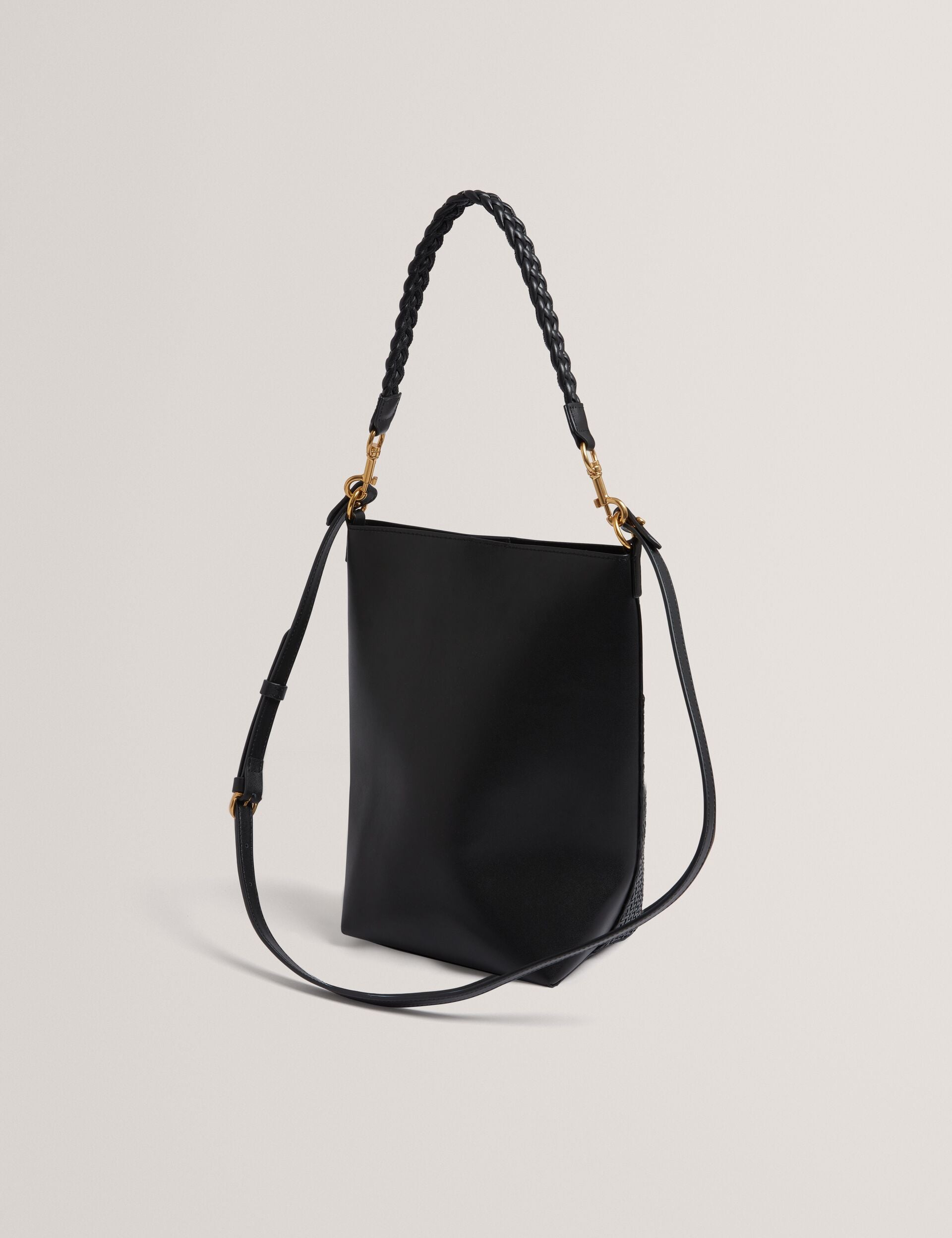 Smooth leather meets artisanal weaving in the WYYNIE bucket bag, featuring a plaited shoulder strap and basket weave front panel. Its elongated shape and structured silhouette is roomy, refined, and ready for everyday elegance.