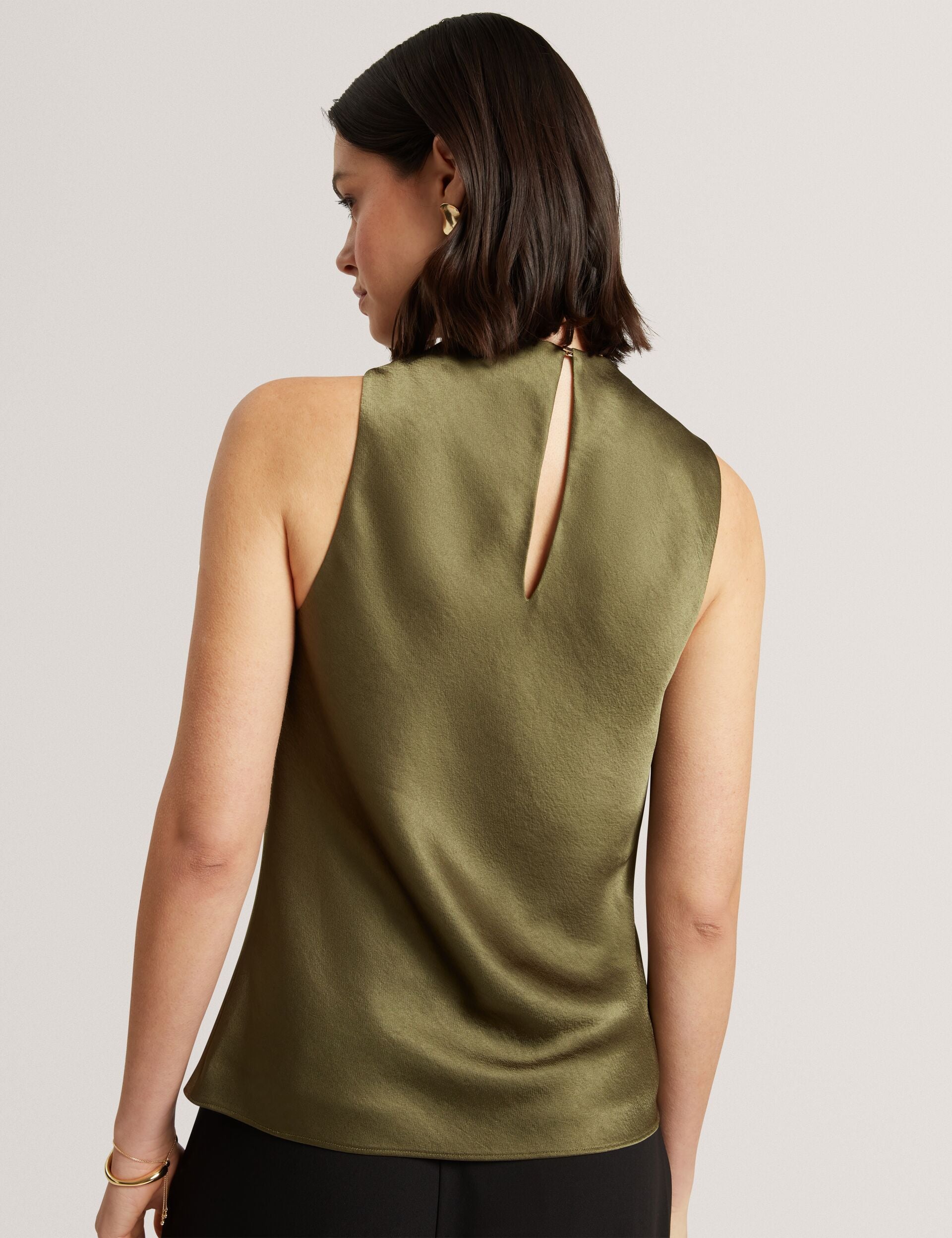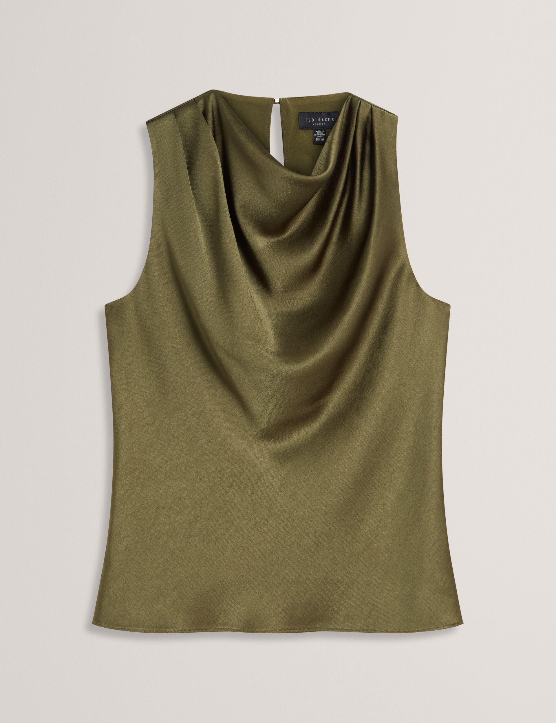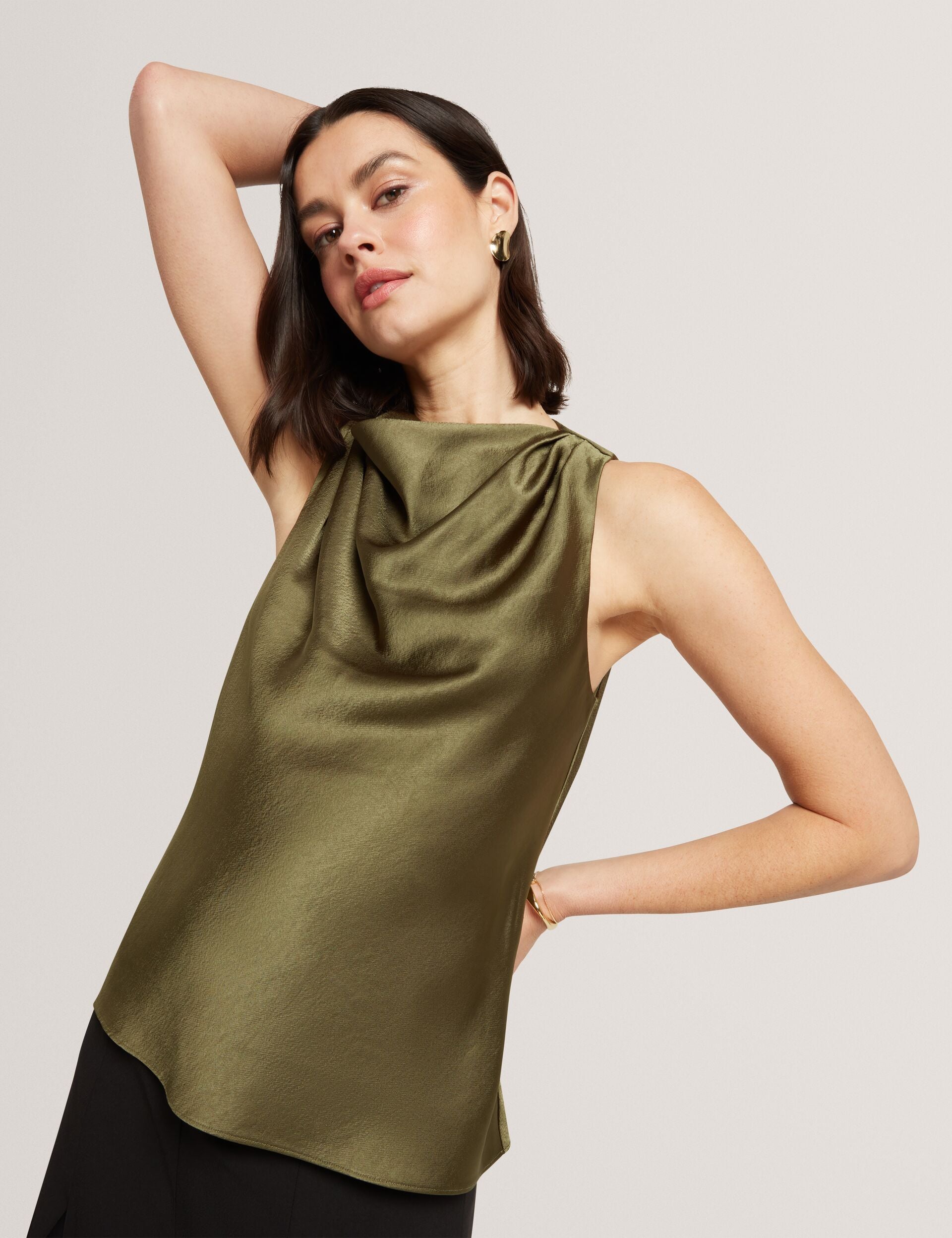 ZEPHA was made for after-dark plans with its textured satin fabric and the subtle drama of the draped cowl neckline. Designed in an earthy shade of khaki, this sleeveless top feels refined without even trying.