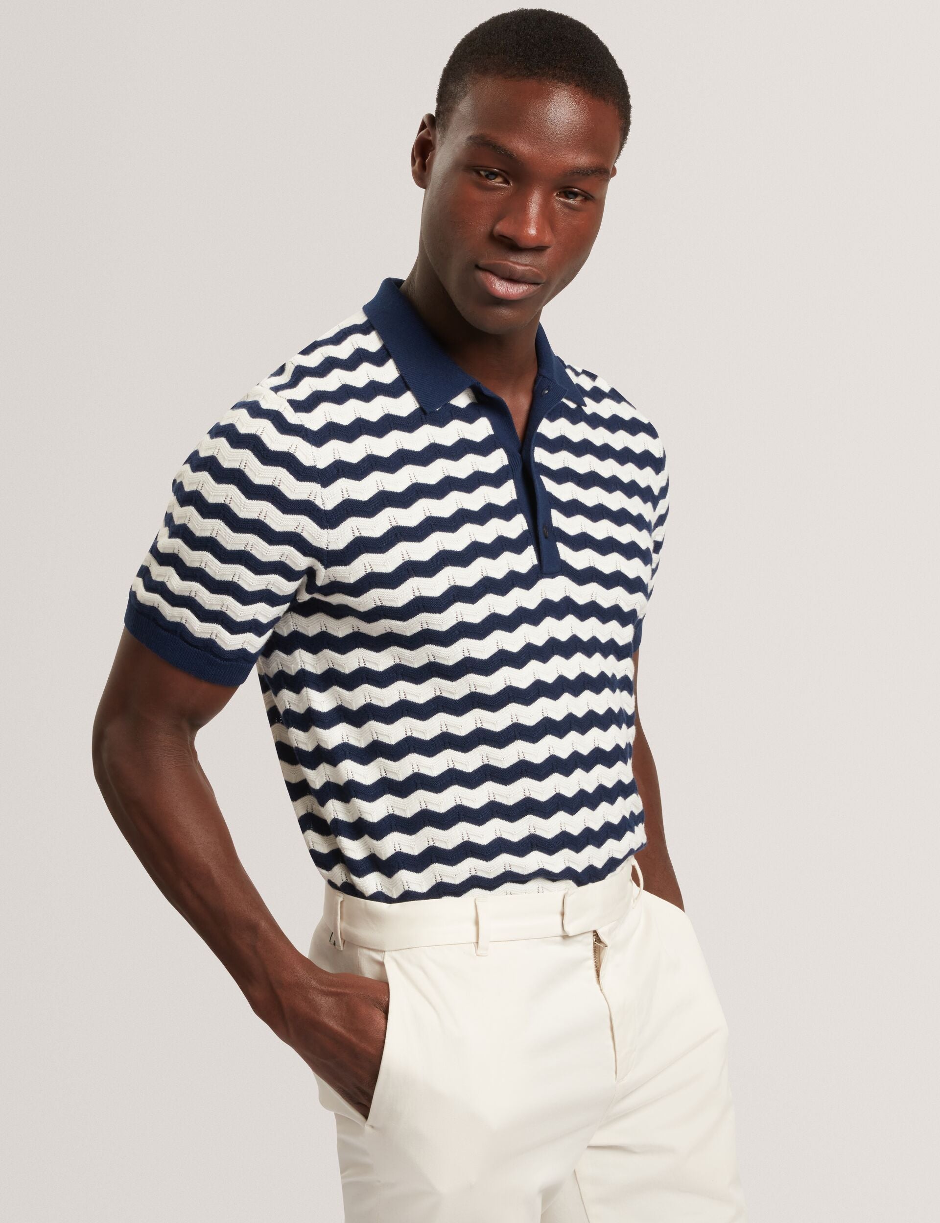Get on board the nautical trend with the FROOBIE short sleeve polo, which features classic navy and white stripes in a playful wavy formation. Style this fine knit top with neutral tone chinos or linen shorts to nail that preppy look.