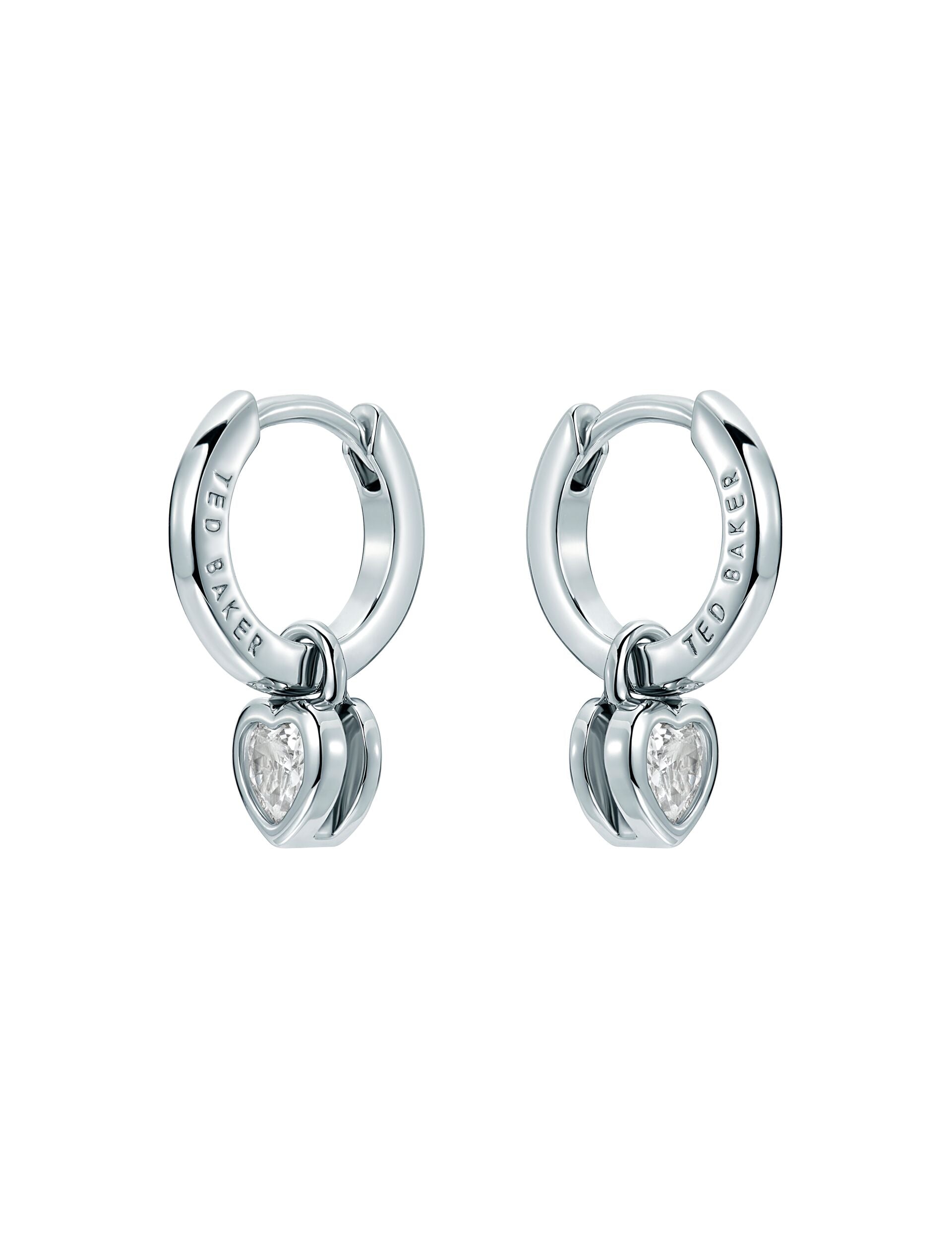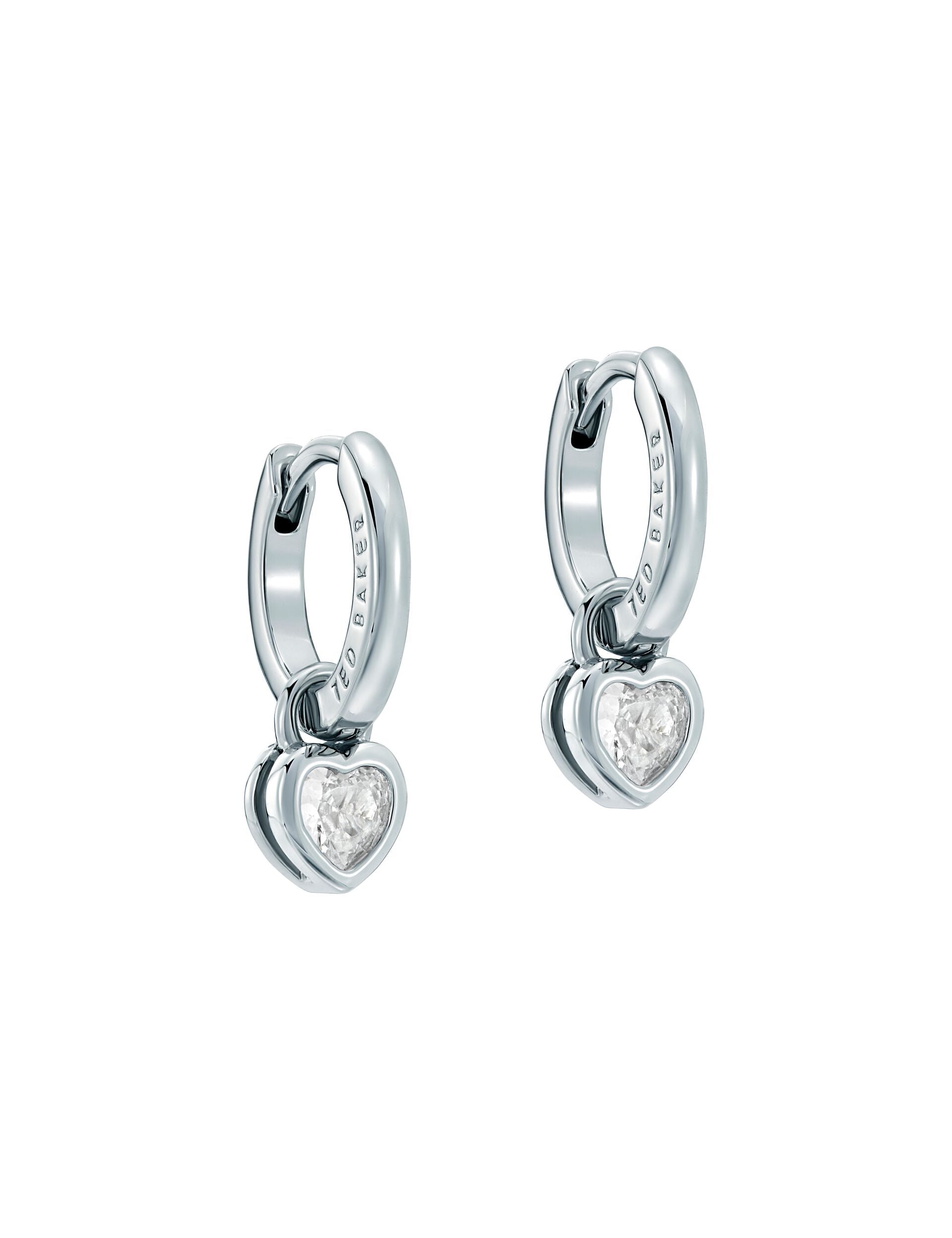 The HARPERS huggie earrings bring subtle sparkle and movement, featuring a mini crystal heart pendant hanging from a shiny silver-tone hoop. They add a sweet touch that works for everyday looks as well as dressier moments.
