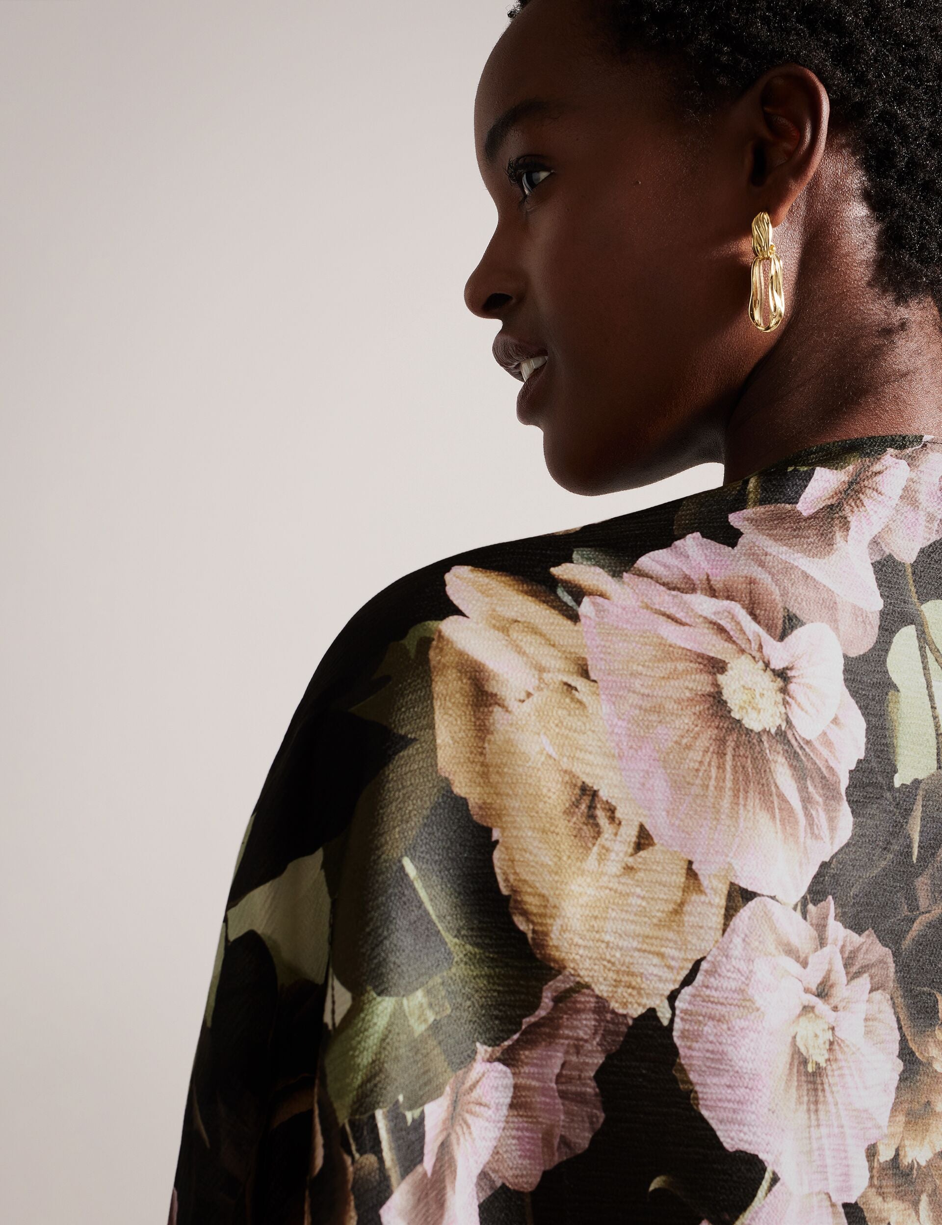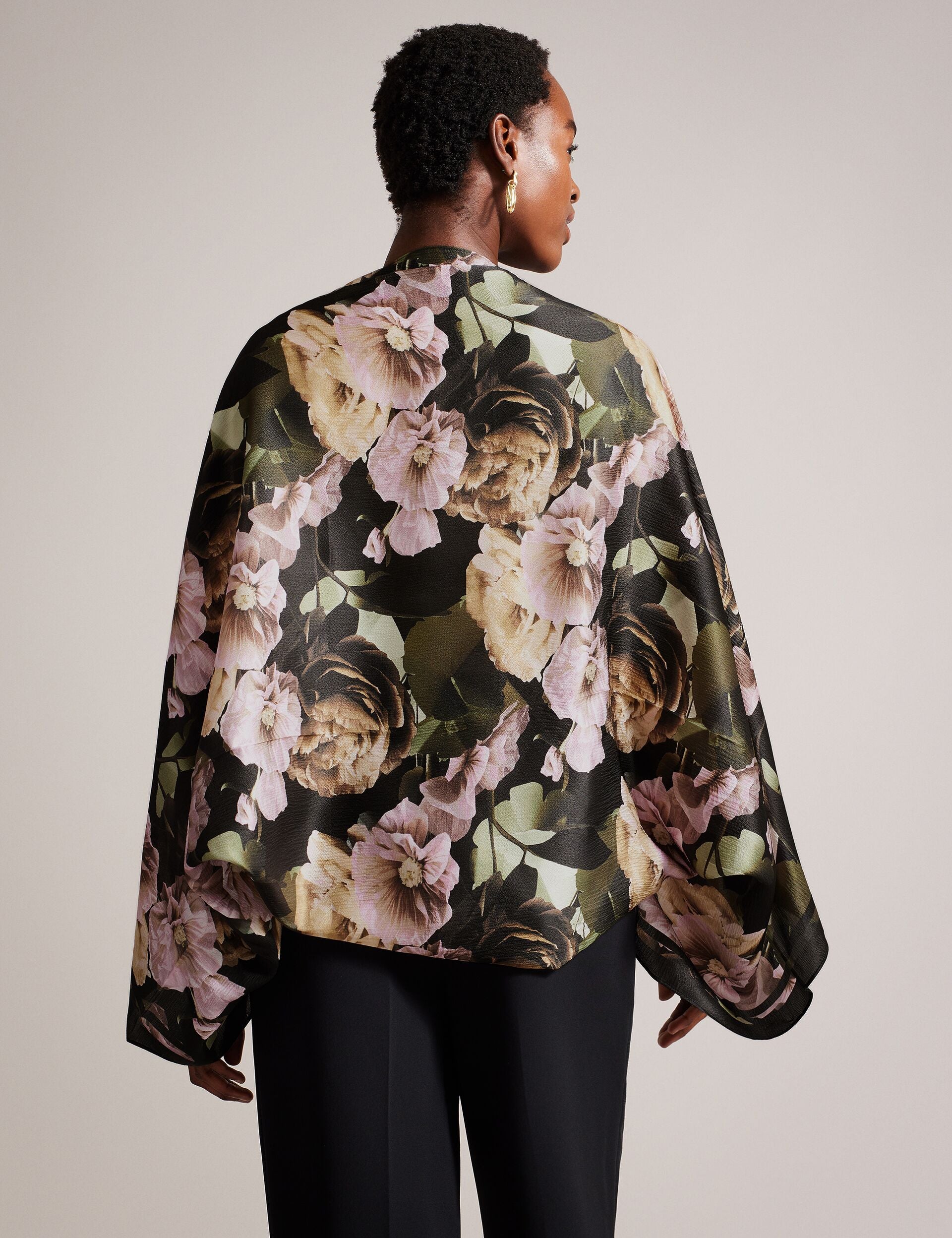 ABIAII adds easy style points to your outfit. Cut from pure silk with our elegant floral print, this cape protects you from gentle breezes and adds a beautiful pop of color to your look.