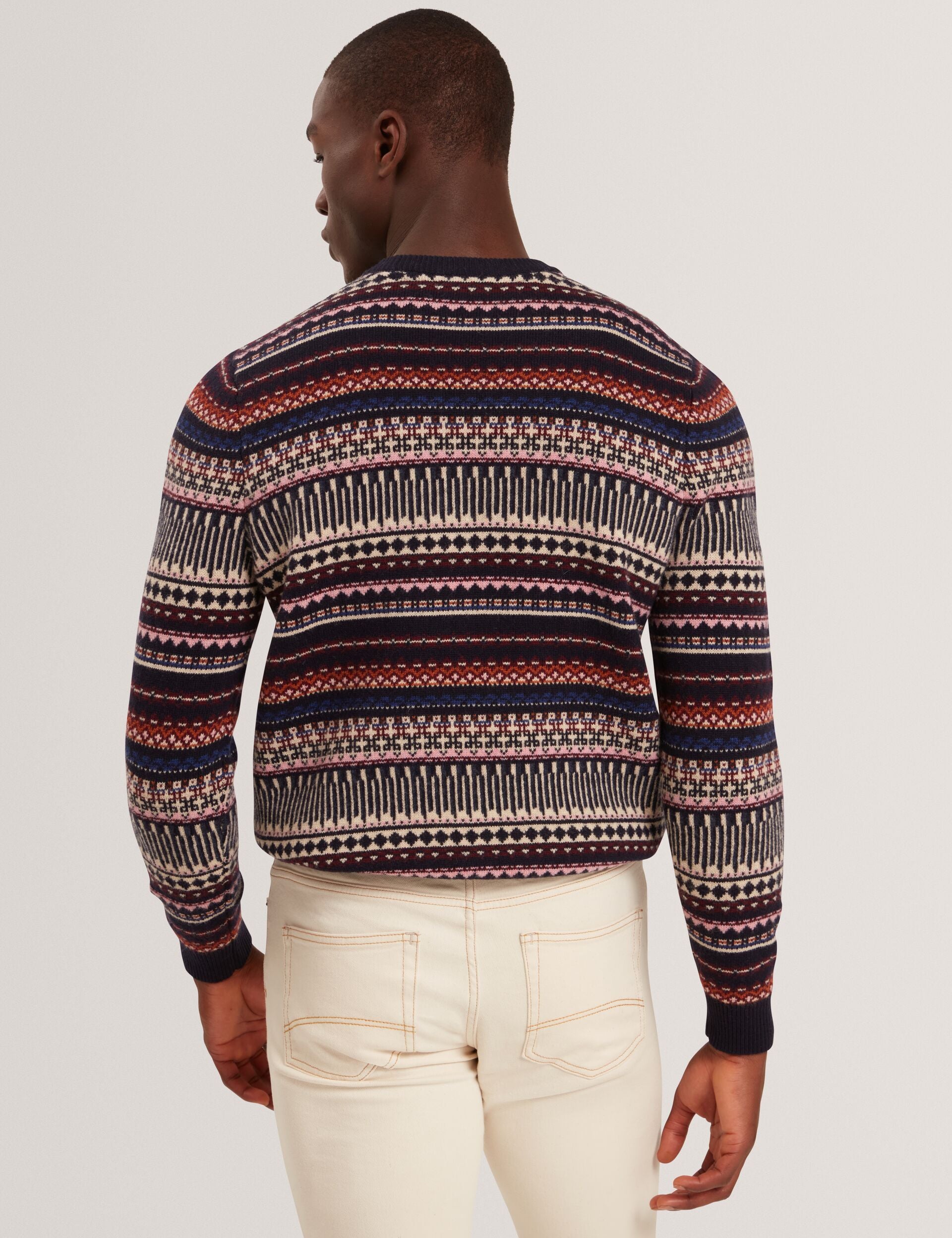 Inspired by British heritage, AMARAT mixes rich color with geometric design in this classic fair isle knit. Made from a cozy wool blend with a classic crew neck, this sweater packs personality into your casual fits.