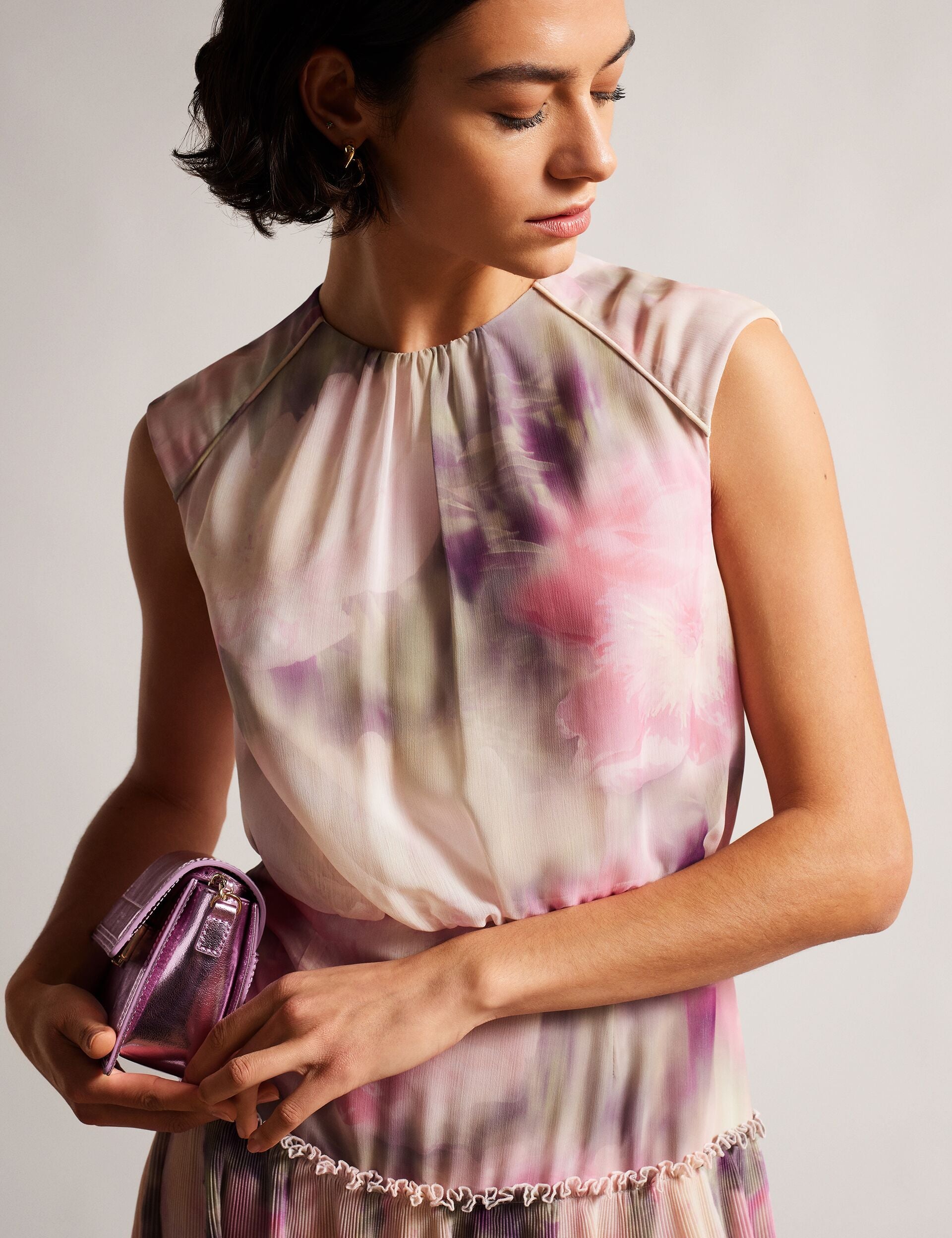 The AMORITA mini dress is the perfect way to flaunt your spring-time style. The tiered skirt, sleeveless design, and blurred floral print make this dress a must have. Pair it with your favourite wedge sandals for a chic brunch look.