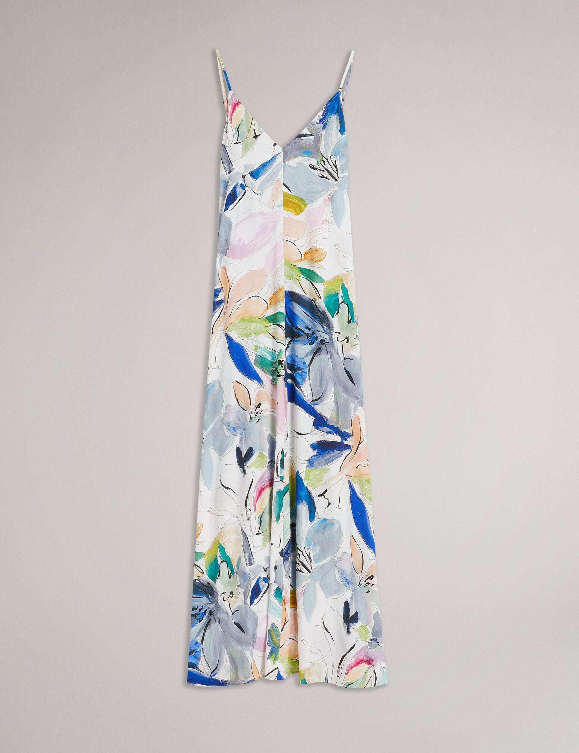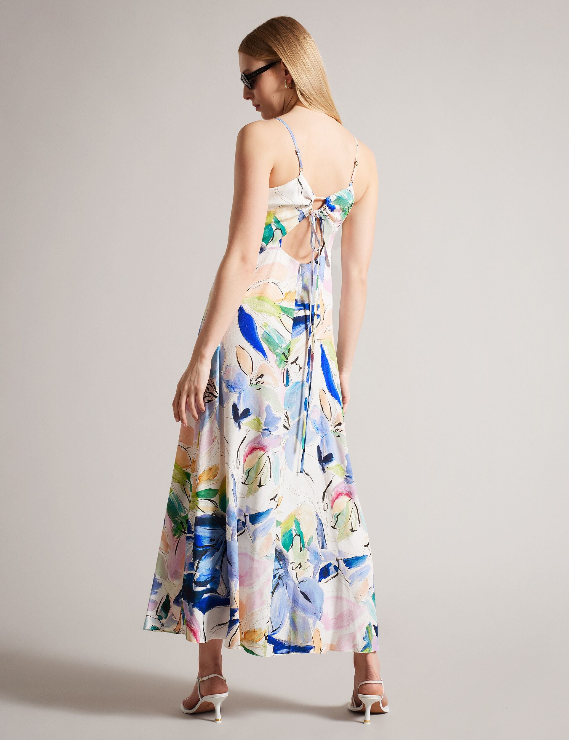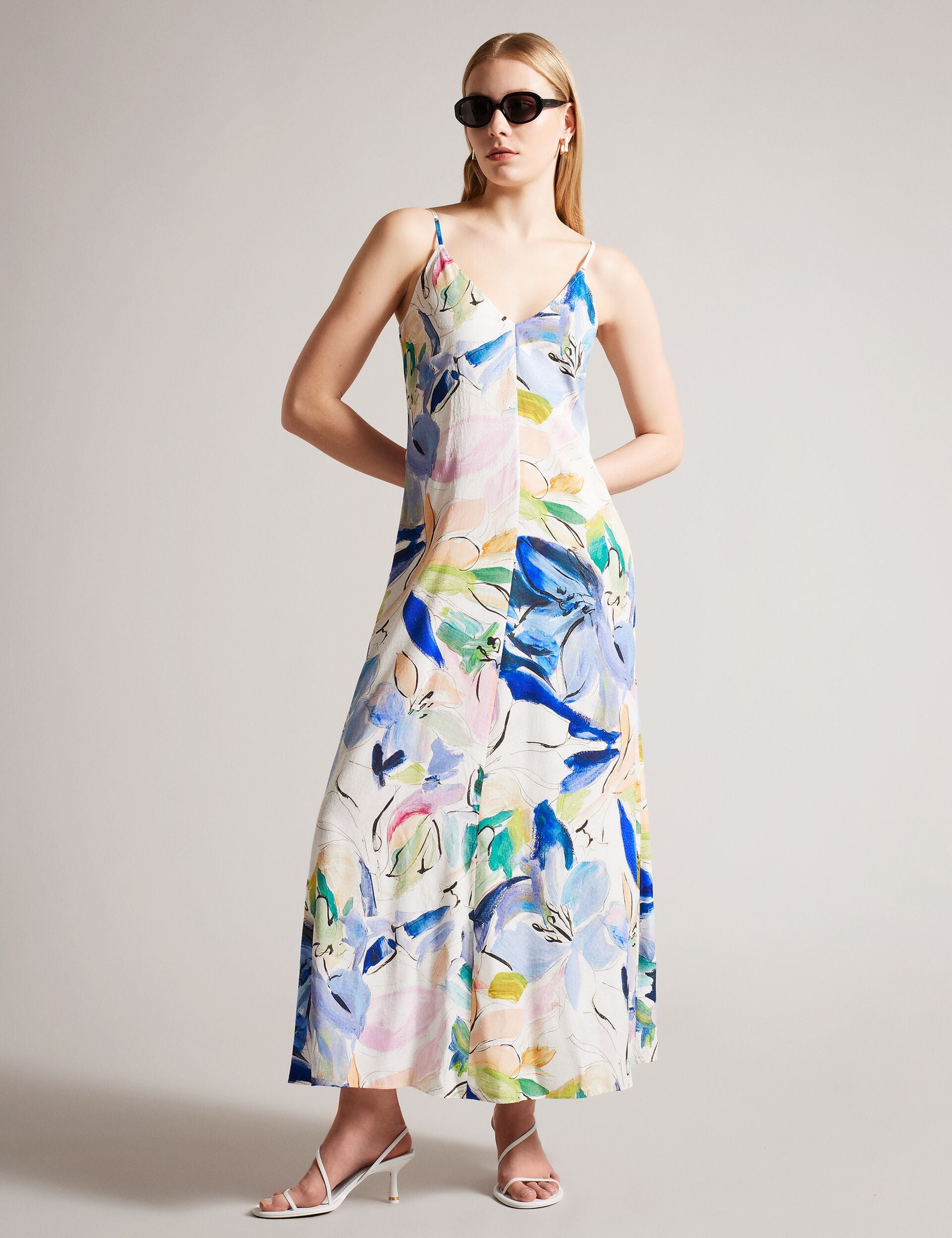 Make a statement in our stunning ASHHLIY dress, featuring a beautifully painted floral print that exudes elegance. The scooped V-neck and adjustable straps provide a flattering fit, while the cut-out back adds a subtle touch of allure.