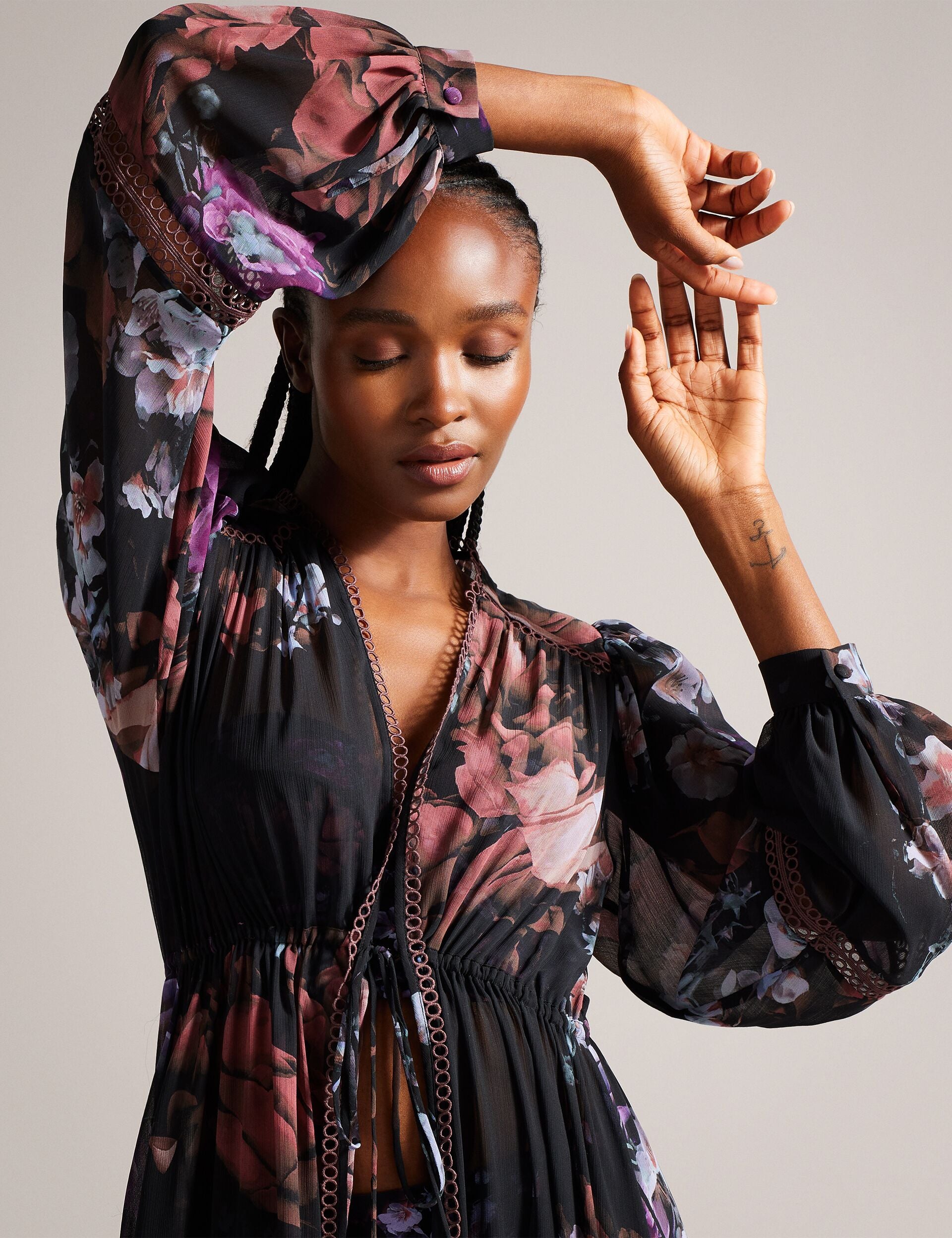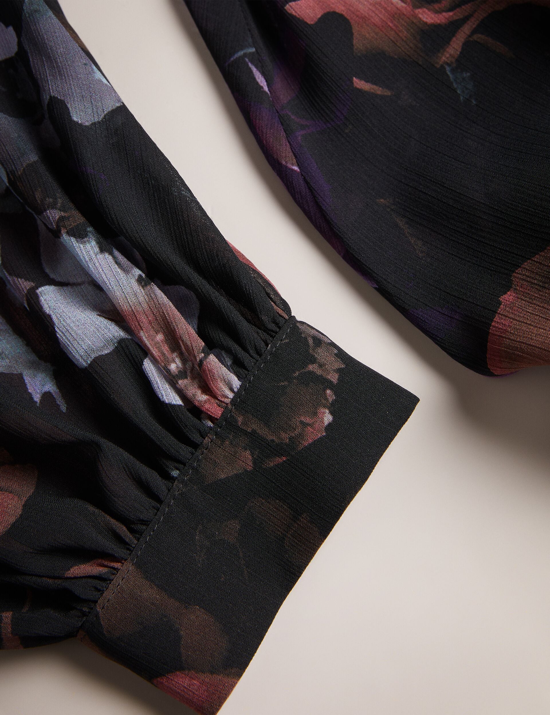 - Long blouson sleeves