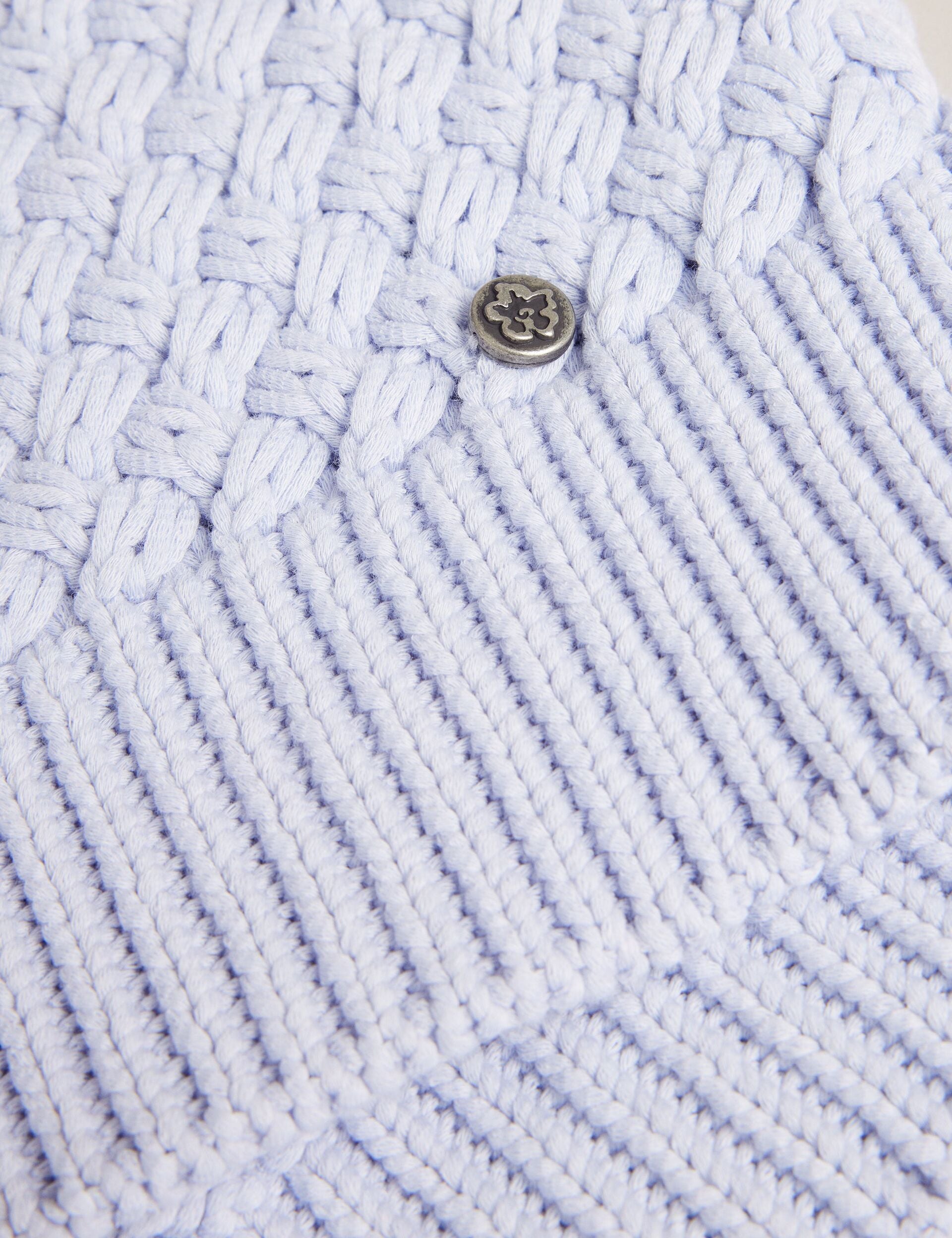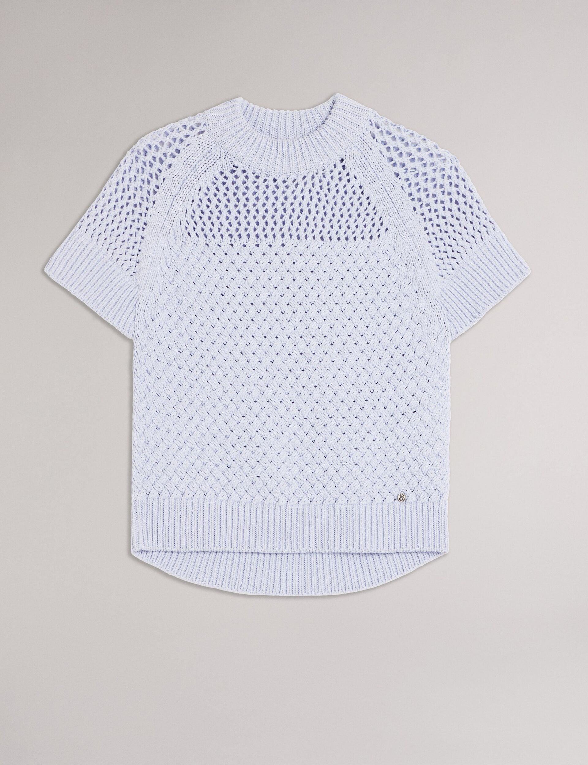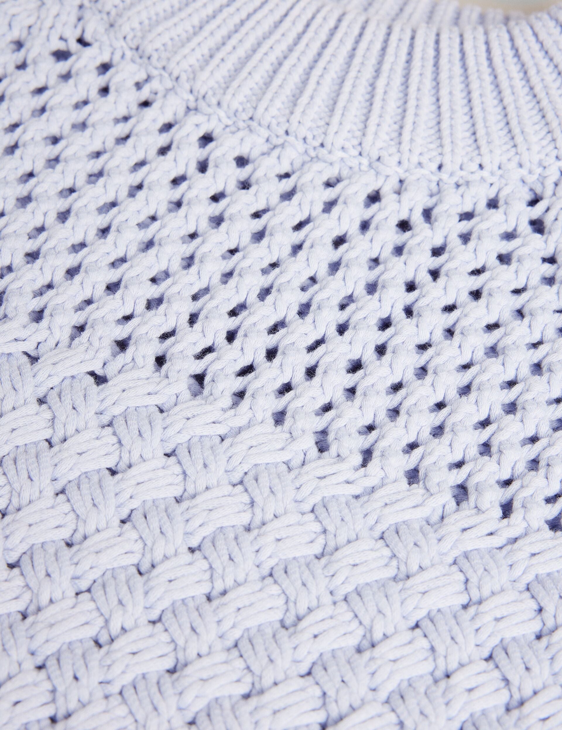 Textural sophistication meets effortless style in this intricate knitted piece. The distinctive basketweave pattern creates visual depth and tactile appeal, while the contemporary high neckline and short sleeves offer a modern silhouette. Perfect for transitional dressing, this versatile knit elevates both casual and smart-casual looks with its artisanal craftsmanship.