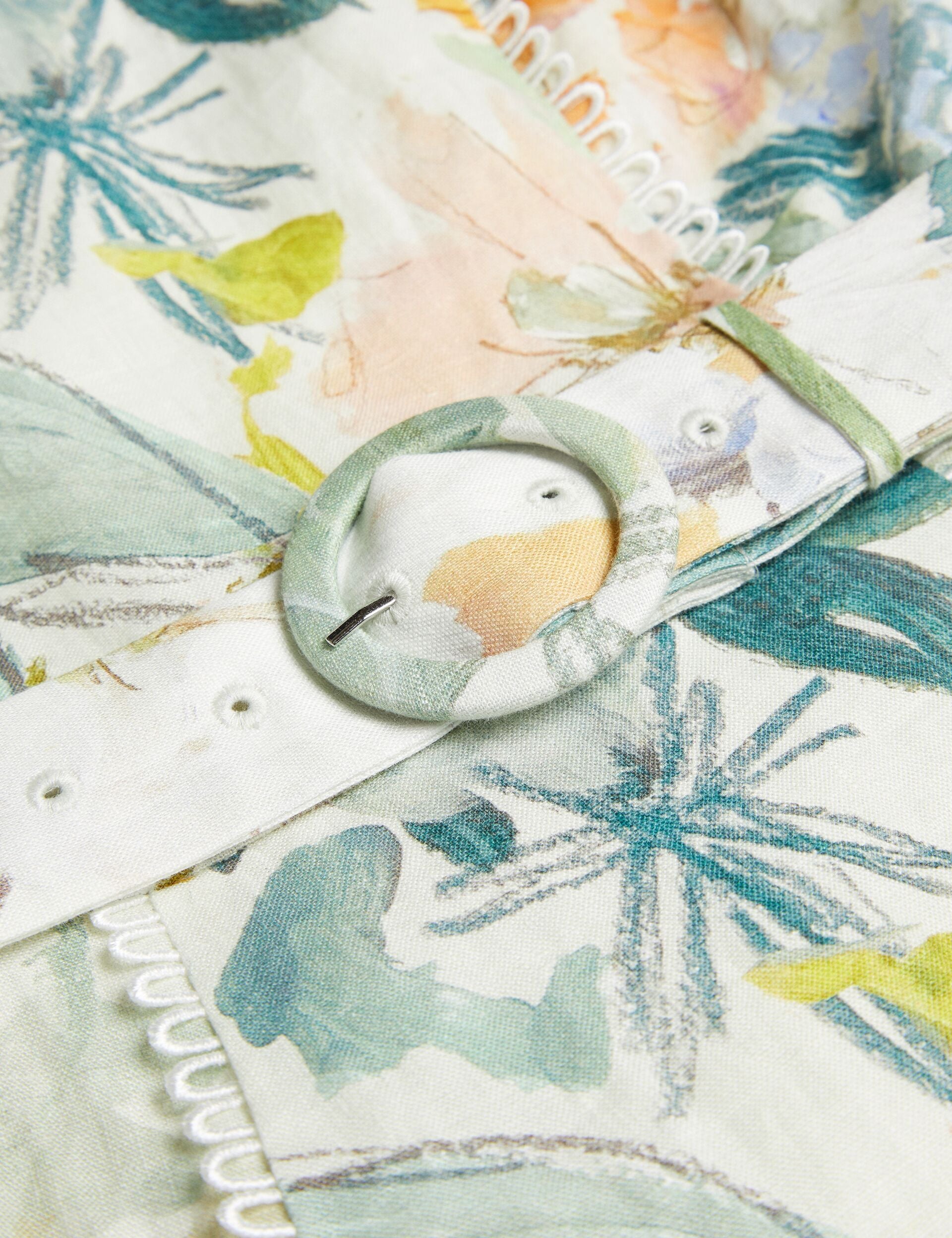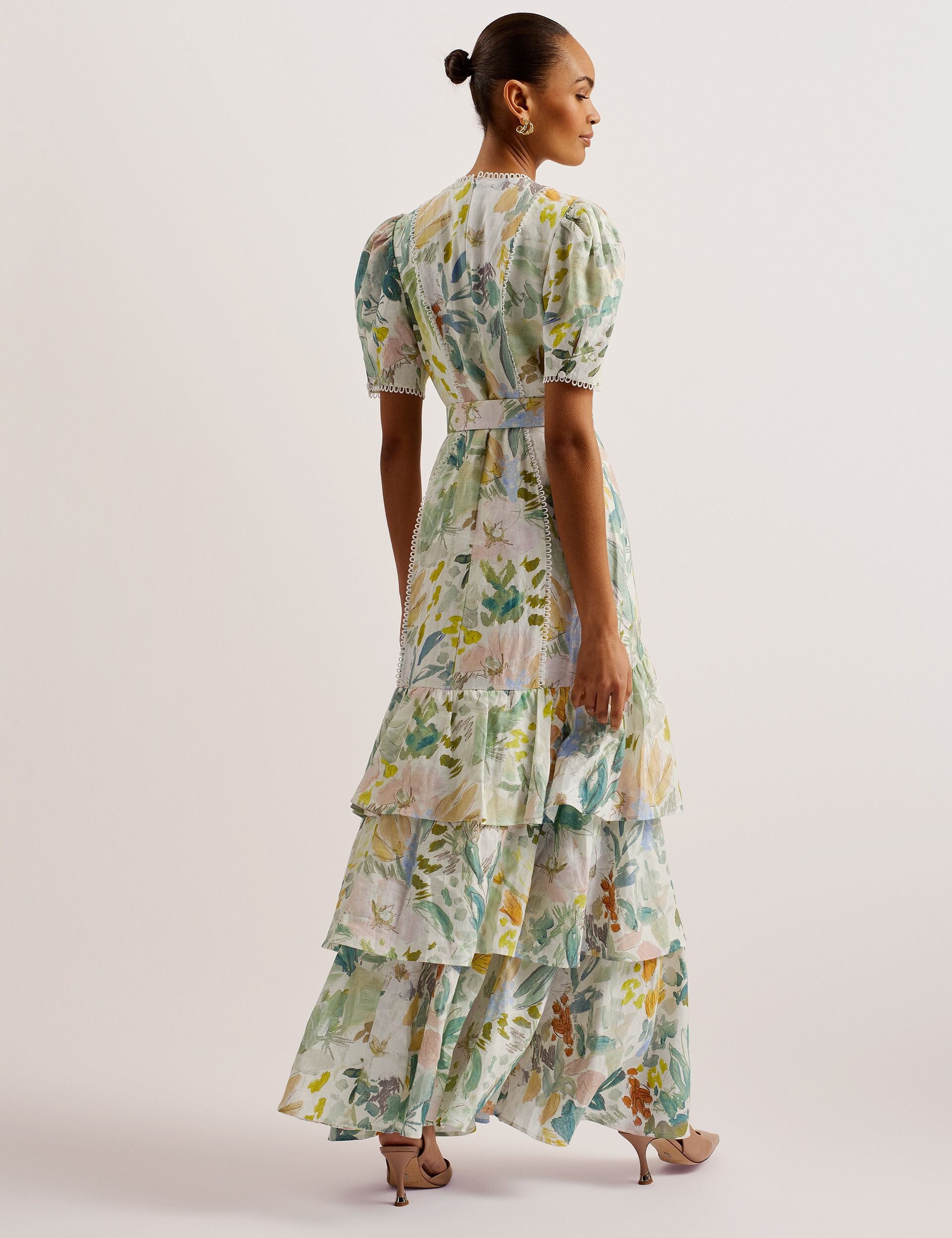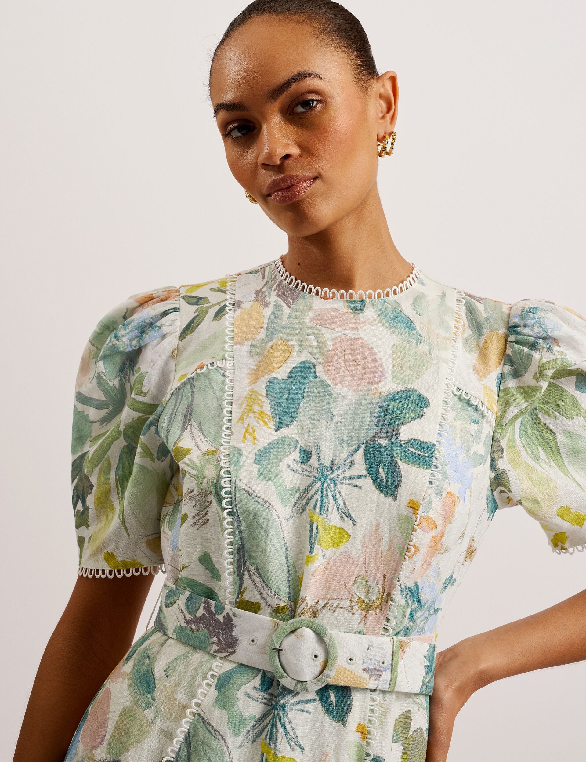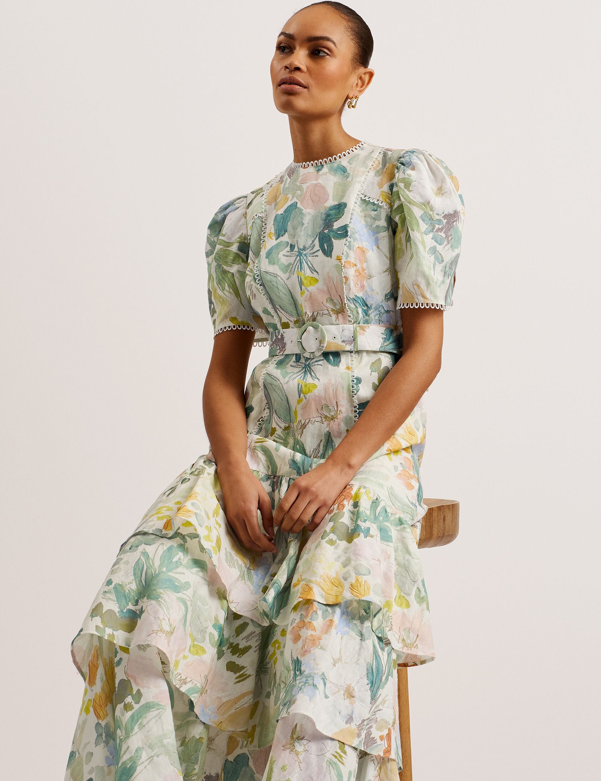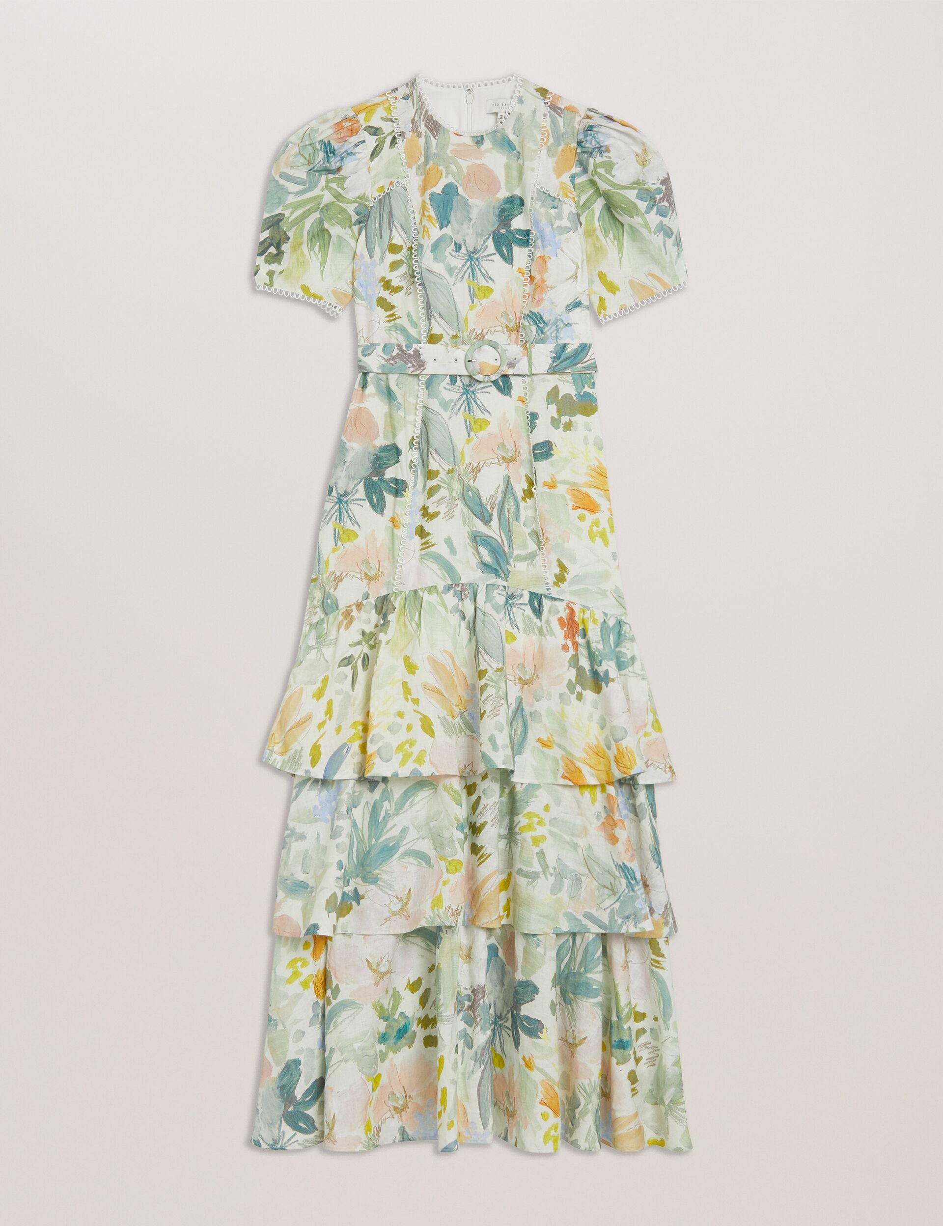 We're bringing retro charm to springtime with the DEVERO maxi dress. A painted floral design is printed all over the light linen material to perfectly capture the feel of the season, complemented by picot trims for that delicate detail. The matching belt will cinch you in at the waist, whilst the tiered skirt and puffed sleeves create volume in the right places.