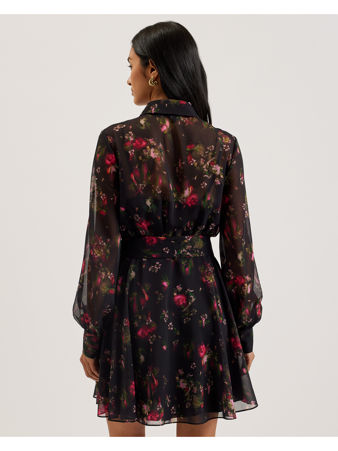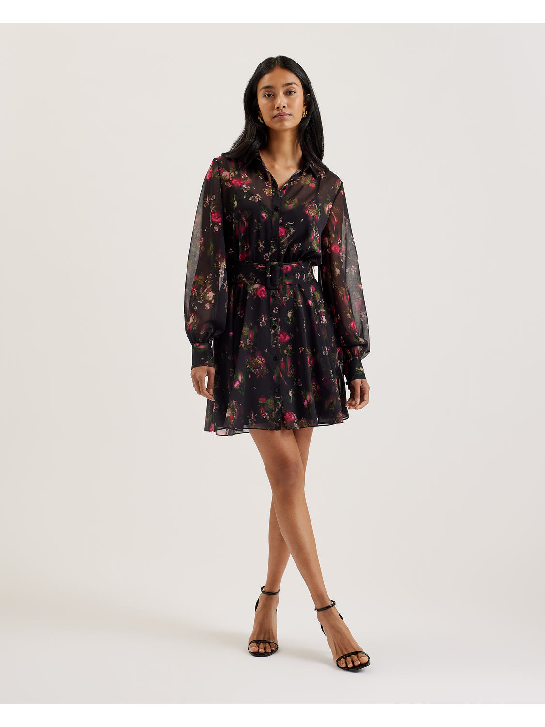 EBENE is a more feminine take on the classic shirt dress, featuring a delicate floral design printed onto a sheer chiffon fabric. A matching belt creates a flattering silhouette that feels fit to wear to the office or on special occasions.