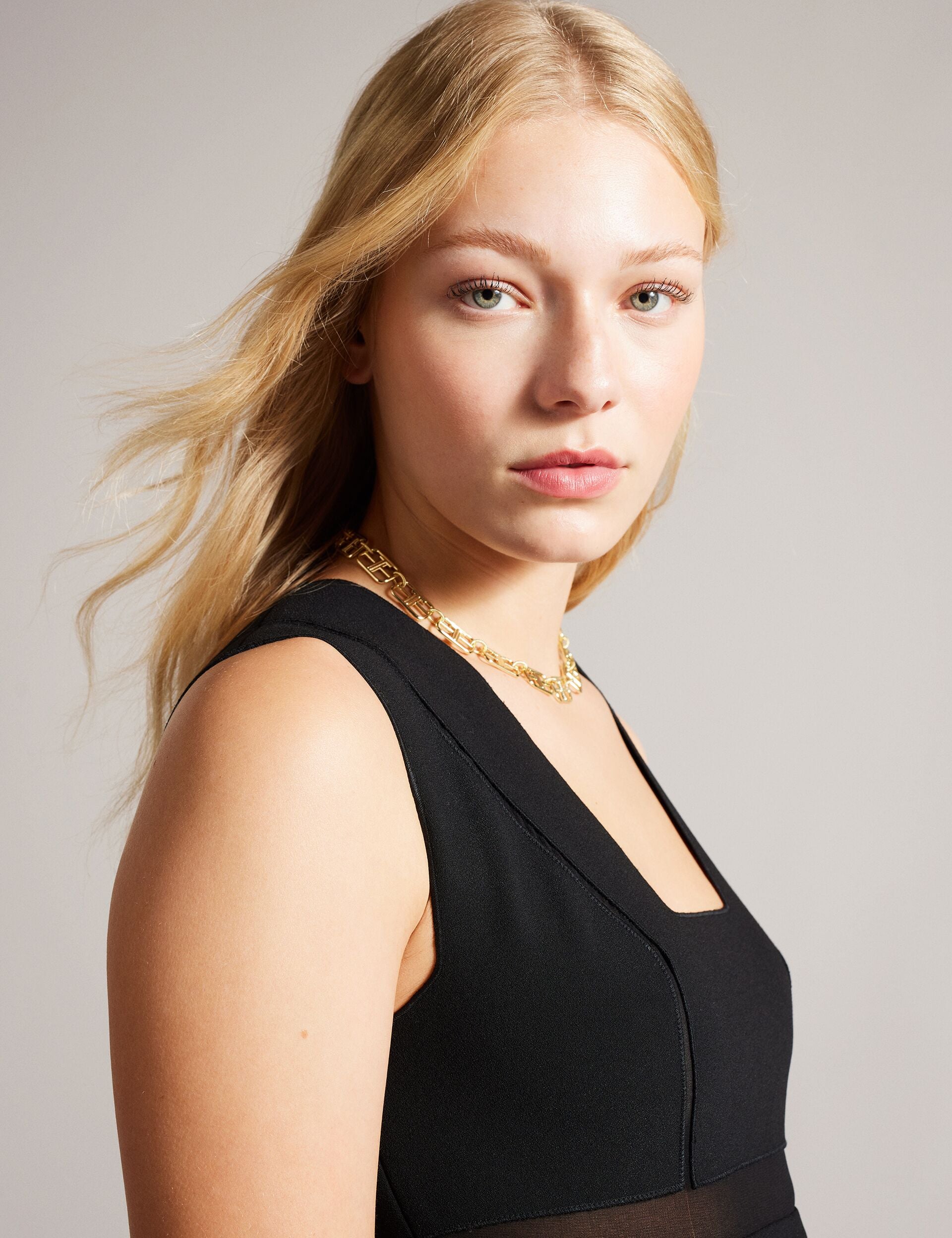 Our ELLINIA dress is a bold and modern silhouette that's perfect for making an entrance. It boasts a unique paneled design with delicate mesh inserts, adding a touch of edgy elegance to your look.