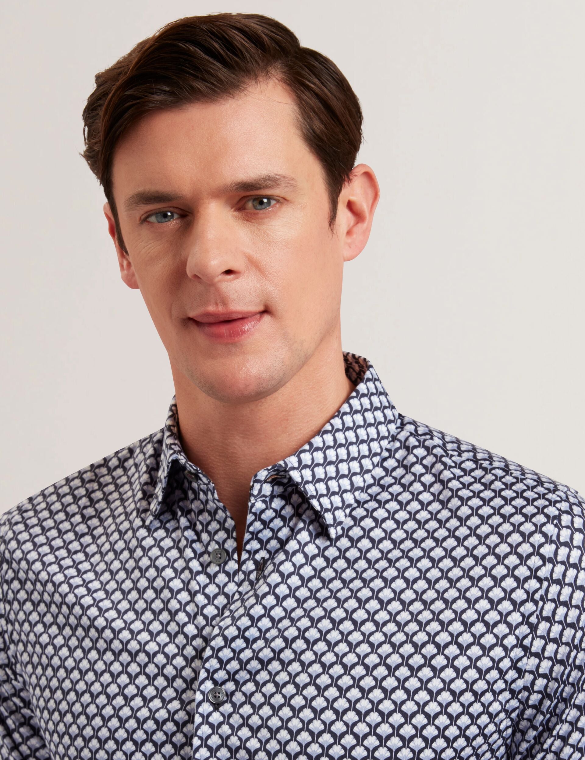 Elevate your smart-casual repertoire with this distinctive geometric print shirt that brings contemporary sophistication to your wardrobe. The intricate palm leaf-inspired geo pattern creates visual interest while maintaining versatility for both office and evening occasions. Pair it with tailored trousers for boardroom confidence or dark denim for relaxed weekend style.