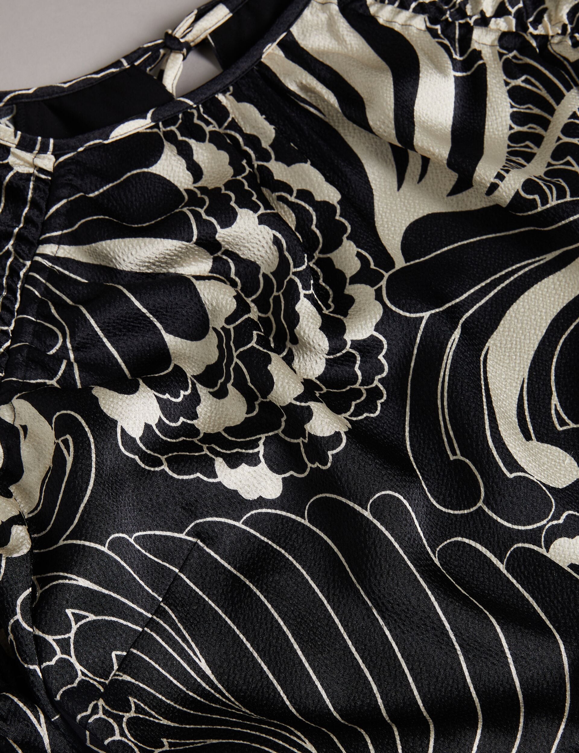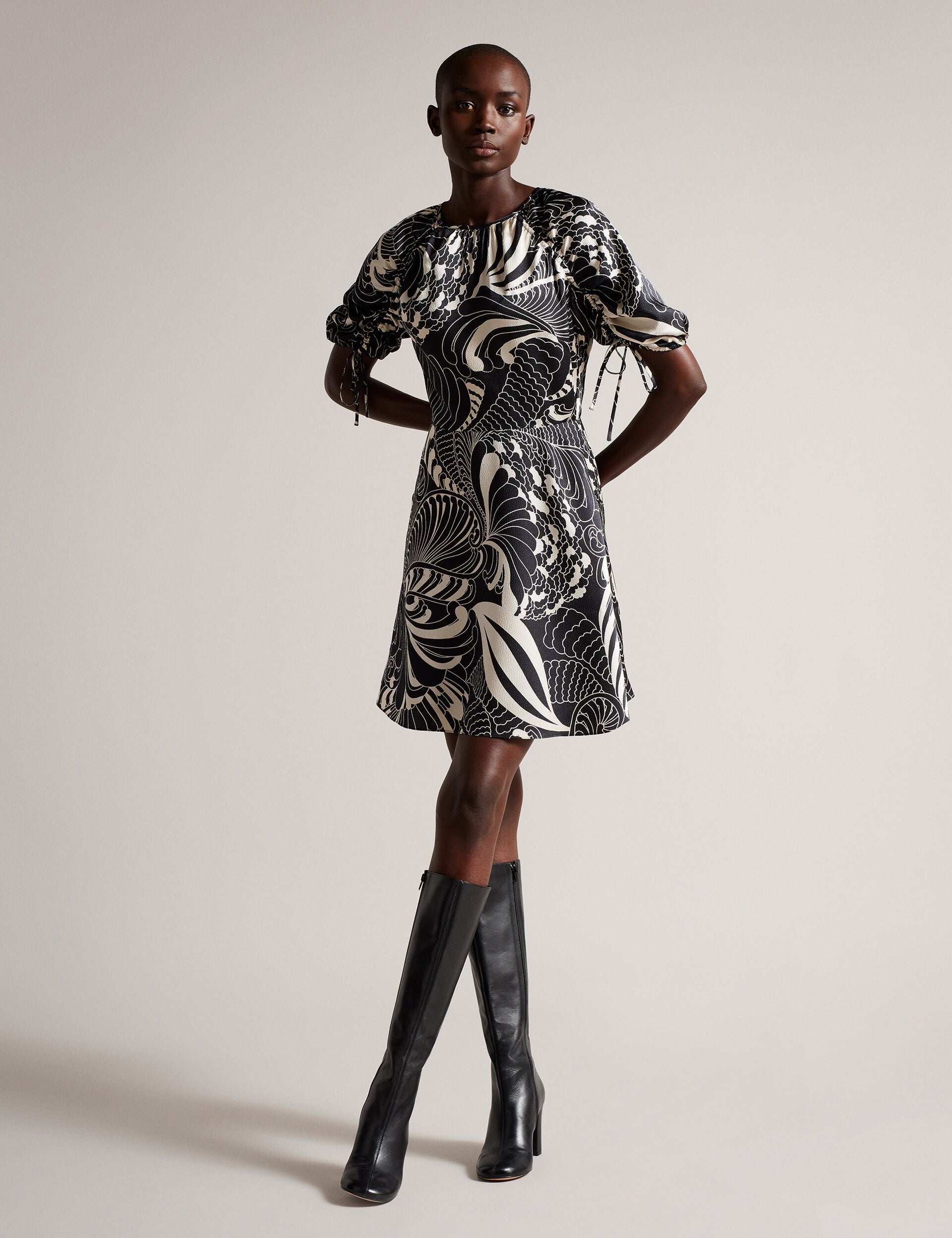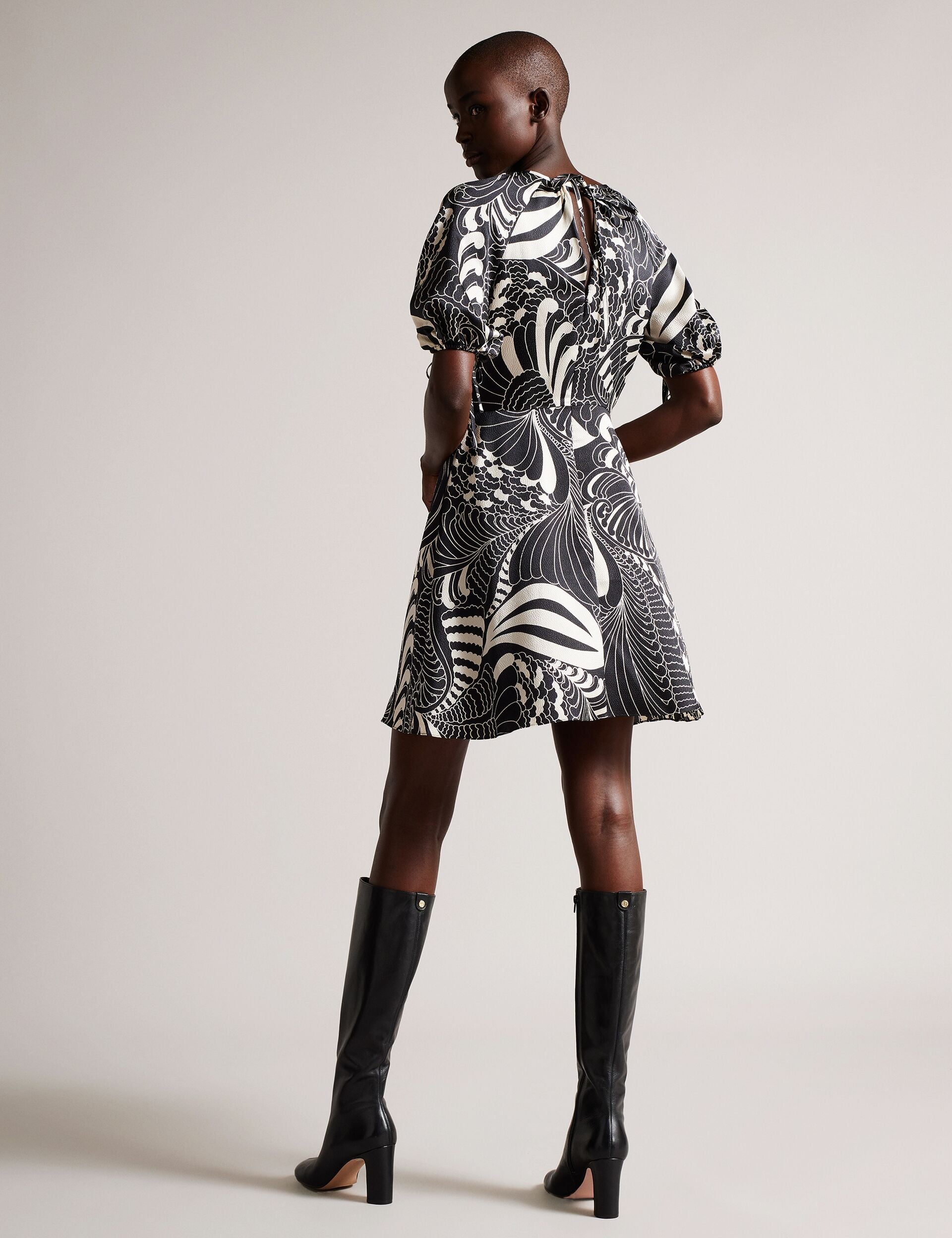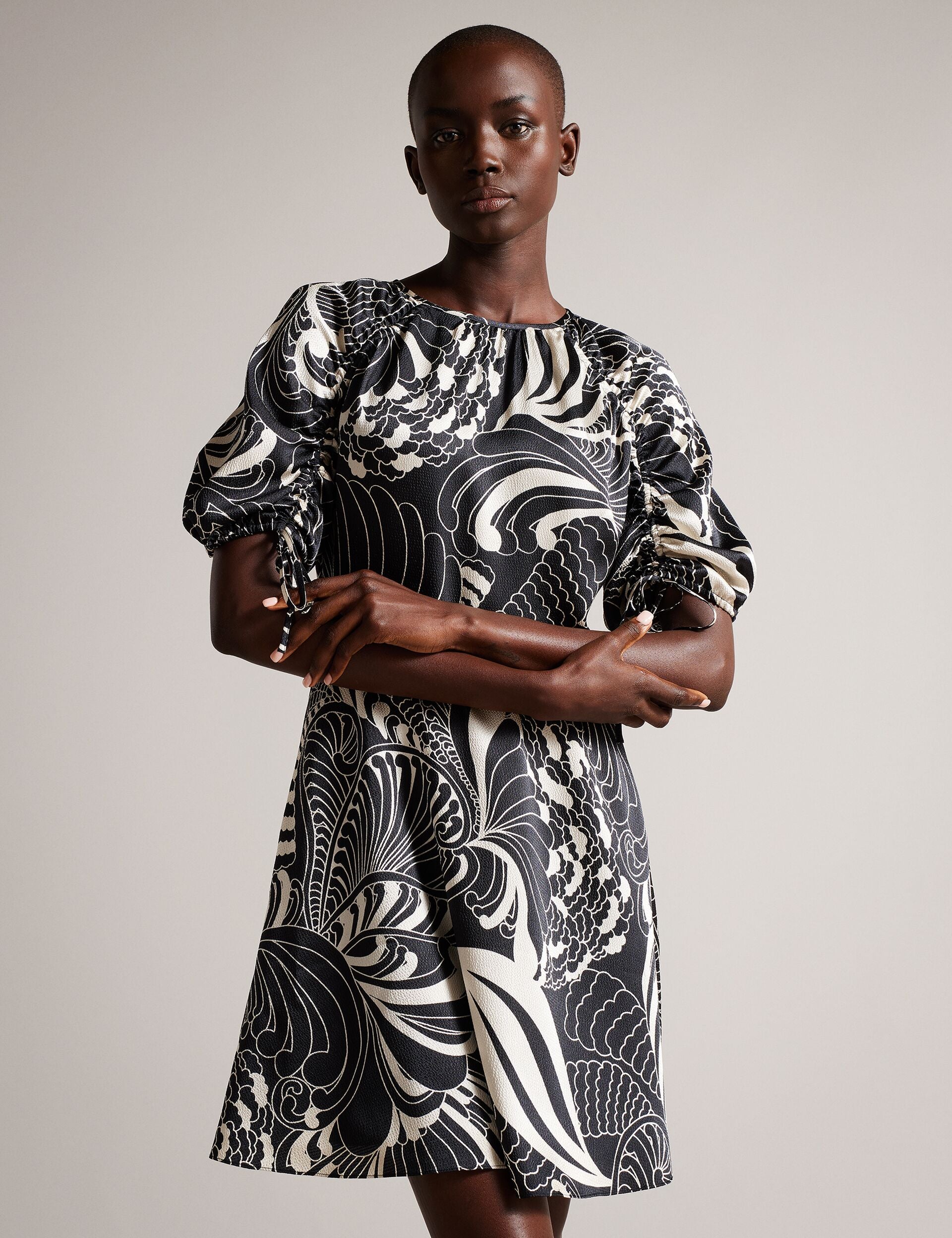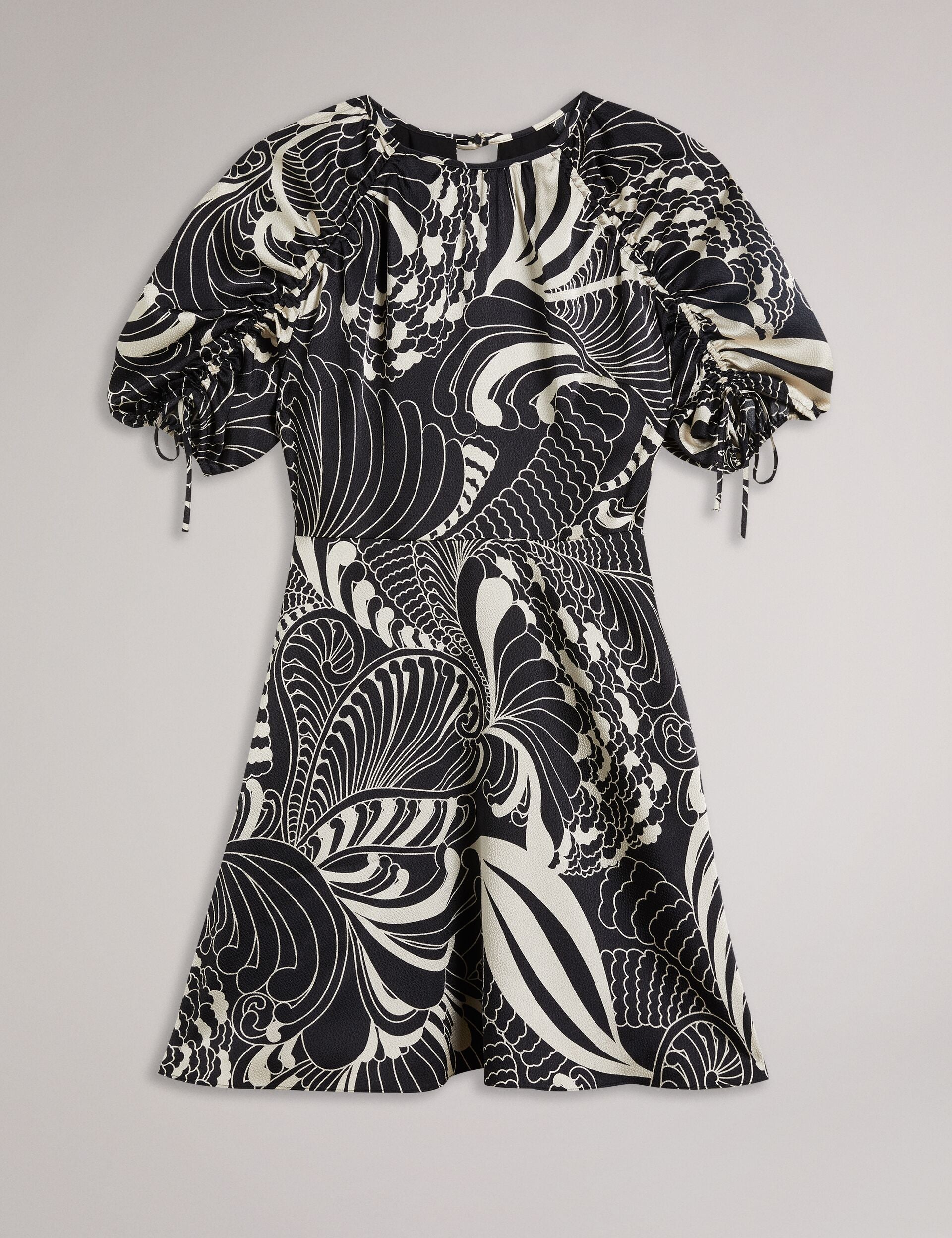 Liven up your wardrobe with the retro inspired FARIDDA dress. With its stunning retro swirl print, tie-up back and beautiful ruched sleeves, the only question is: will you wear it to lunch or to a party?