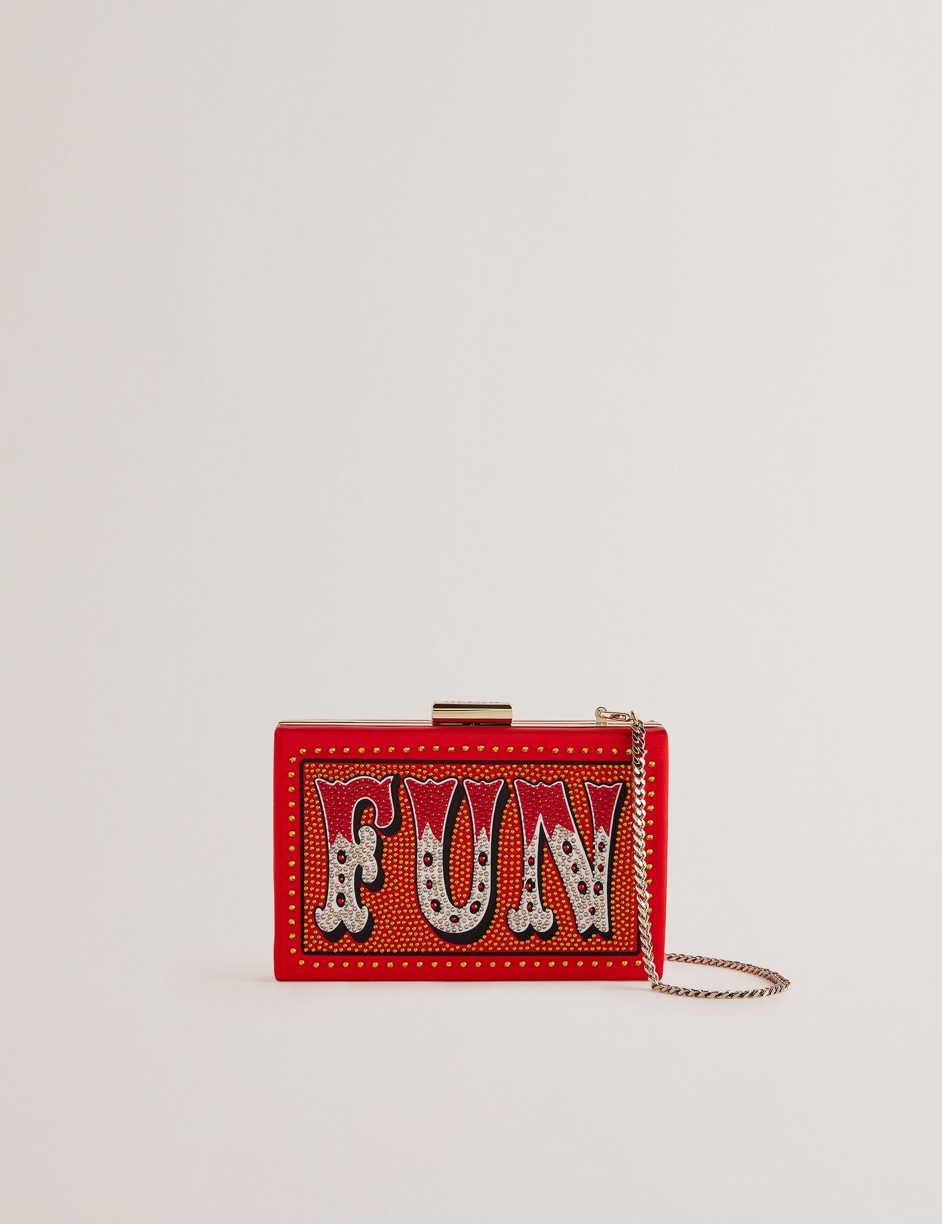 FUNIA is putting the fun back in fashion. This satin clutch bag is printed with the word 'Fun' in graphic lettering and embellished with diamantes for a sparkly finish. Its box shape is bang on trend and easy to carry, plus it comes with a removable shoulder strap for versatile wearing. Pair it with a sparkly dress to get the party started.