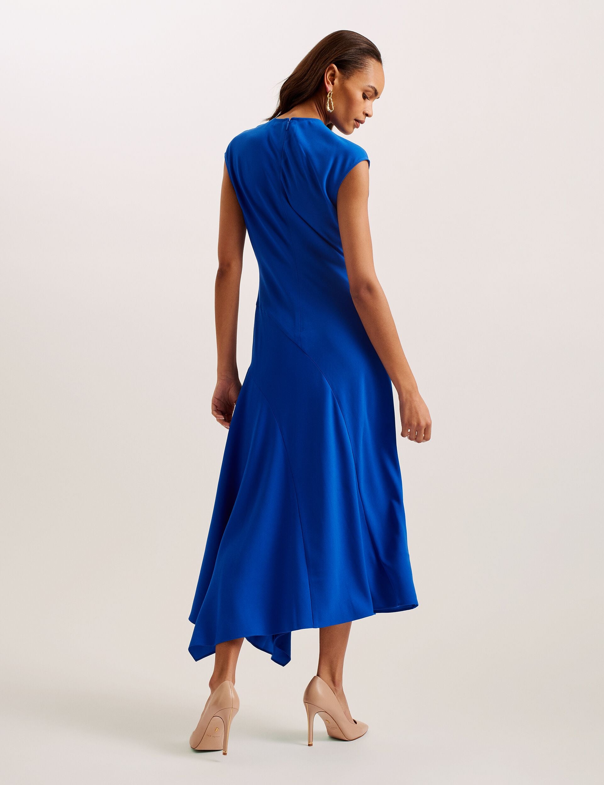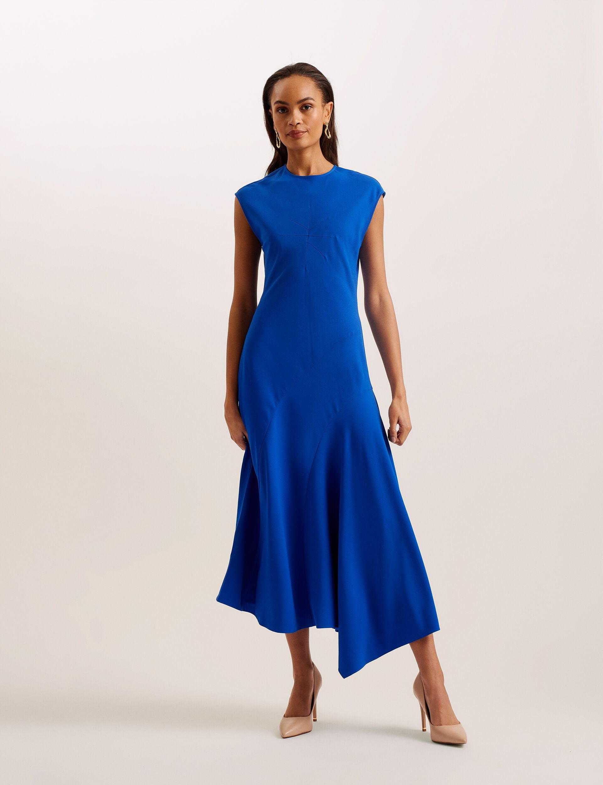 Slip into something elegant with the ISPARTA dress. The midi length and A-line skirt cut a flattering silhouette, whilst the asymmetric waterfall hem creates graceful movement as you walk. This sleek satin number boasts chic cap sleeves on top, and curved panel detailing across the skirt.