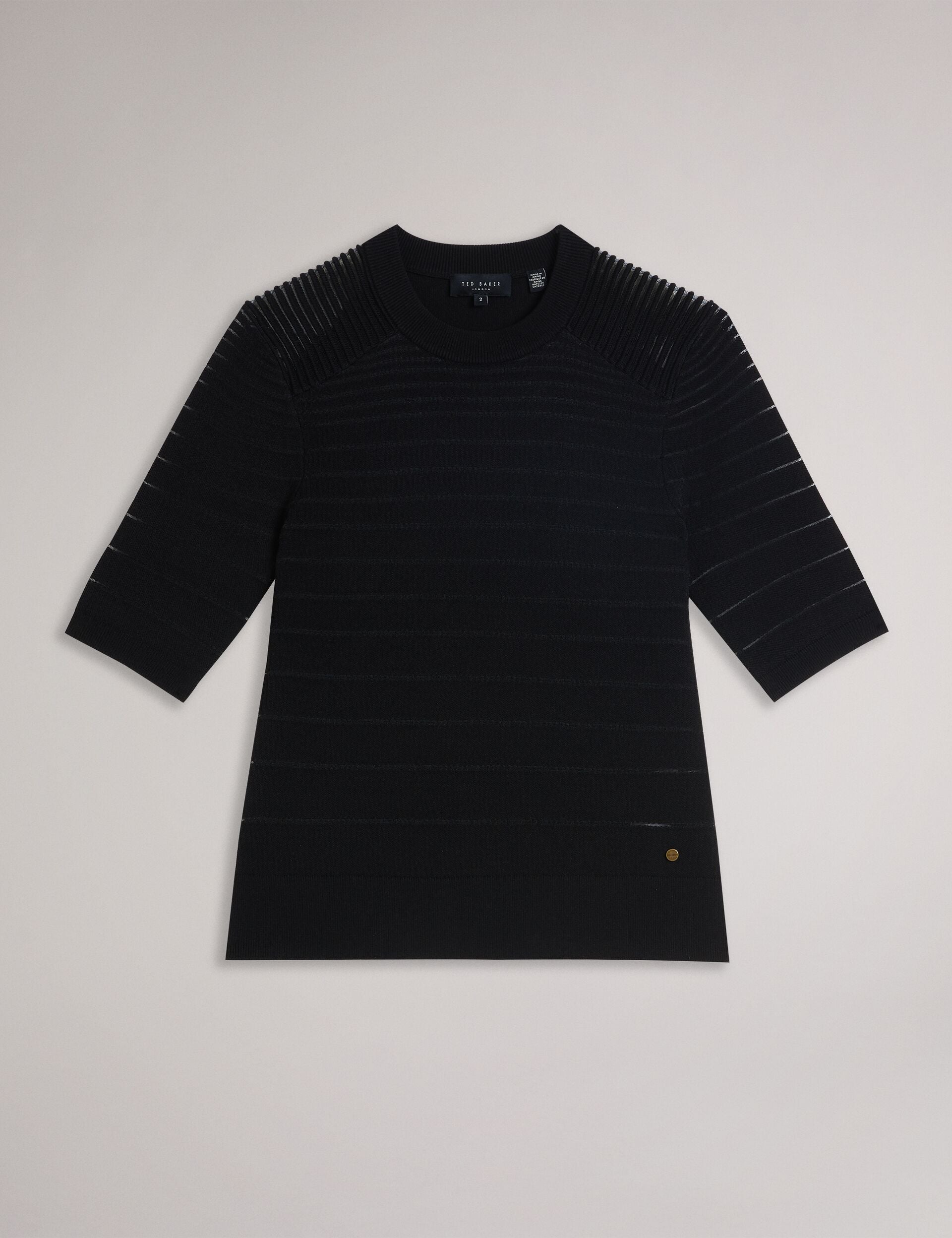 Embrace the fusion of style and comfort with KAHLEN. Designed with modern details, this knitted top effortlessly blends comfort and sophistication, elevating your everyday style to new heights. The crew neck and slim fit ensure a classic and versatile look, while the cut-out striped pattern adds a contemporary twist to this essential piece.