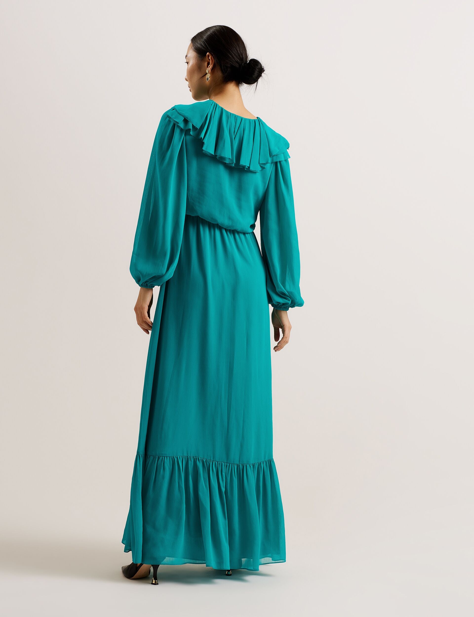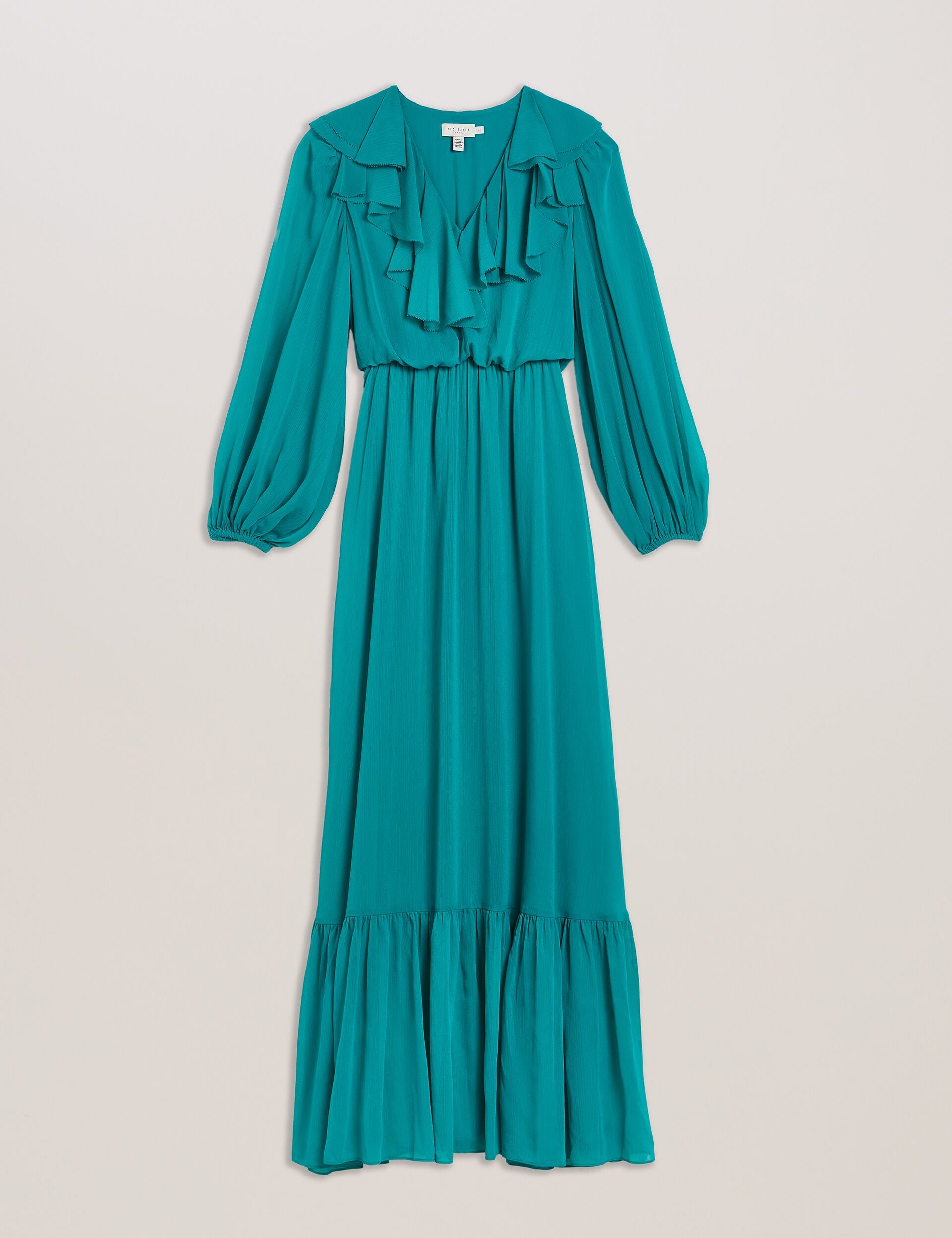 This maxi dress features layers of style with an oversized ruffle trim around its V neckline, and a gathered tier at the hem. Sheer long sleeves are elasticated at the cuff to add volume, and it's also fitted at the waist for a flattering silhouette. Wear KEINA with flat pumps or dressy court heels for versatile looks with minimal effort.