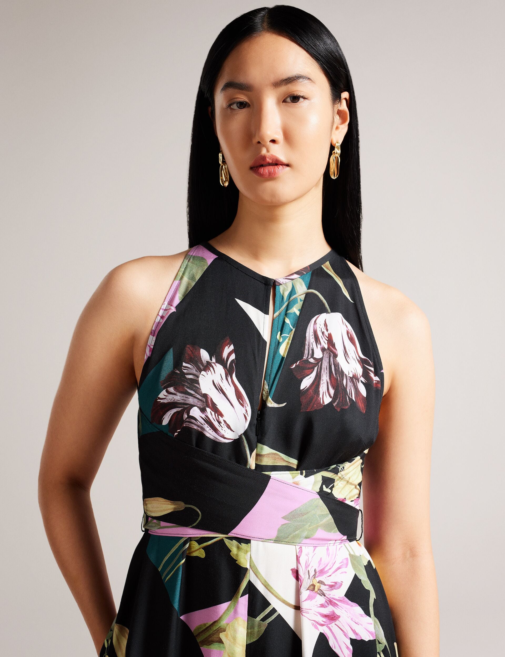 With a halter neck and sleeveless design, the MAUDEE jumpsuit perfect for those warm summer days. Its wide leg cut creates a flowing silhouette, while the waist tie cinches in your figure for a flattering fit. Our exclusive spliced floral print levels up the piece for an all-in-one look you can take from the office to happy hour.