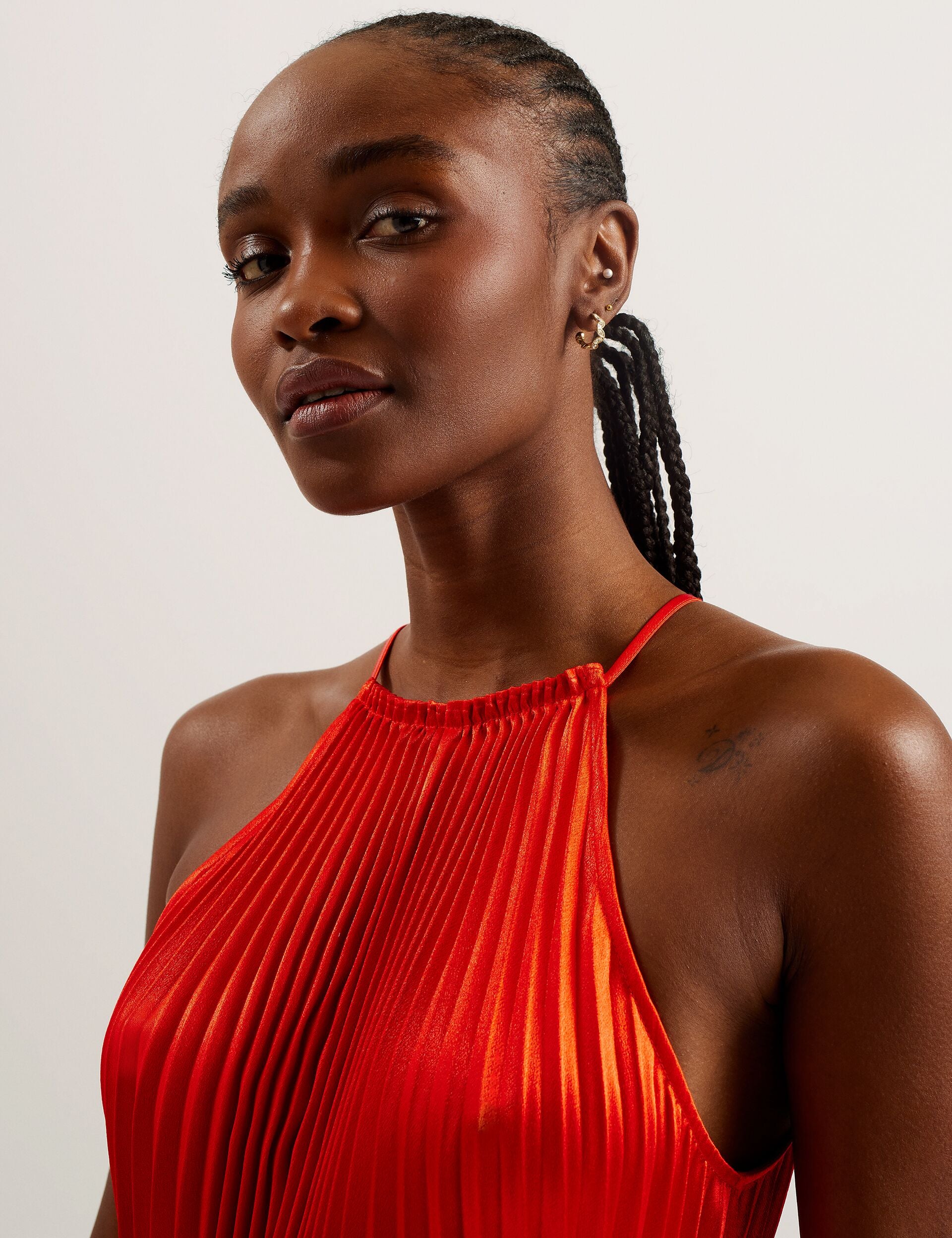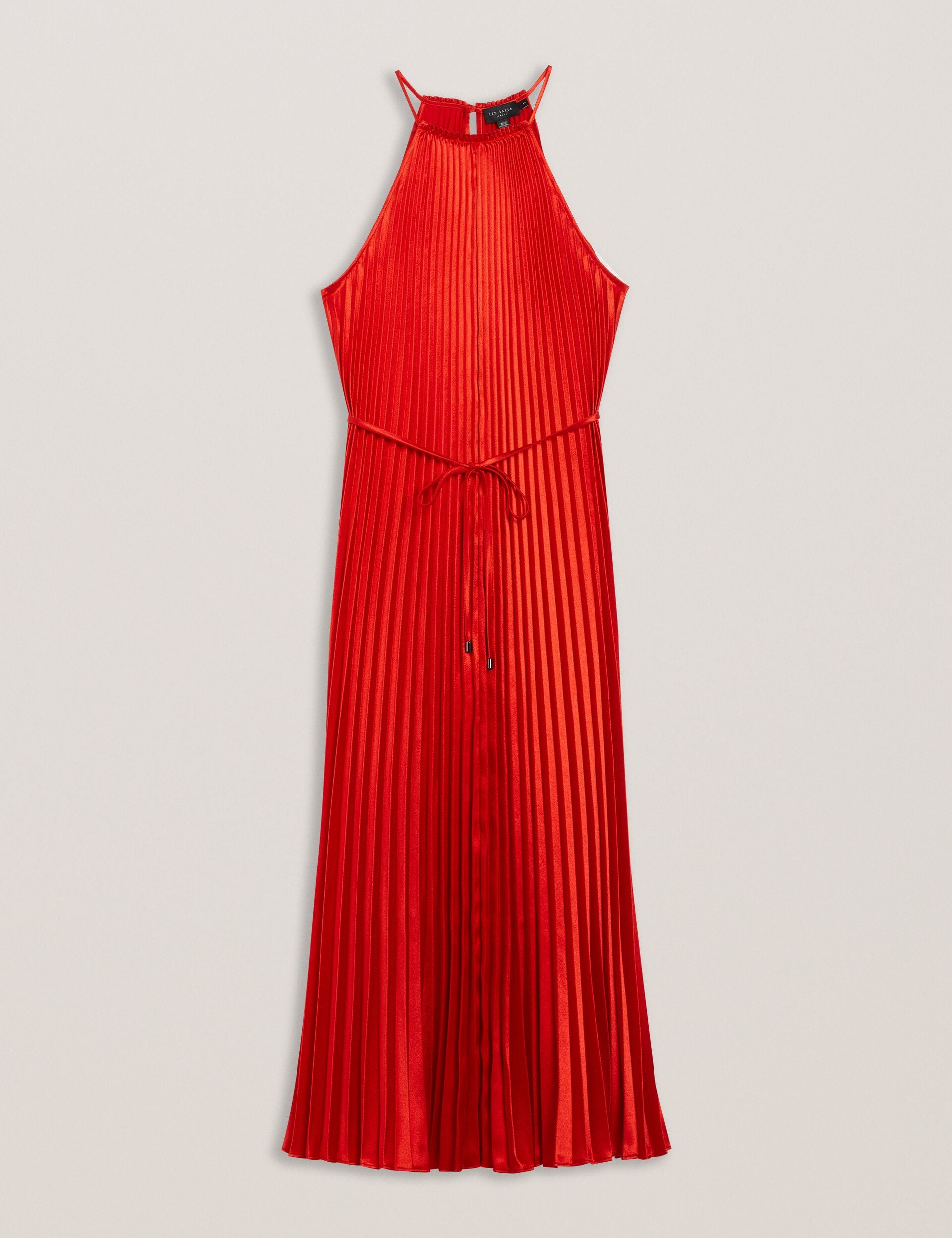 Searching for a glamorous gown? Look no further than MELIKE. Bringing together a pleated design, satin finish and a halter neck, we've created a dress that's sure to shine under those party lights. Its flowy finish is cinched at the waist with a tie belt, making it the perfect dance partner.