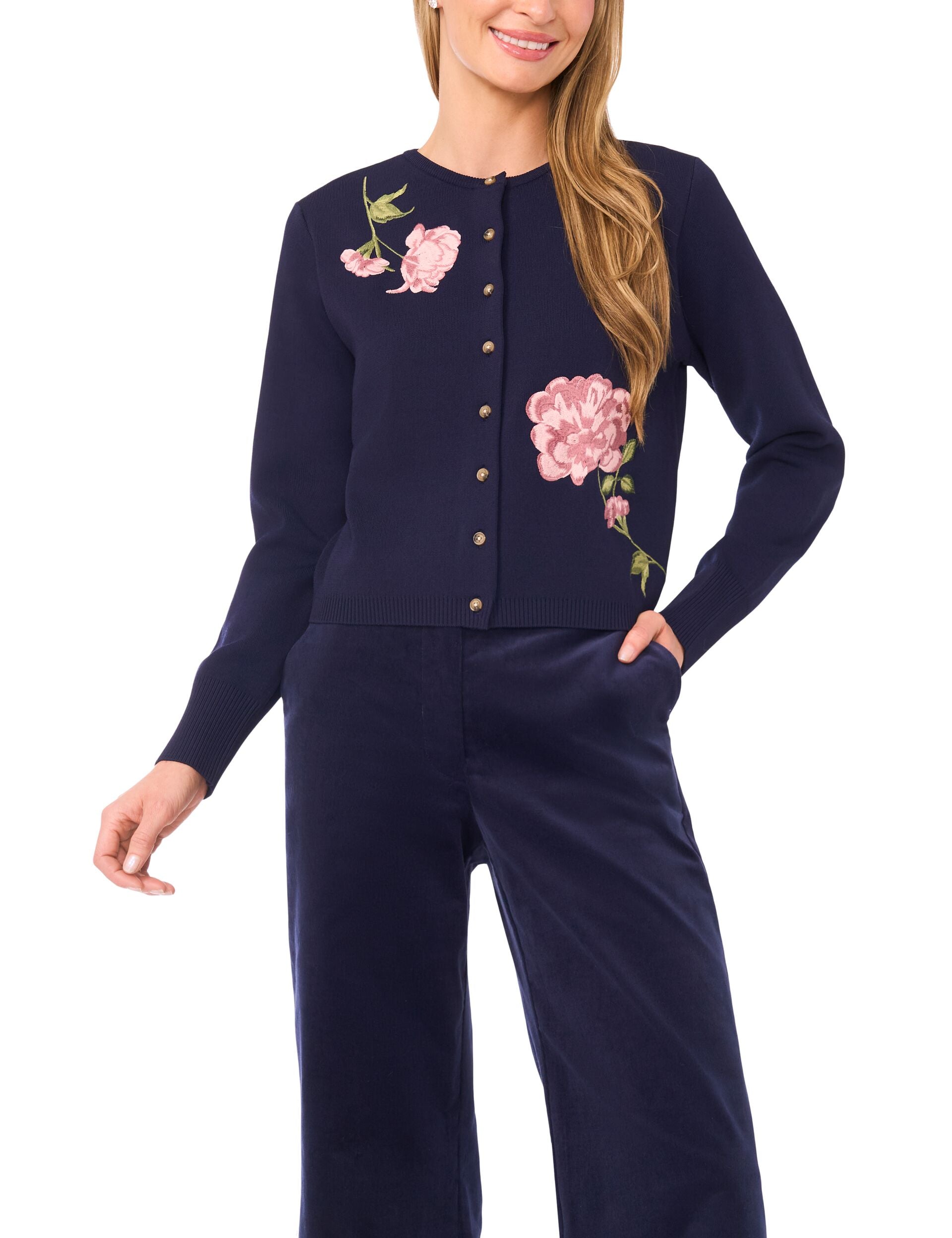 Delicately detailed and full of charm, this Crew Neck Cardigan features embroidered flower patches that bring a whimsical, feminine touch to a classic silhouette. Softly knit with a timeless crew neckline, it’s the perfect layer to add warmth and a hint of floral elegance to any look.