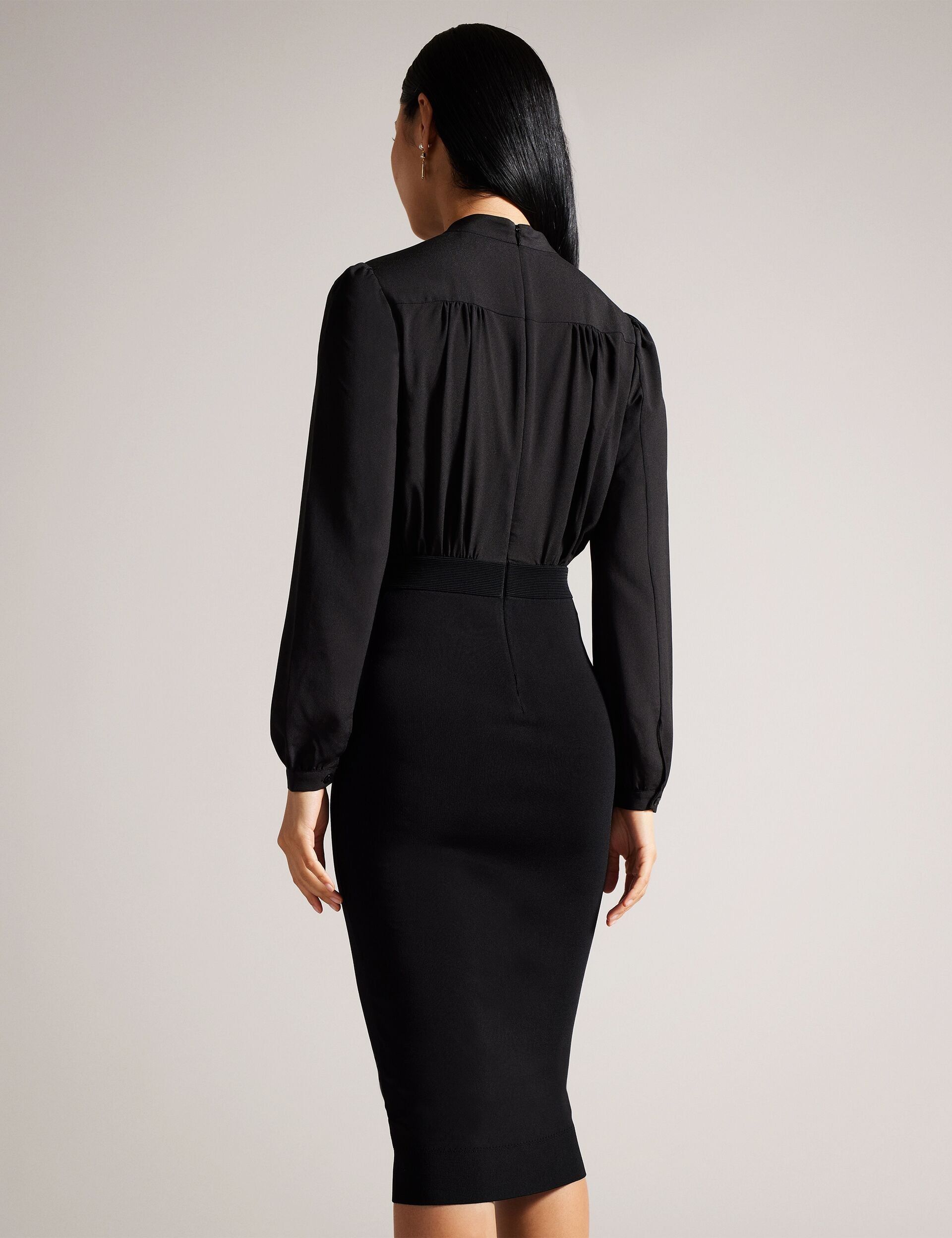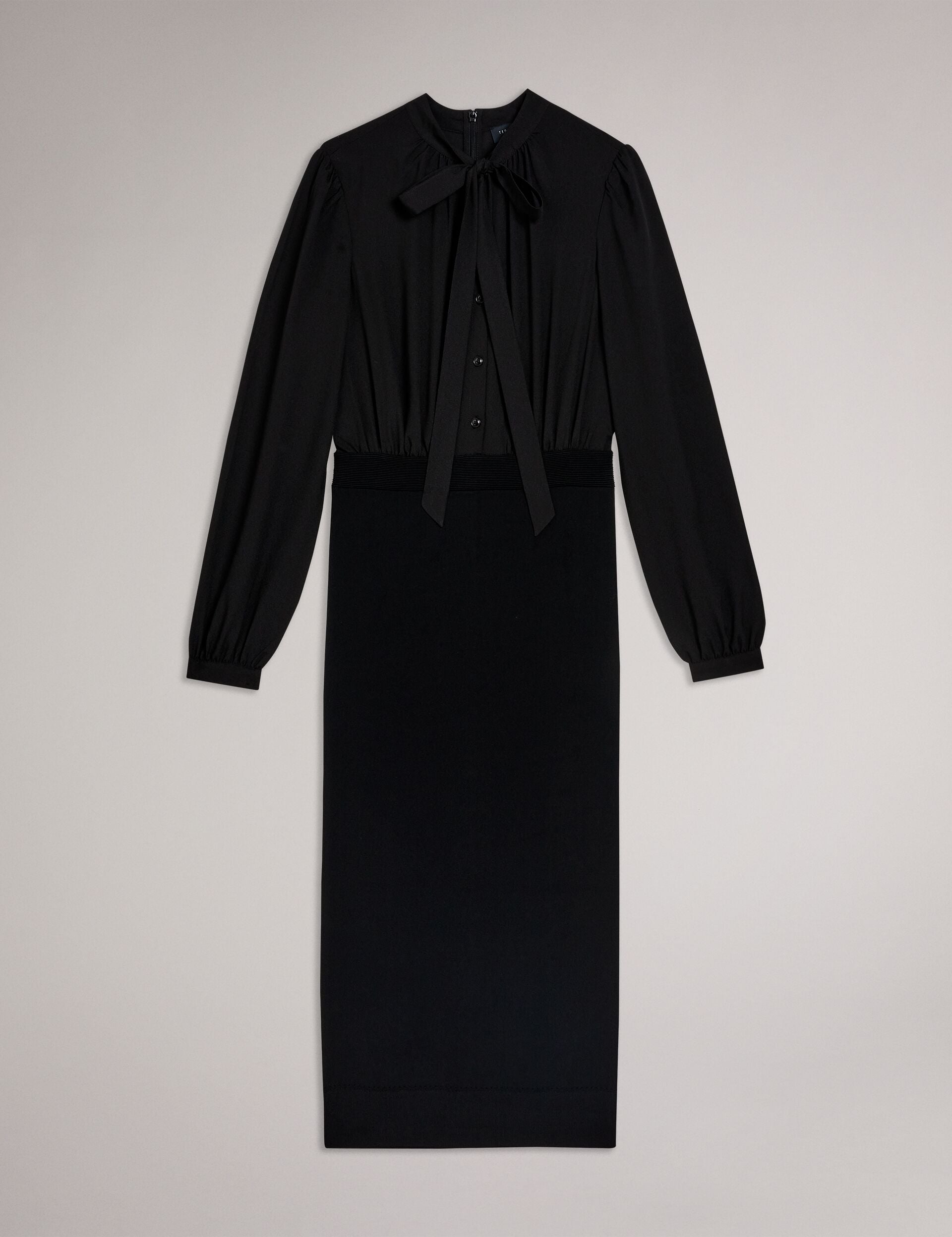 Featuring a knitted pencil skirt and a chic shirt bodice, this dress effortlessly blends sophistication and comfort. MERSEA's long sleeves and stand collar add a touch of classic charm, while the button-up front and neck tie create a look that's both versatile and stylish.