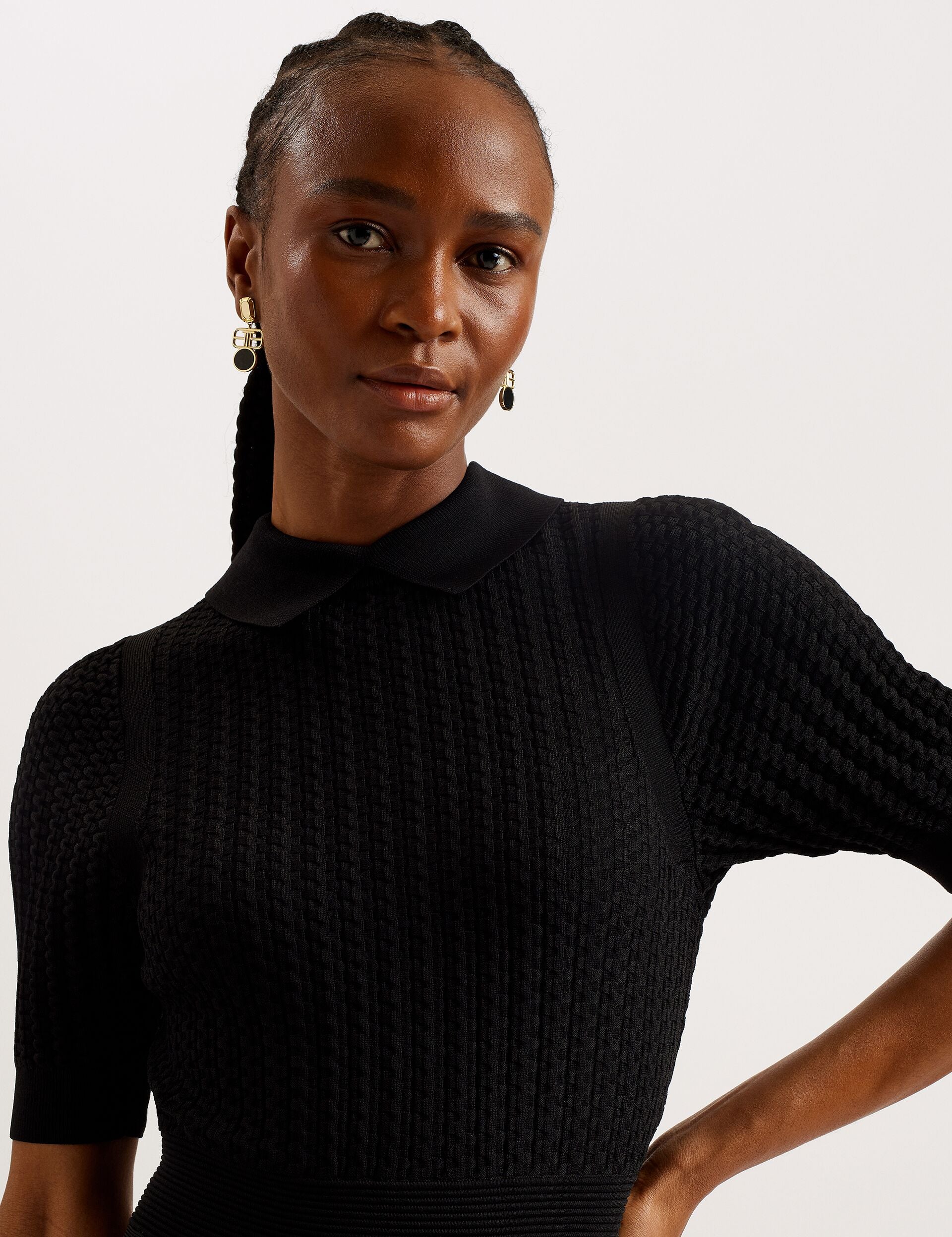With its collared neckline and short puffed sleeves, this mini skater dress strikes the perfect balance between smart and sweet. Made from a flattering knitted fabric and finished with a textured bodice, MIIAAA will be your go-to piece for office days this season.