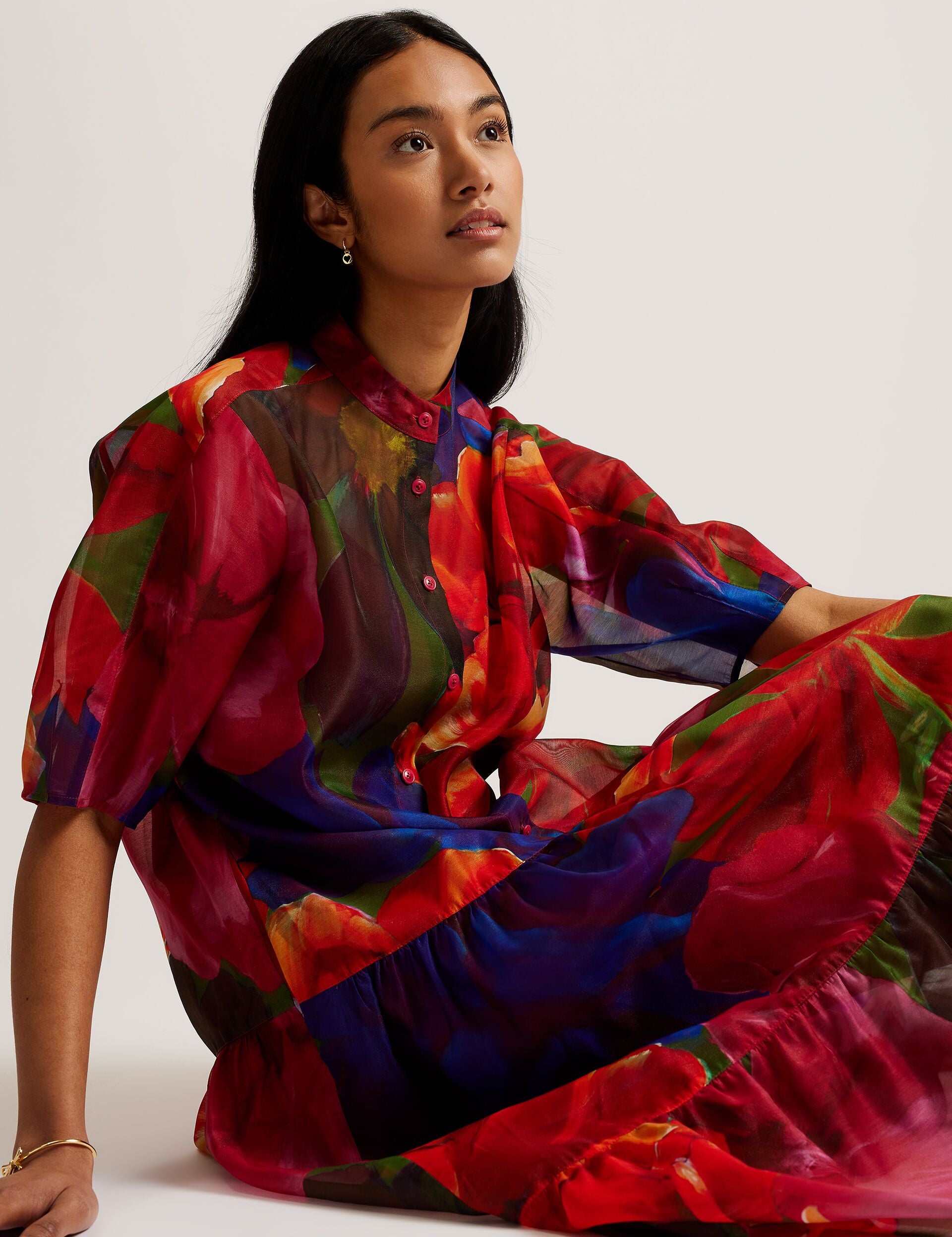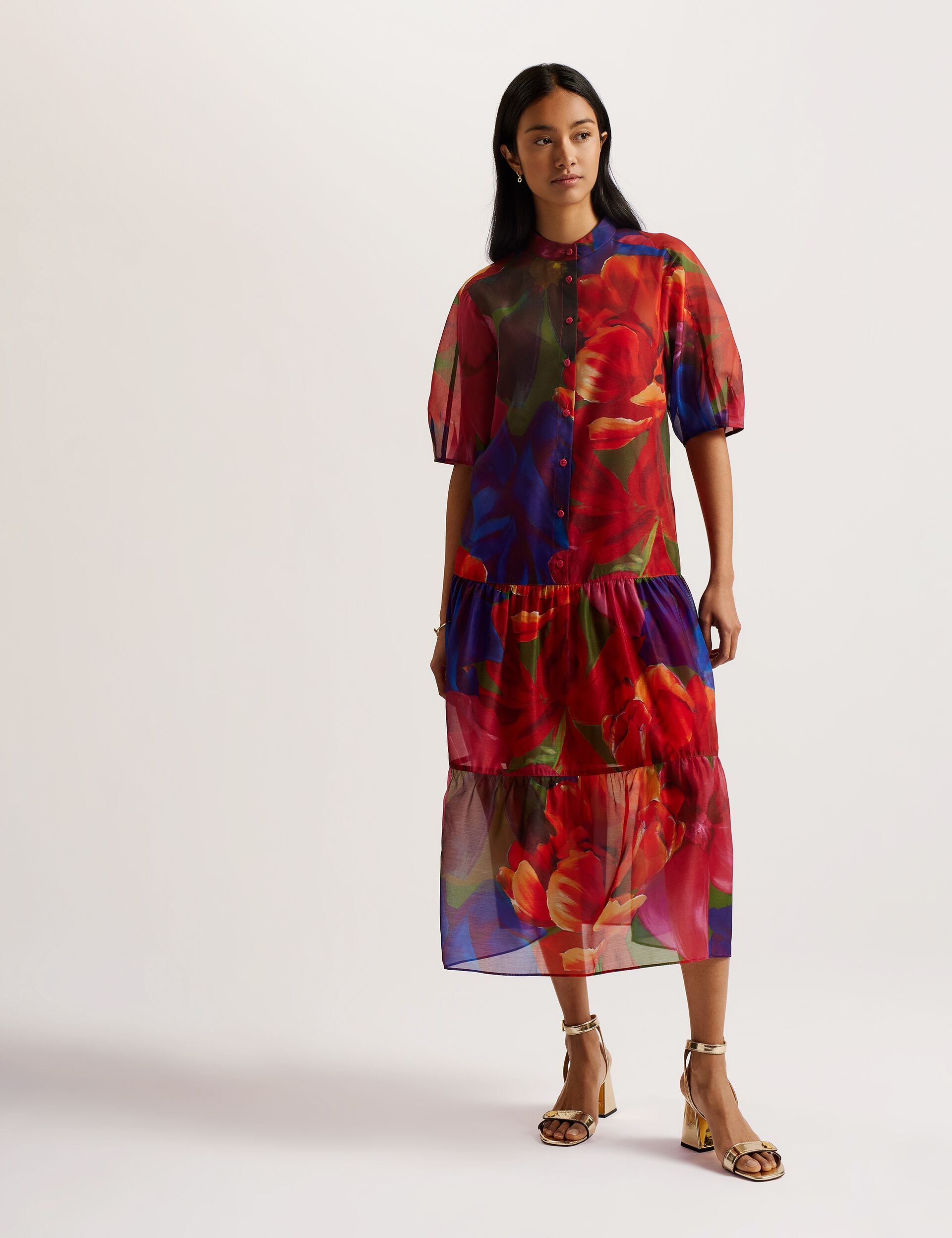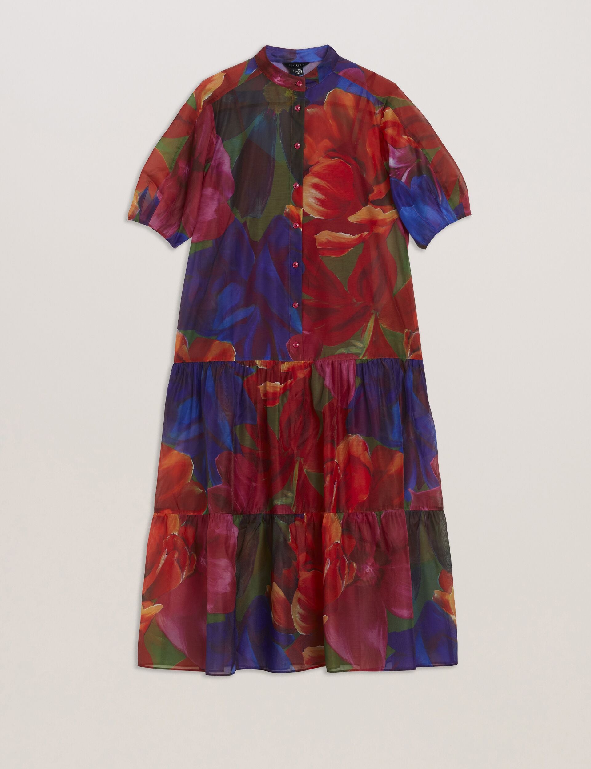 Step into the spotlight with MIRU, our short sleeve button-front dress, featuring a chic mandarin collar and a playful tiered skirt. Drenched in a vibrant floral pattern of vivid reds and blues, this dress brings energy to any occasion. Perfect for twirling through your day, this is one for the bold, the bright, and the beautifully confident. Because why settle for ordinary when you can bloom in full color?