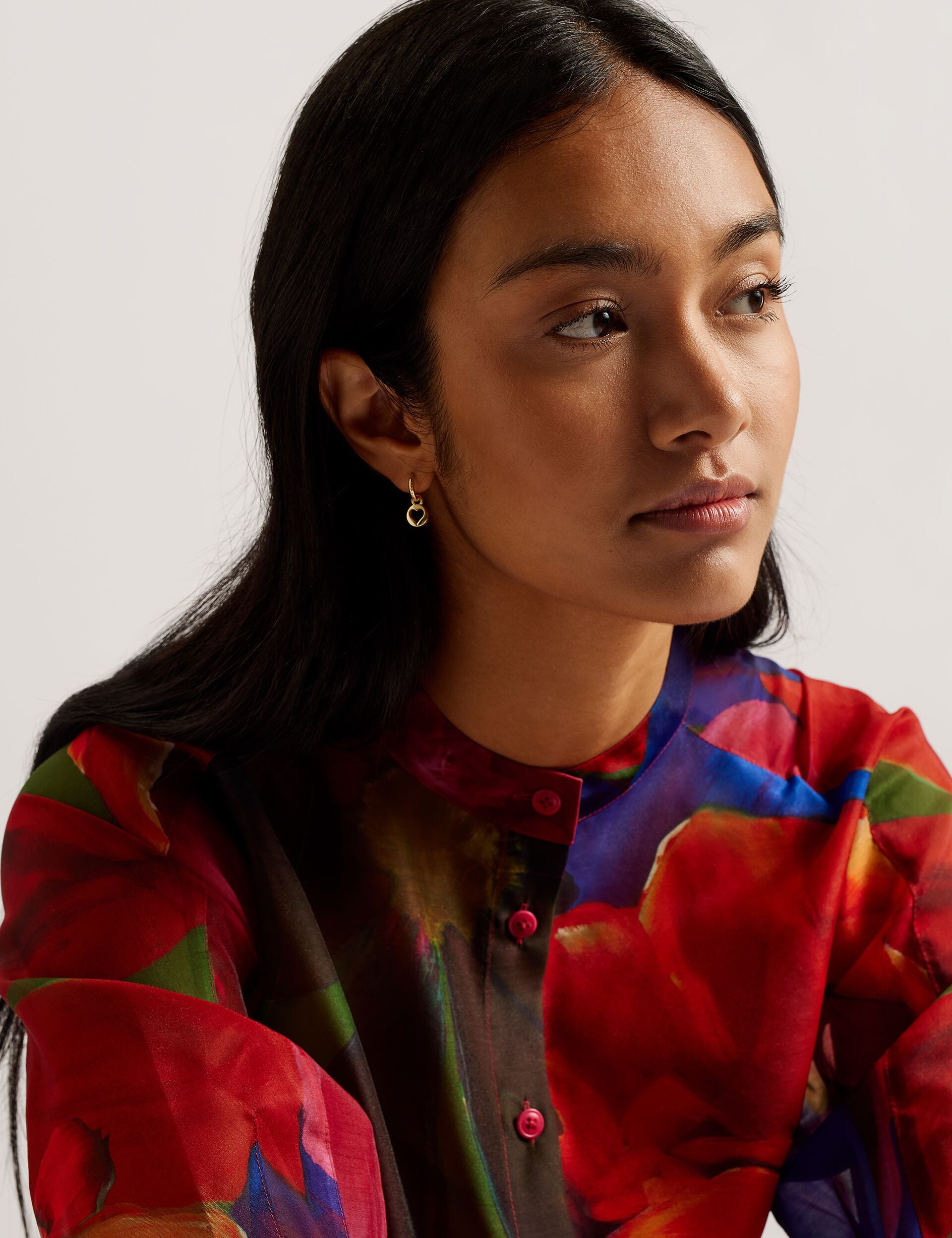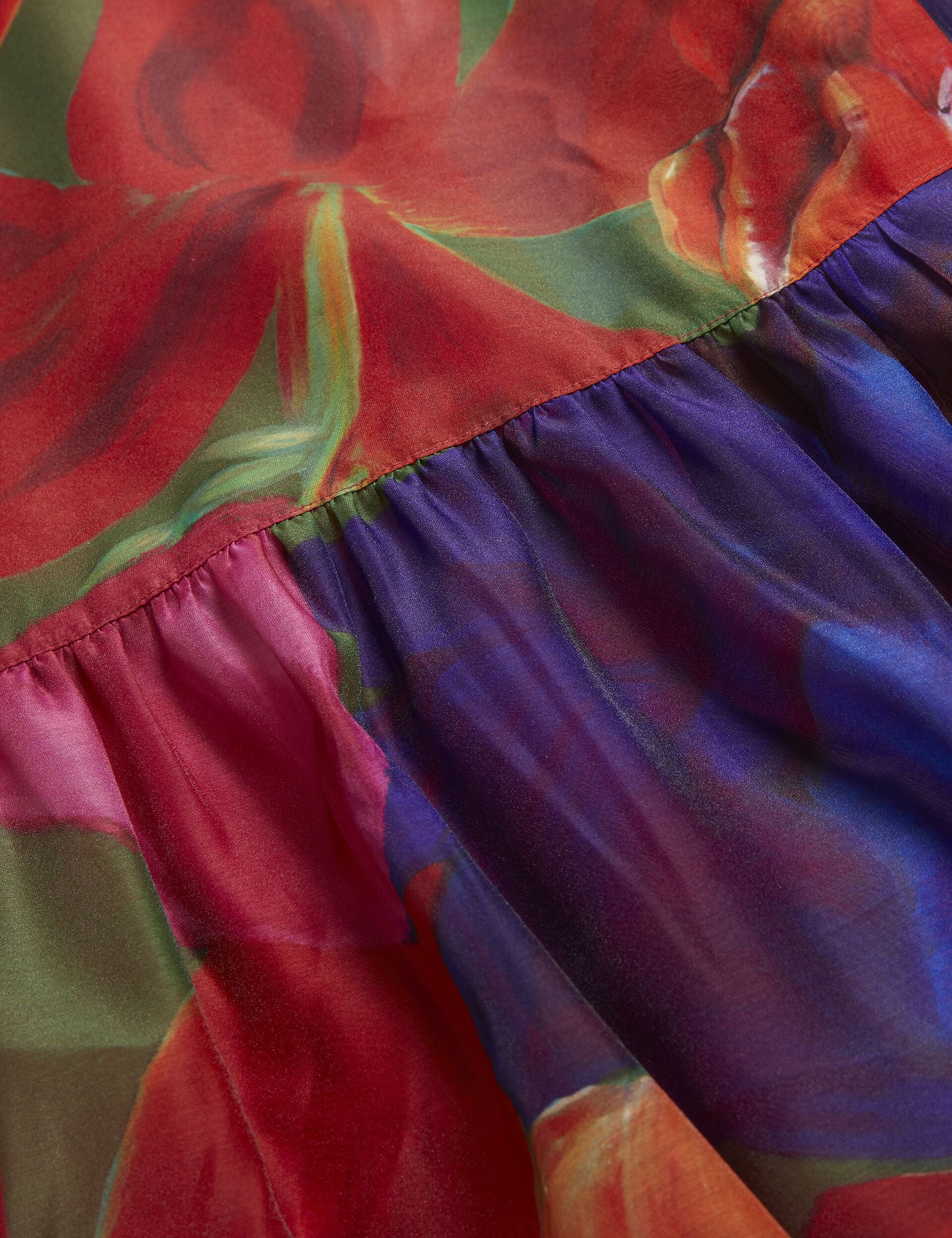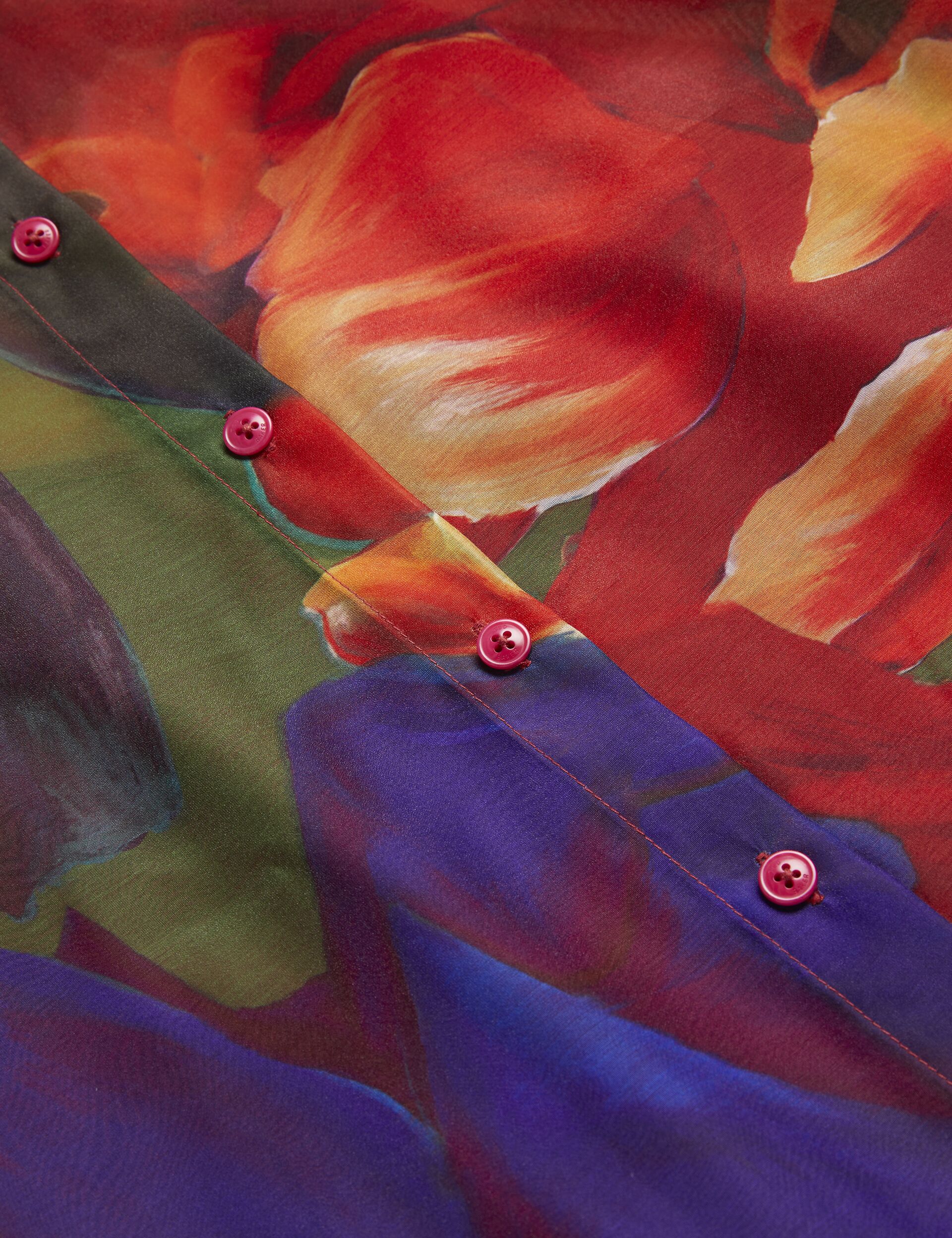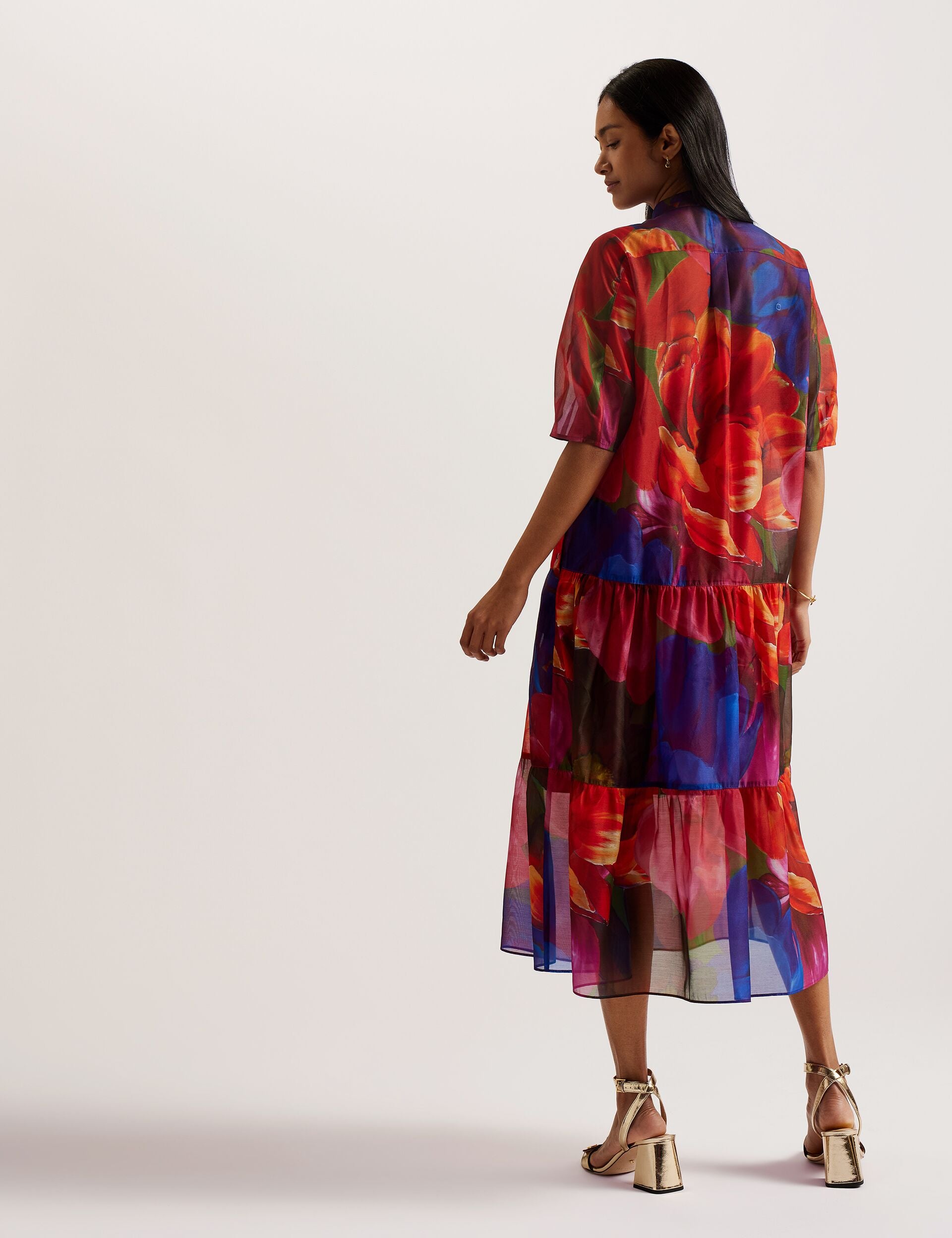 Step into the spotlight with MIRU, our short sleeve button-front dress, featuring a chic mandarin collar and a playful tiered skirt. Drenched in a vibrant floral pattern of vivid reds and blues, this dress brings energy to any occasion. Perfect for twirling through your day, this is one for the bold, the bright, and the beautifully confident. Because why settle for ordinary when you can bloom in full color?