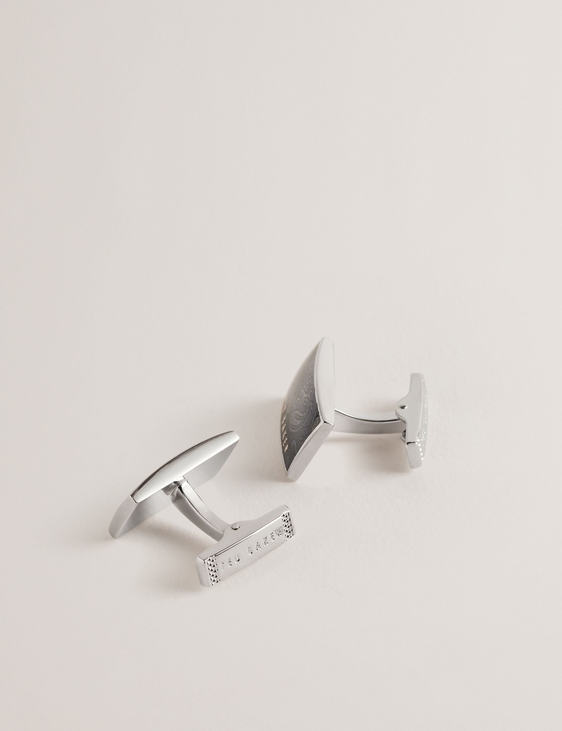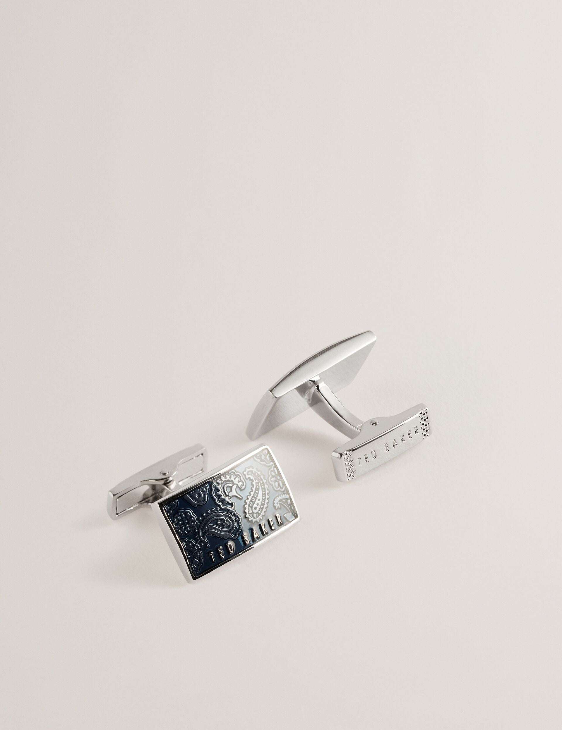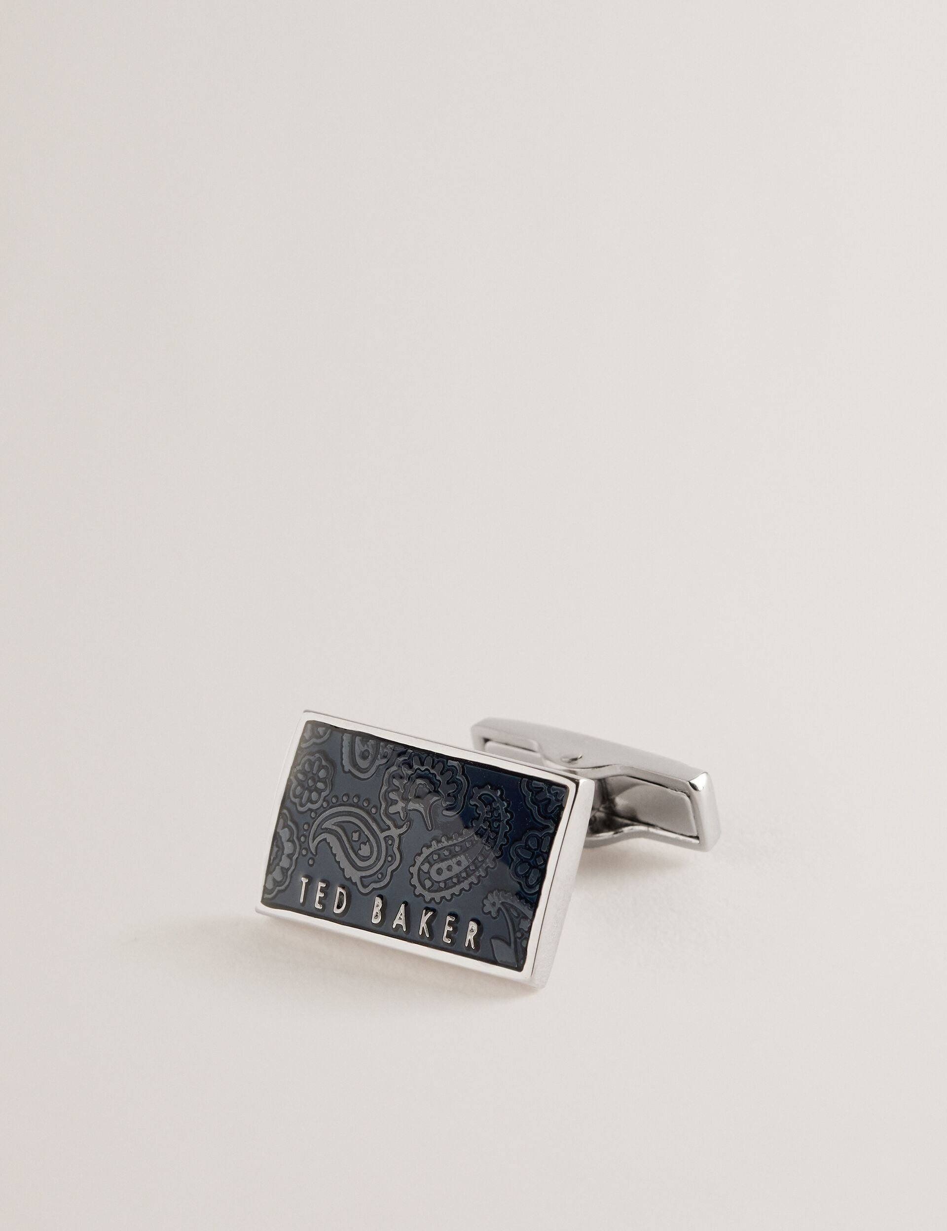 Bring a touch of flair to your business wear with these PAYSLI cufflinks, boasting a paisley print on a block colour background. Set in a shiny metal frame with an embossed logo detail, their rectangle shape mixes it up whilst still looking sleek.