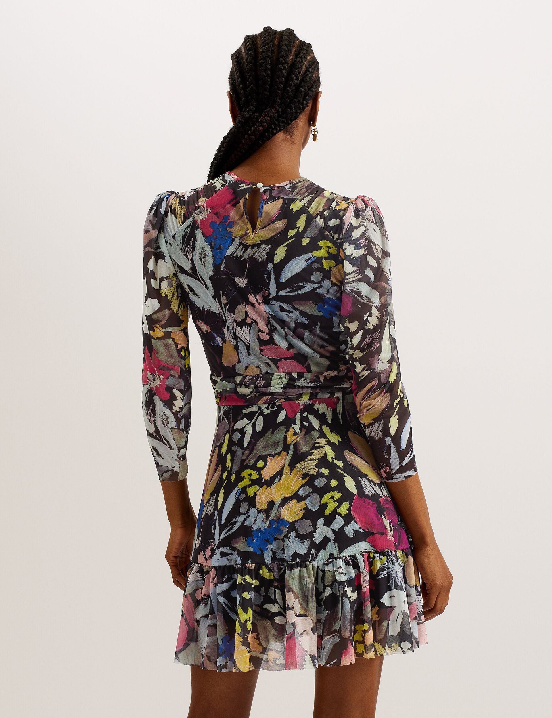 This floral mini dress will have you feeling flirty, with a mesh material and A-line skirt that's perfect for twirling. PAYSLYY features a gathered shoulder detail that gives way to three quarter puff sleeves for elegant detail.