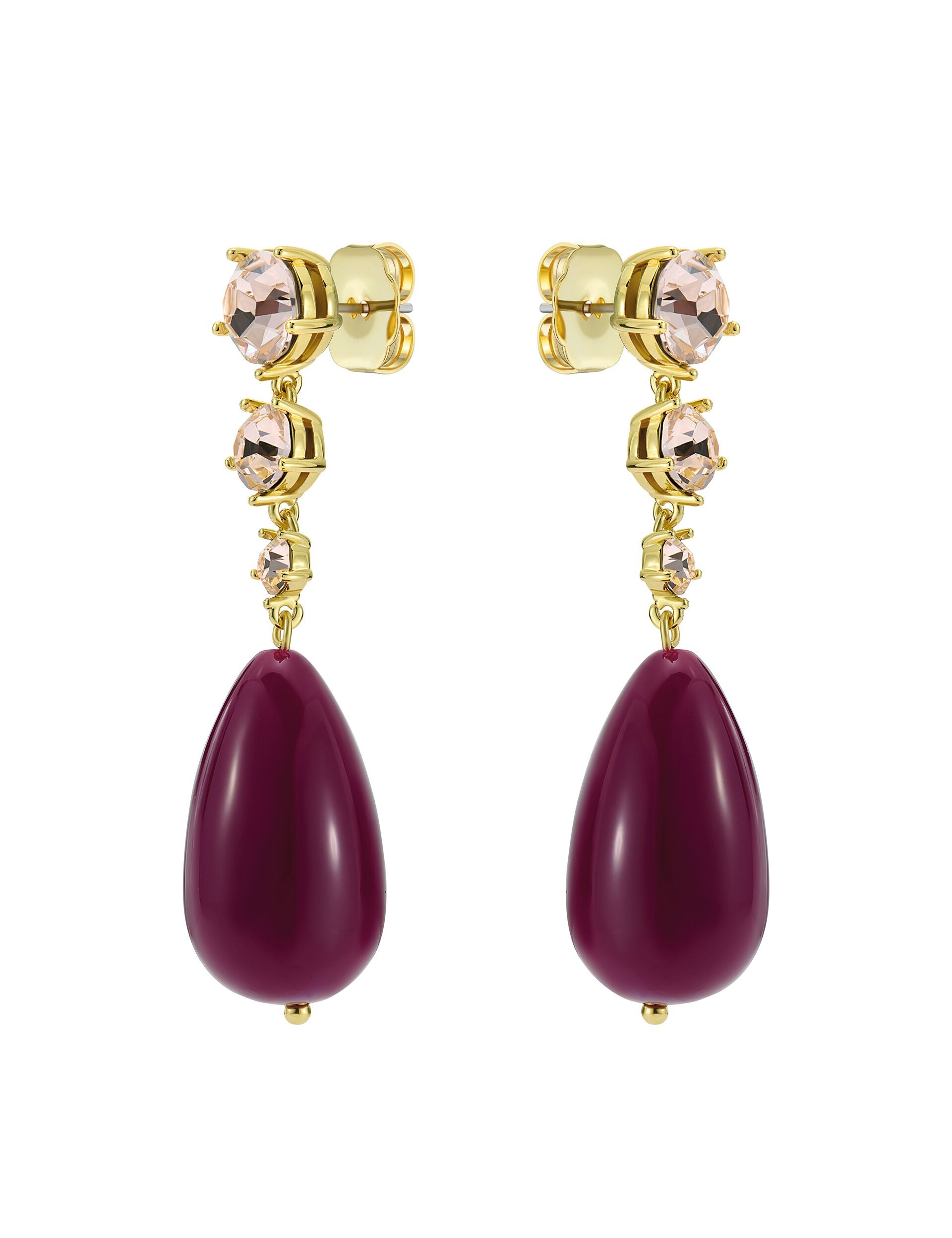 Accessorise to the nines with these PEARSTI statement earrings. A teardrop-shape pendant in rich plum is suspended from a row of pink crystal stones for the perfect balance of colour and sparkle.