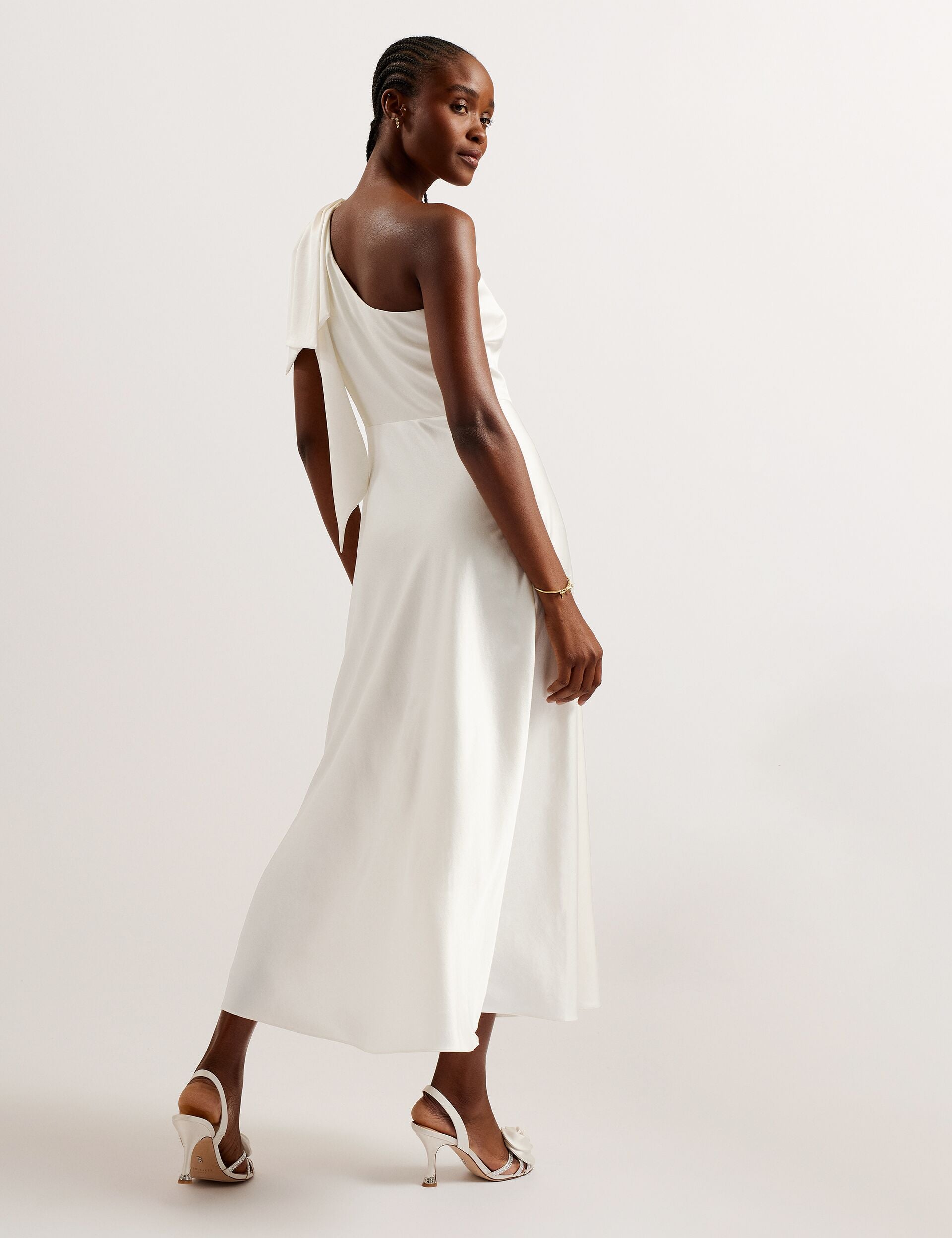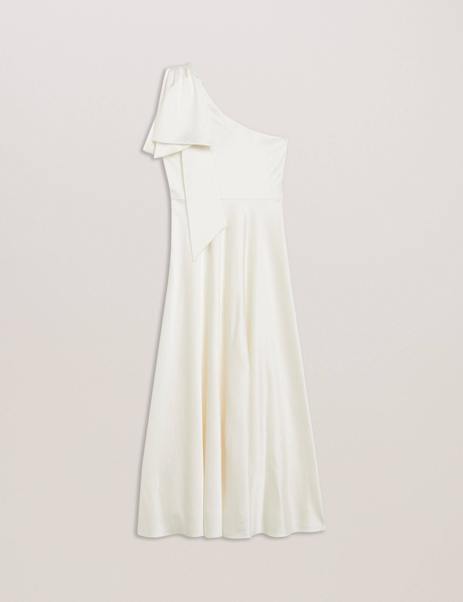 This satin number is all about understated glamour with its one shoulder design, embellished with an oversized bow that gently drapes over the bodice. RIKUTO is cut in an A-line silhouette with a midi length to create a dress that flows elegantly with every step. Pair with strappy heels to dazzle on those special occasions.