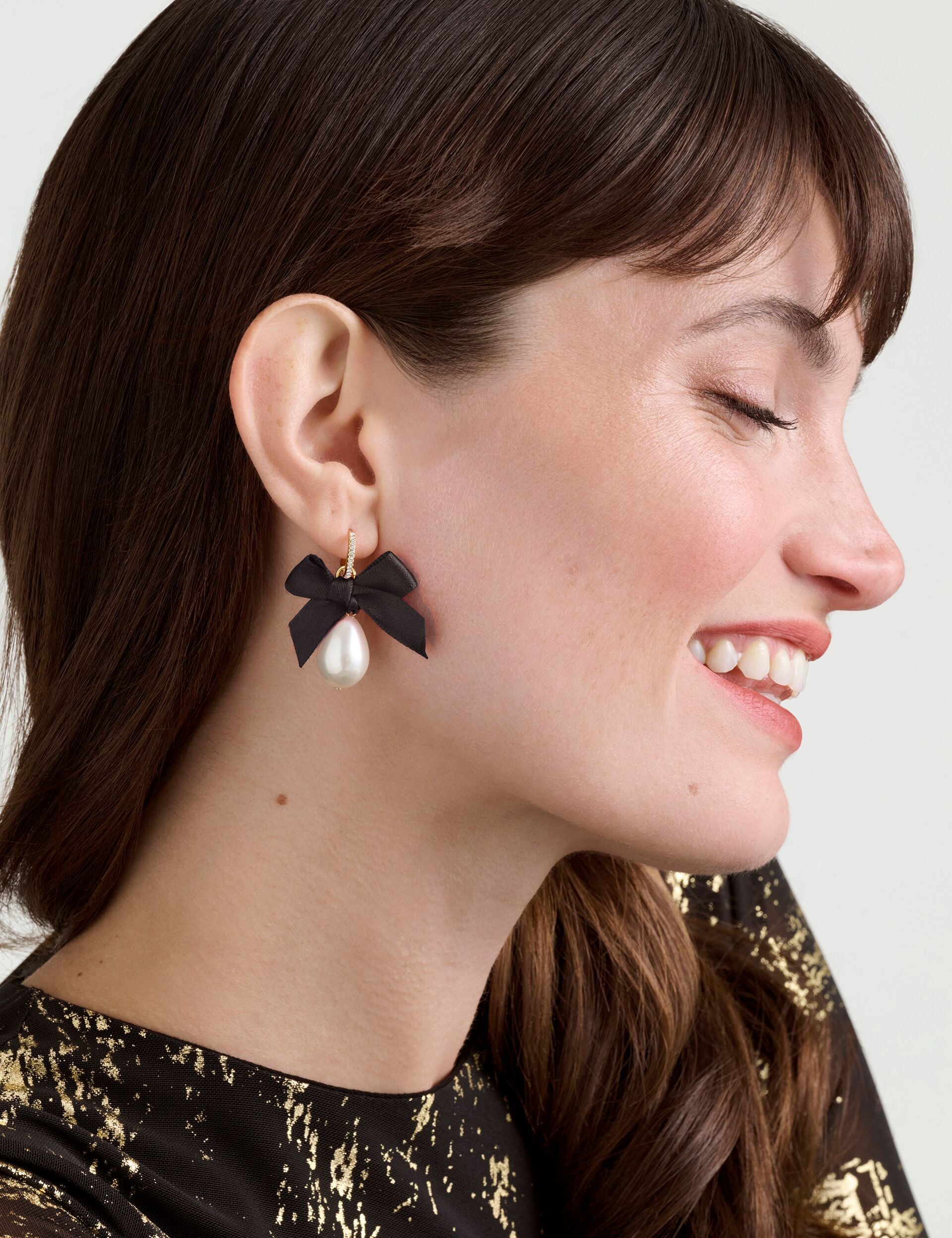 Add a touch of glamour with Ted Baker’s RIYYA Ribbon Bow Pearl Drop Huggie Earrings. These standout gold-tone huggies feature oversized black ribbon bows and elegant faux pearl drops—perfect for occasion wear or adding a statement finish to your look. The hoops are lined with fine European crystals for a subtle touch of sparkle. Presented in a Ted Baker branded gift box—ideal for gifting or treating yourself.