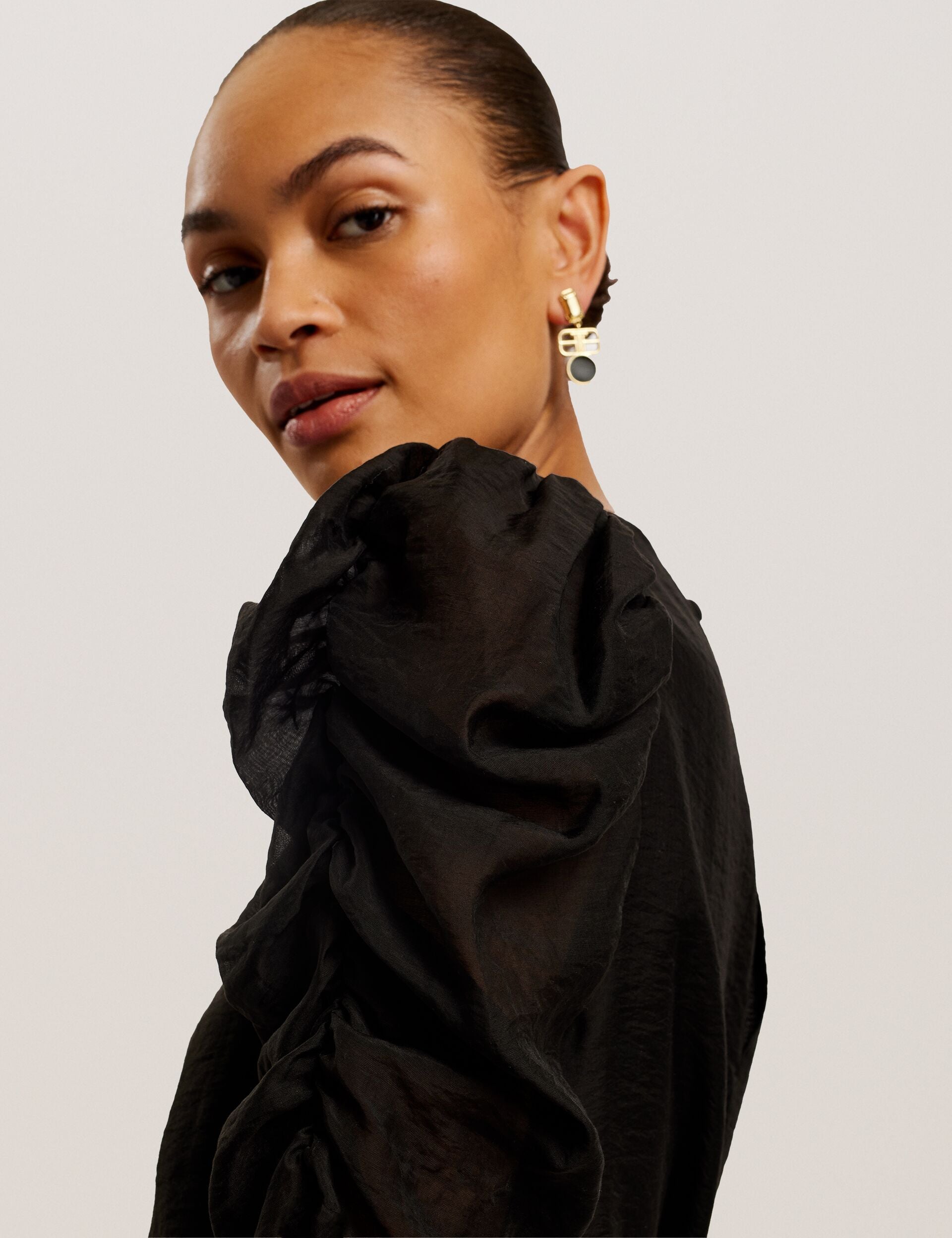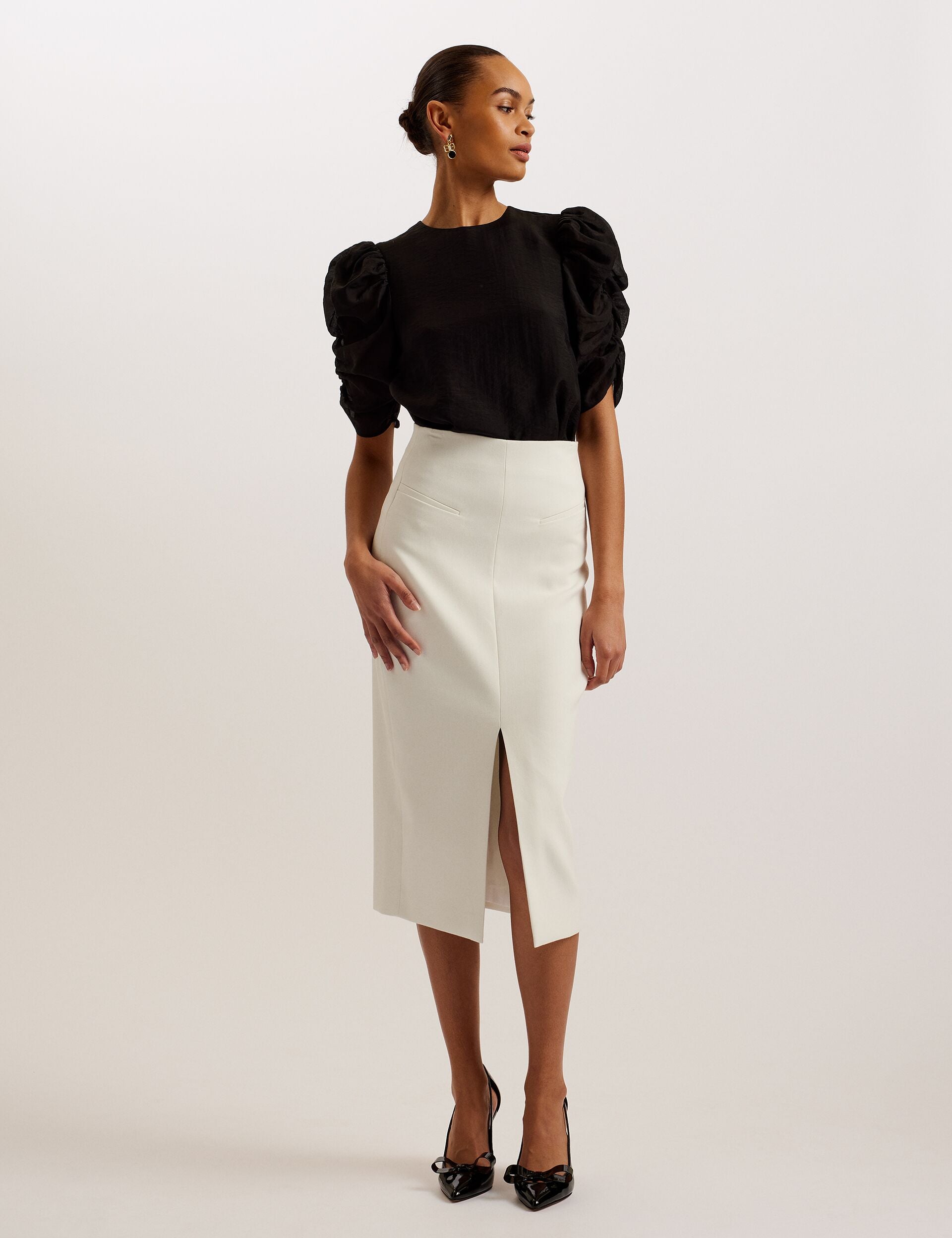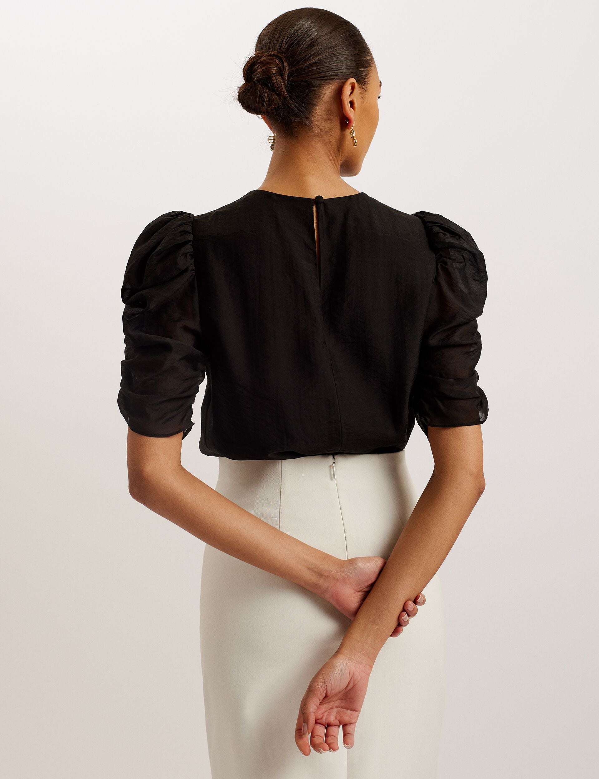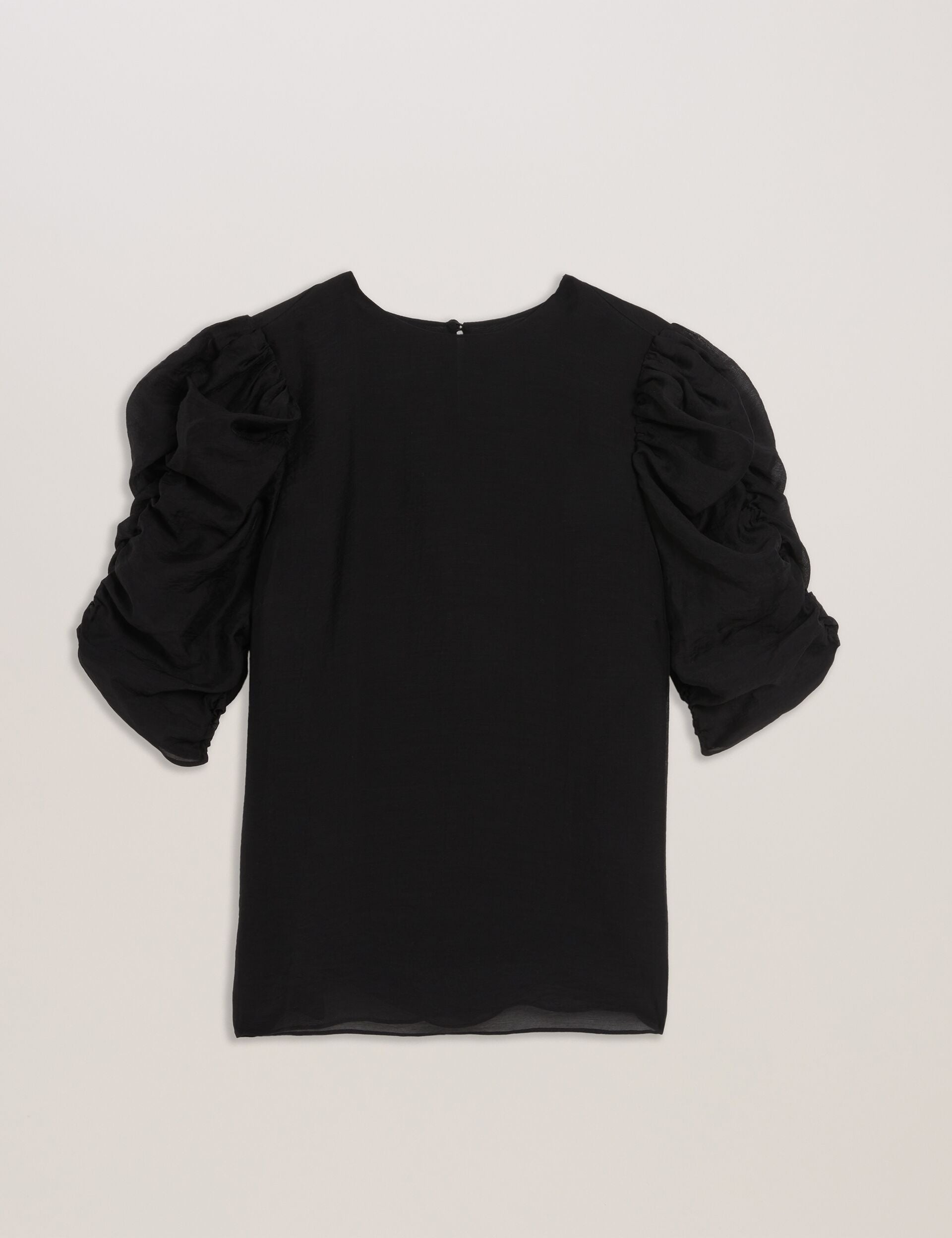 - Short puff sleeves with gathering detail