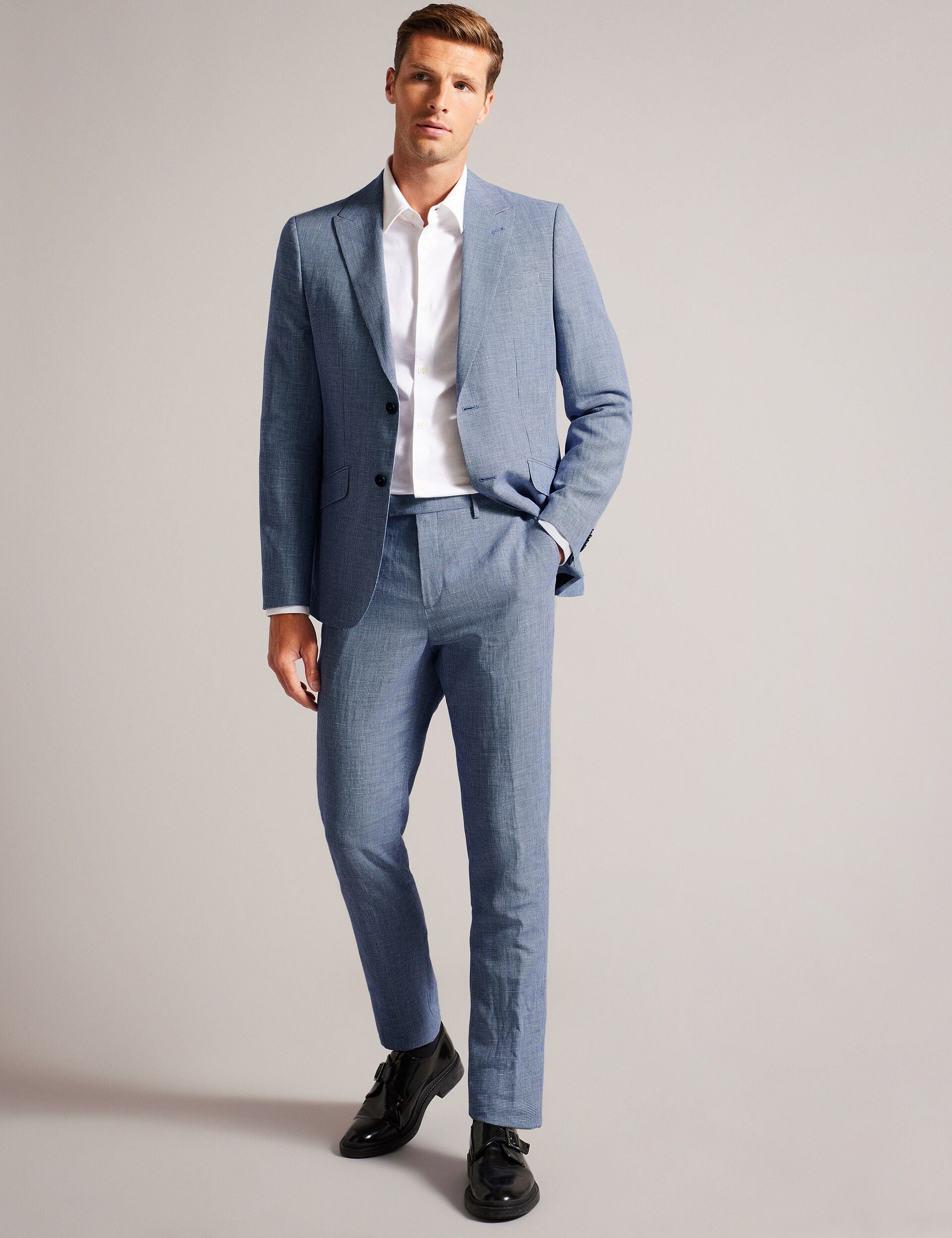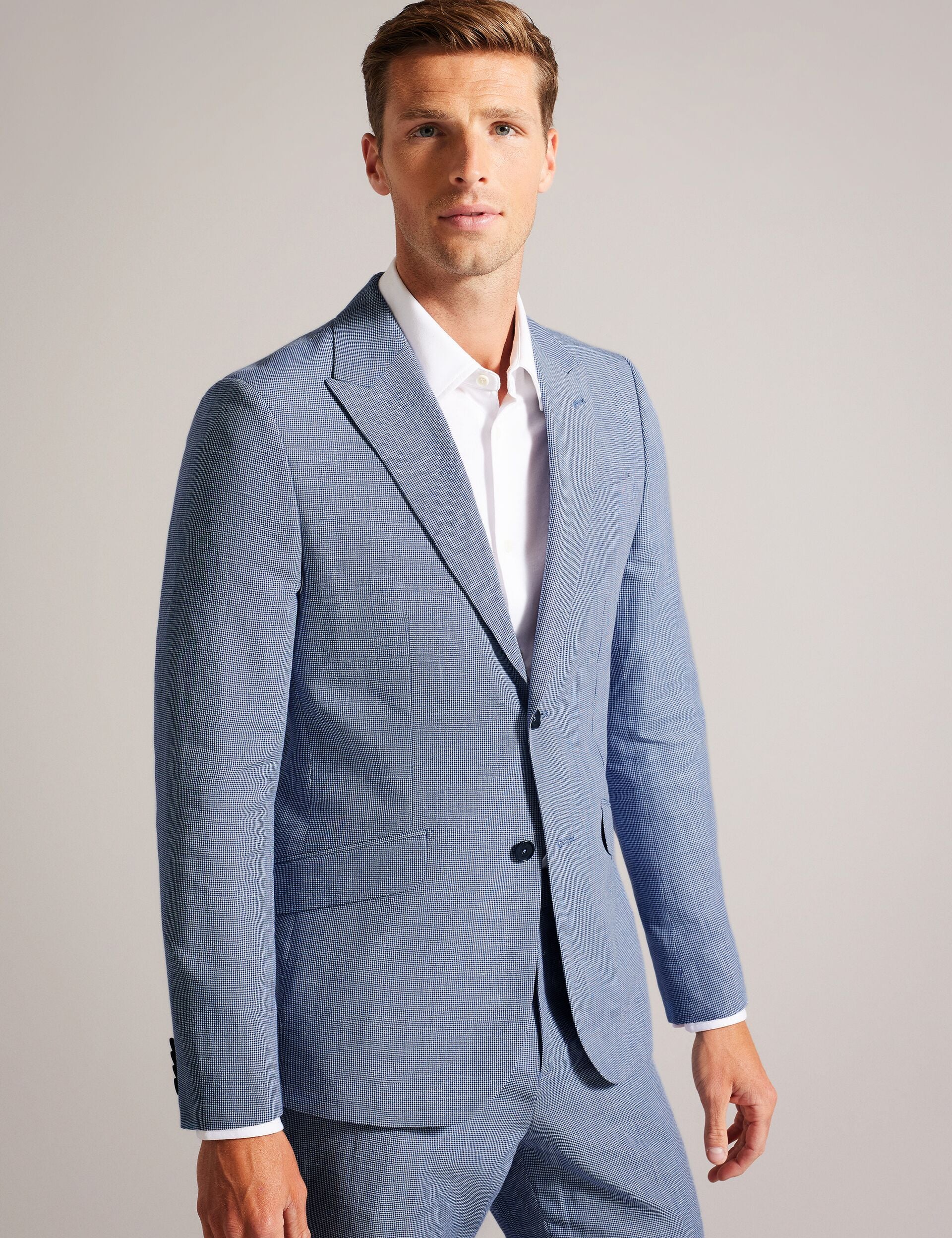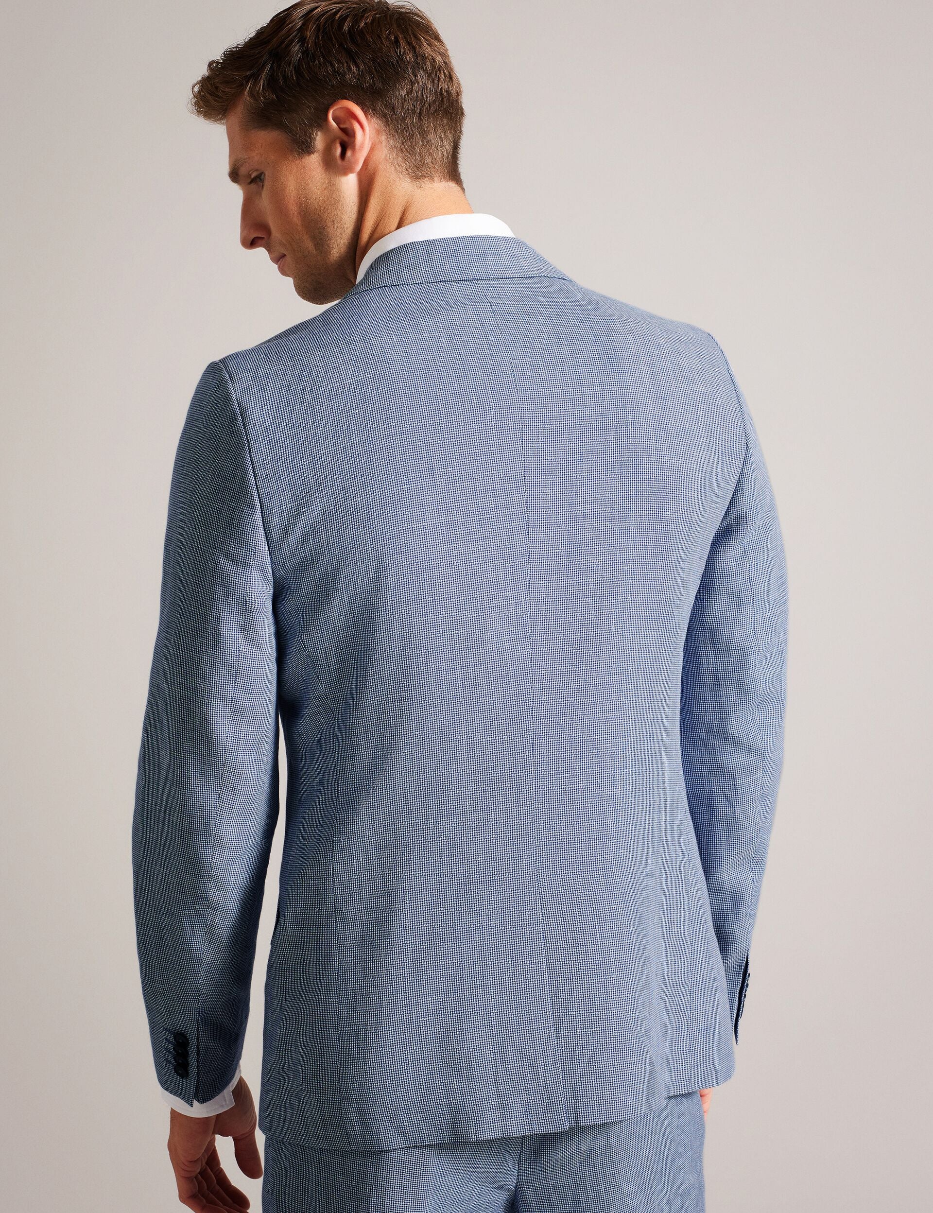 Introducing the perfect addition to your formalwear collection. SCOPEJ is a slim fit suit jacket crafted from a luxurious blend of wool and linen with a sophisticated puppytooth texture. The notched lapel and single breasted design exude classic elegance, while the slim fit offers a contemporary edge.