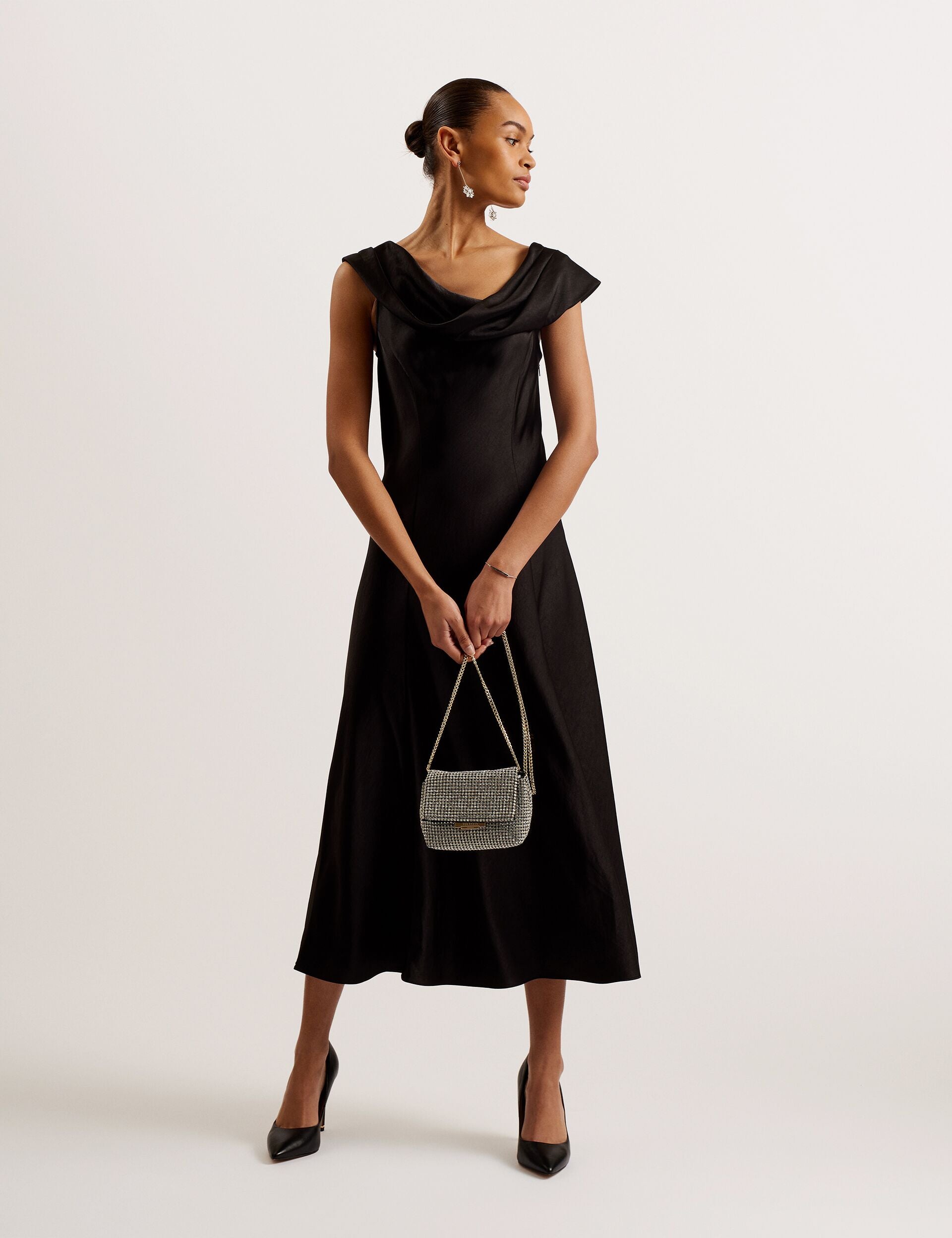 Looking for a dress that gives old Hollywood glamor? Meet SIRINNA. Crafted from a luxe satin, this bias-cut midi dress effortlessly drapes across your shoulders, adding the perfect amount of elegance. Pair it with an up-do and simple accessories to let this piece shine.