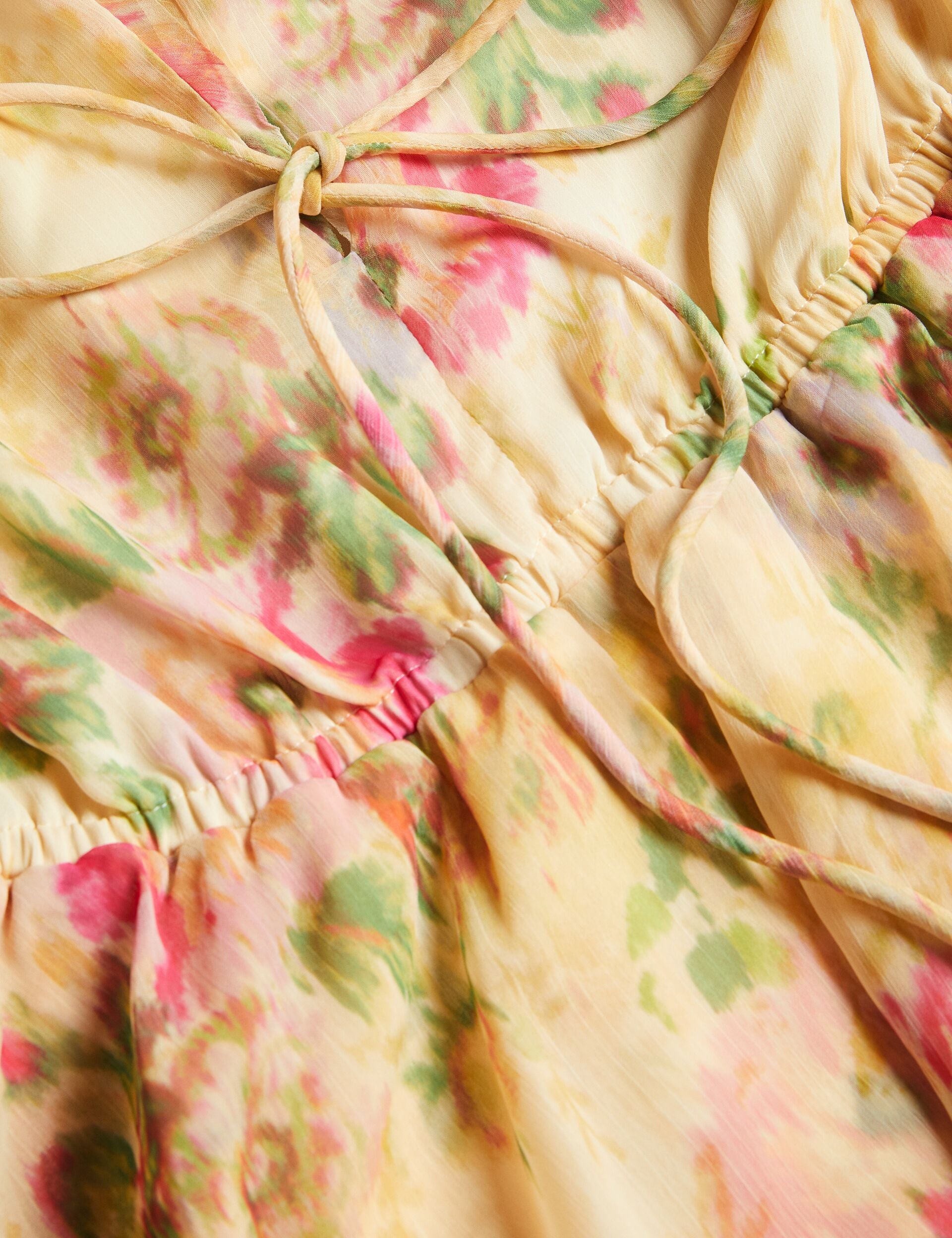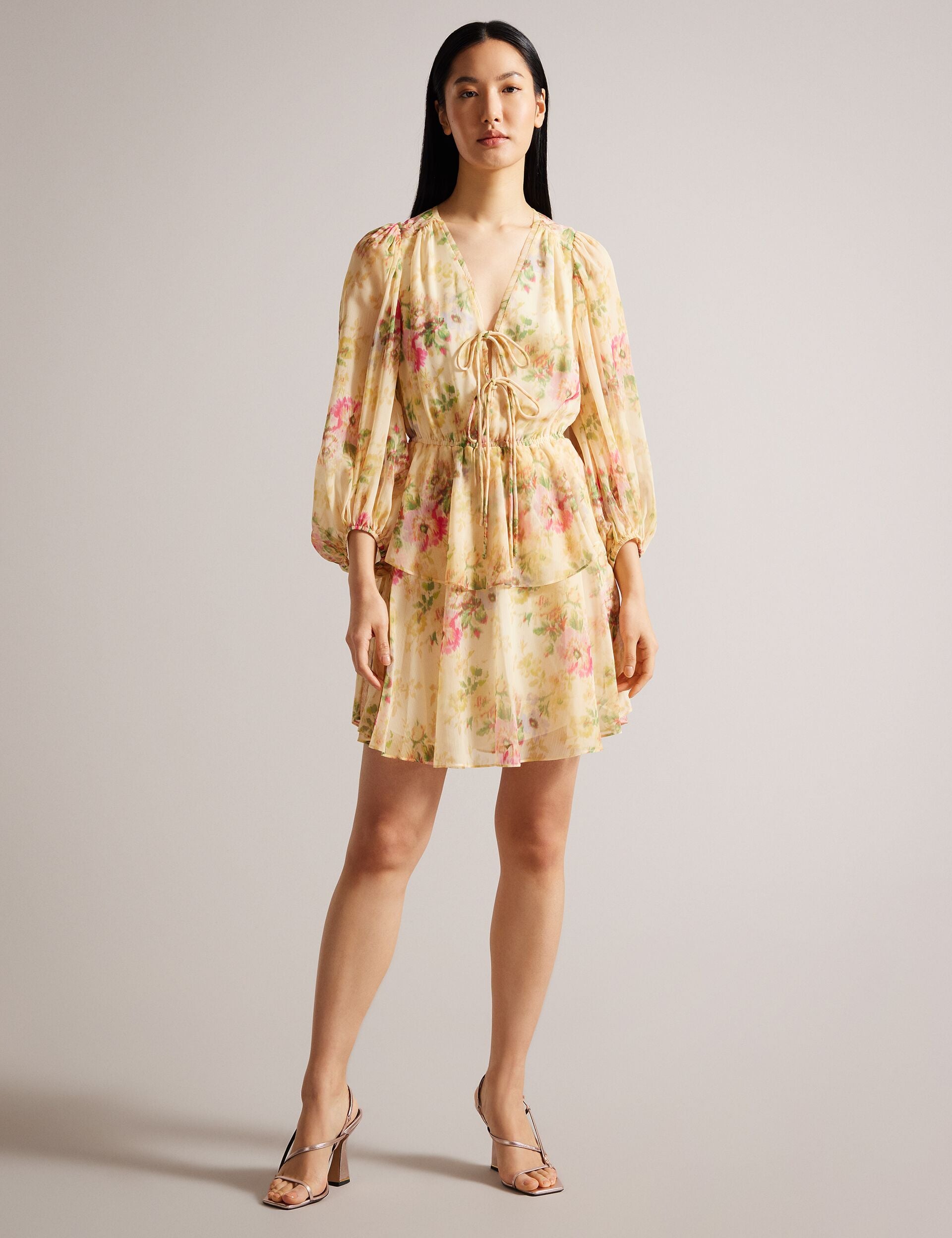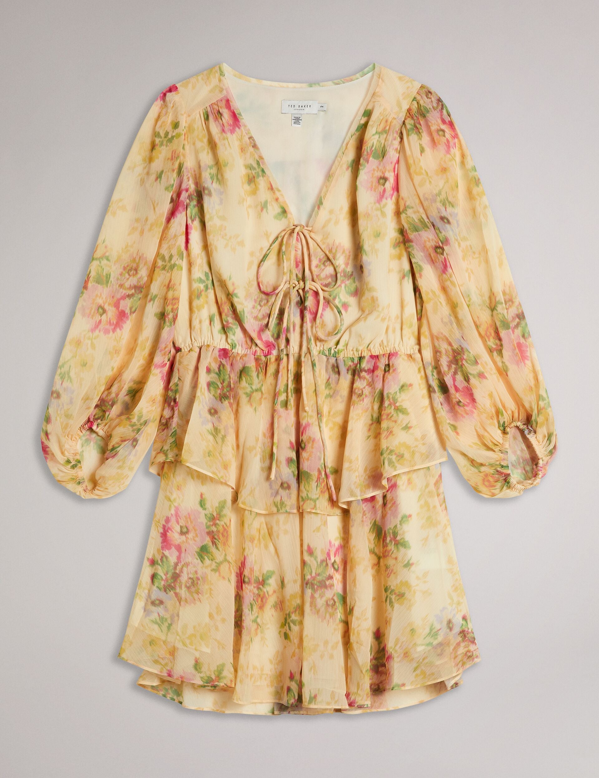 A dreamy hazy floral print, blouson sleeves, and a tiered skirt make TAMZIIY an absolute must-have for any fashionista's wardrobe, with a tie-up front so you adjust your style to perfection. From coffee mornings to garden parties, this dress effortlessly transitions with you, proving that versatility and chic sophistication go hand in hand.