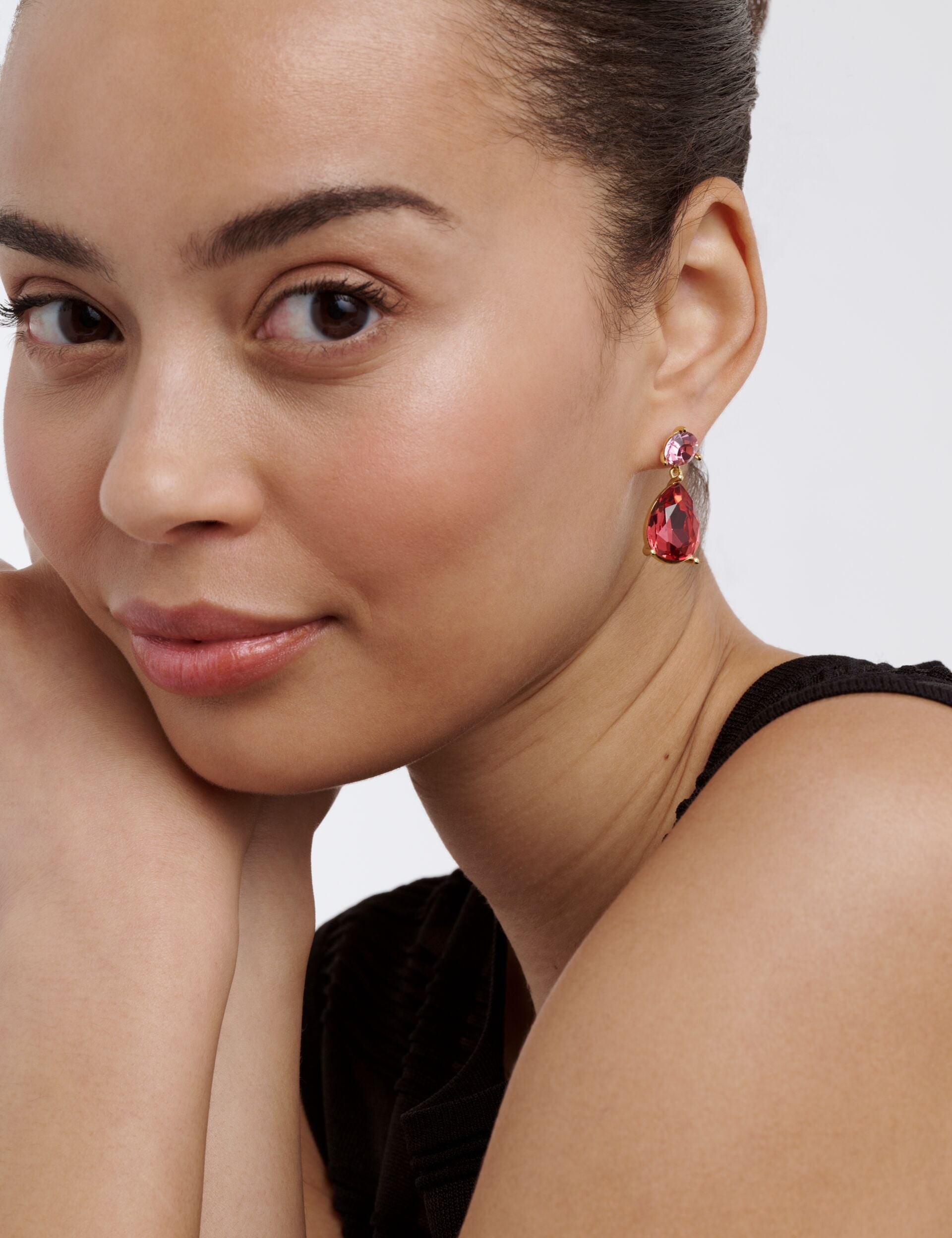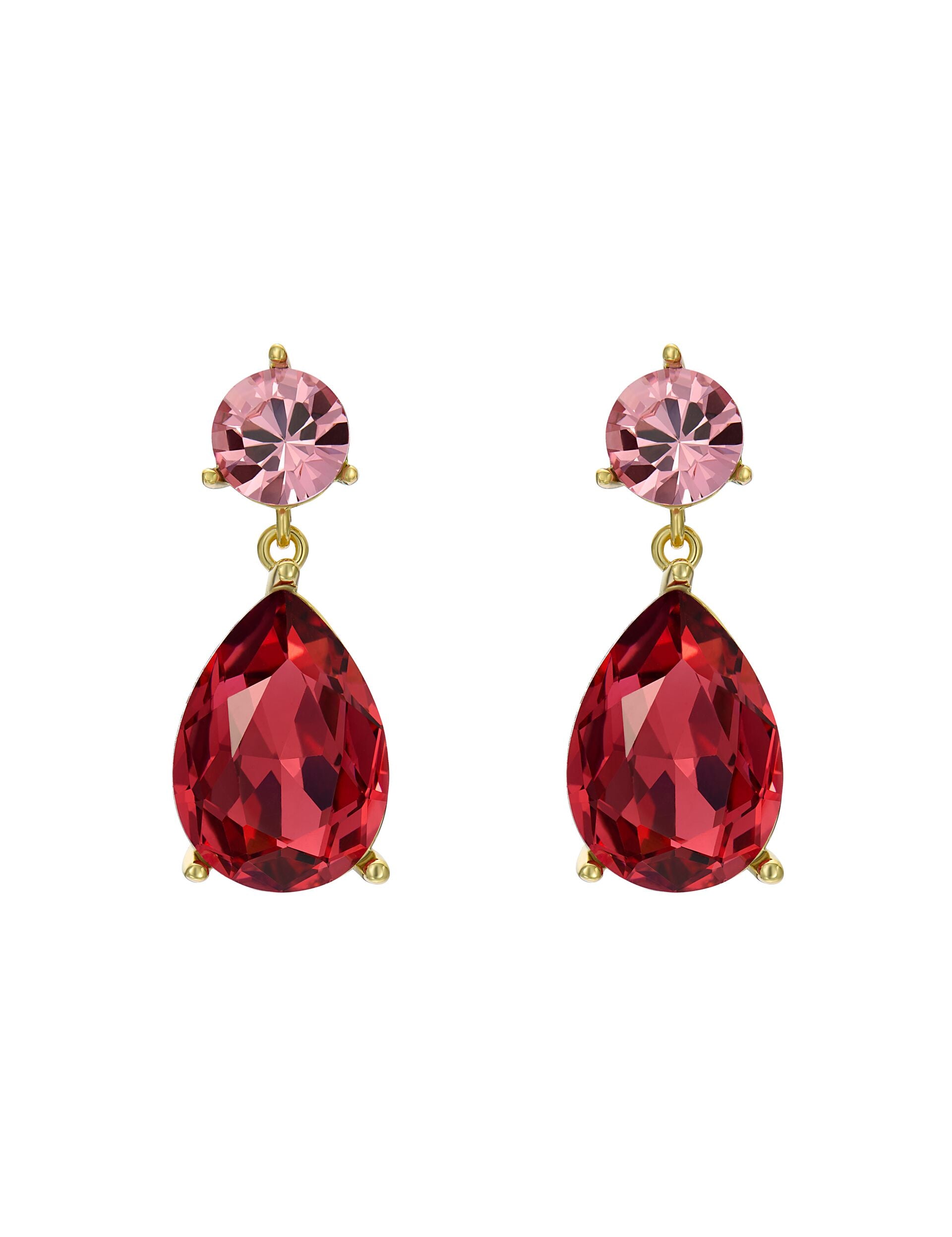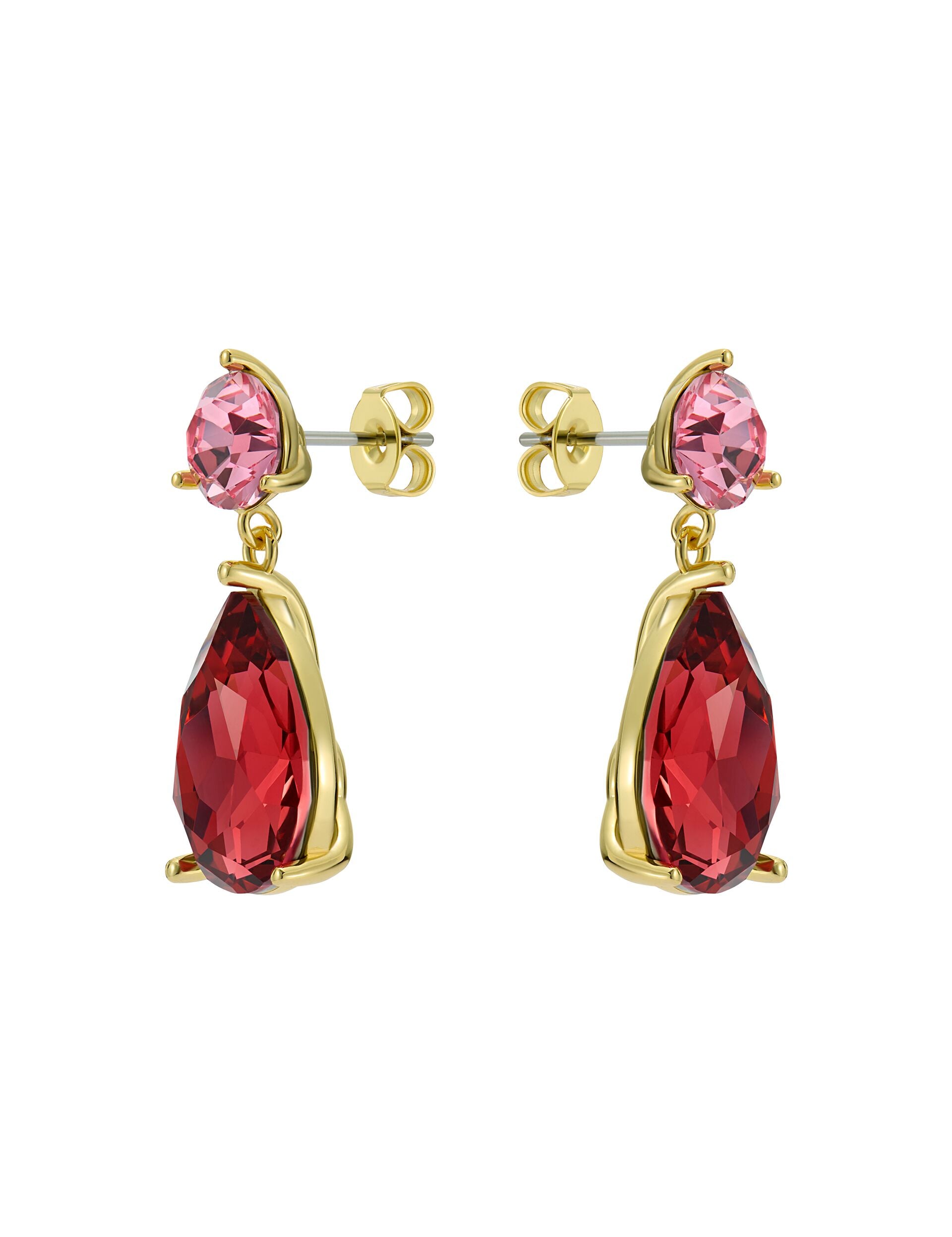 Radiance in every detail - TEAIRE pairs a brilliant pink round-cut stone with a deep red teardrop crystal for a striking, elegant finish. Perfect for adding colour and sparkle to any look.