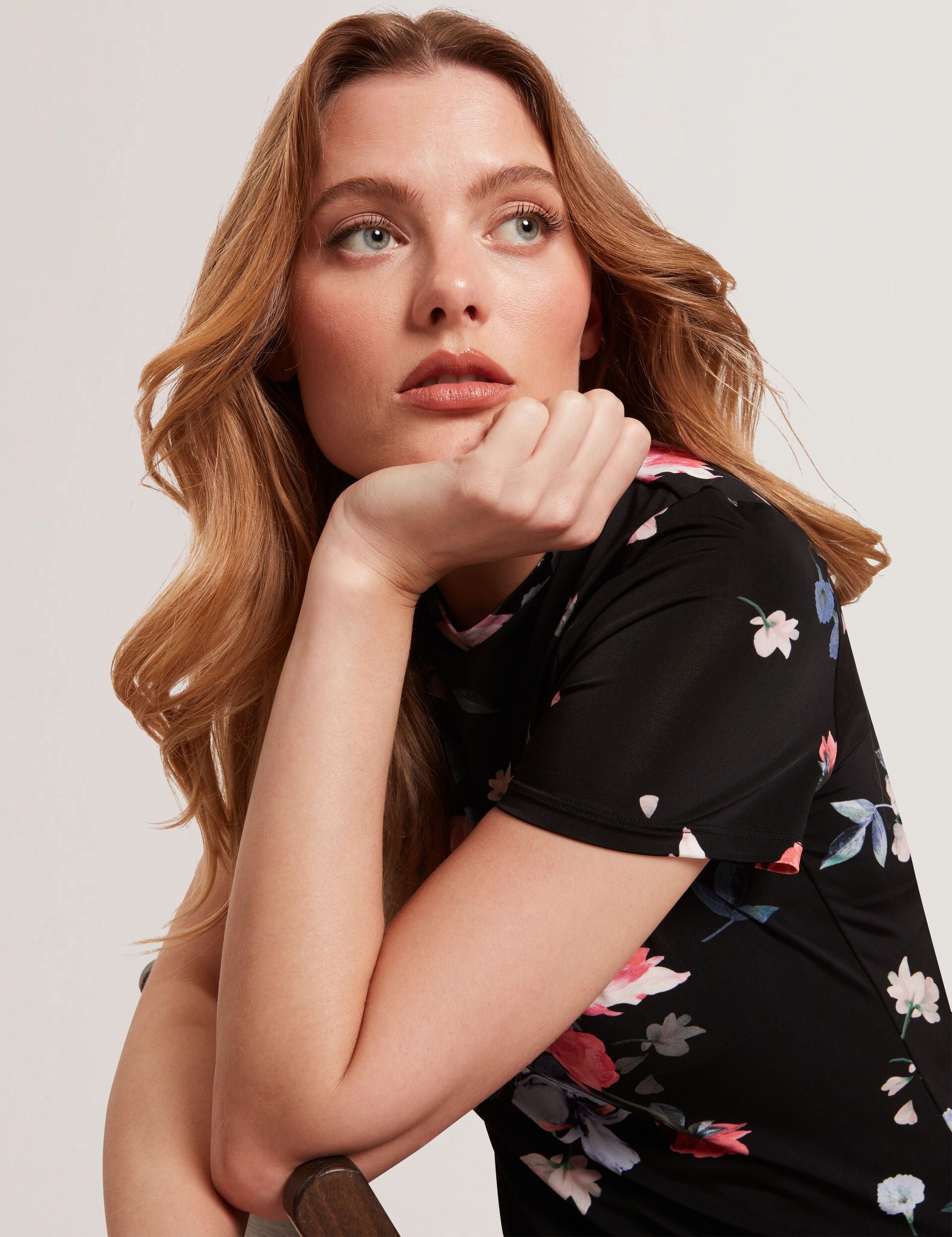 This t-shirt offers a perfect blend of bold sophistication and feminine charm, making it a versatile addition to any wardrobe