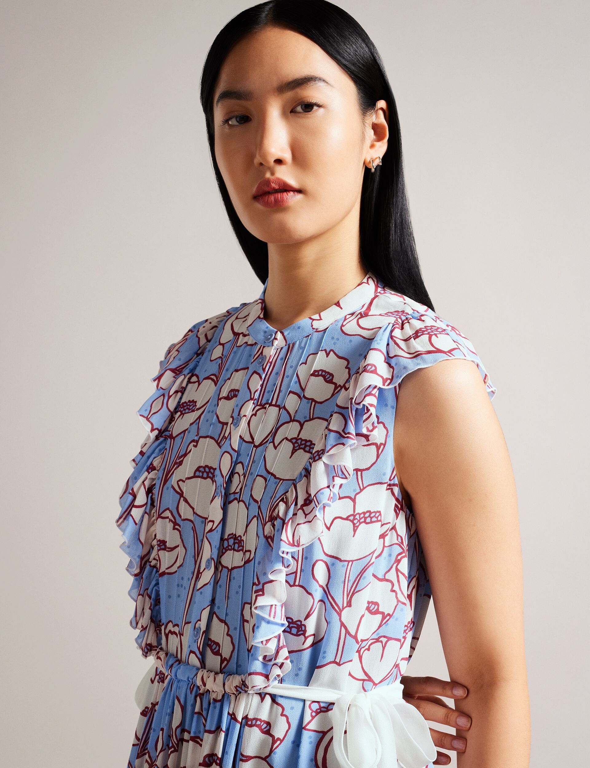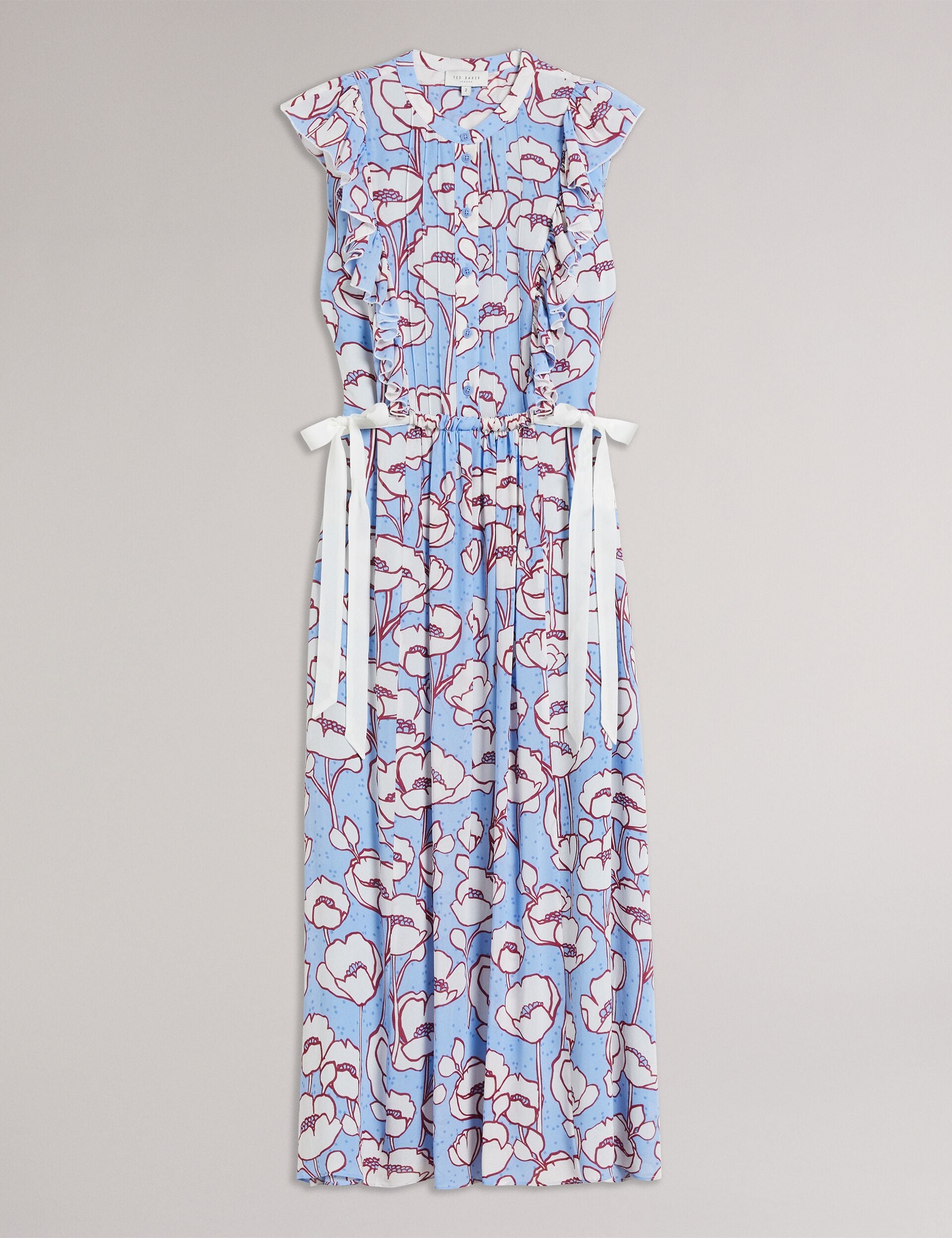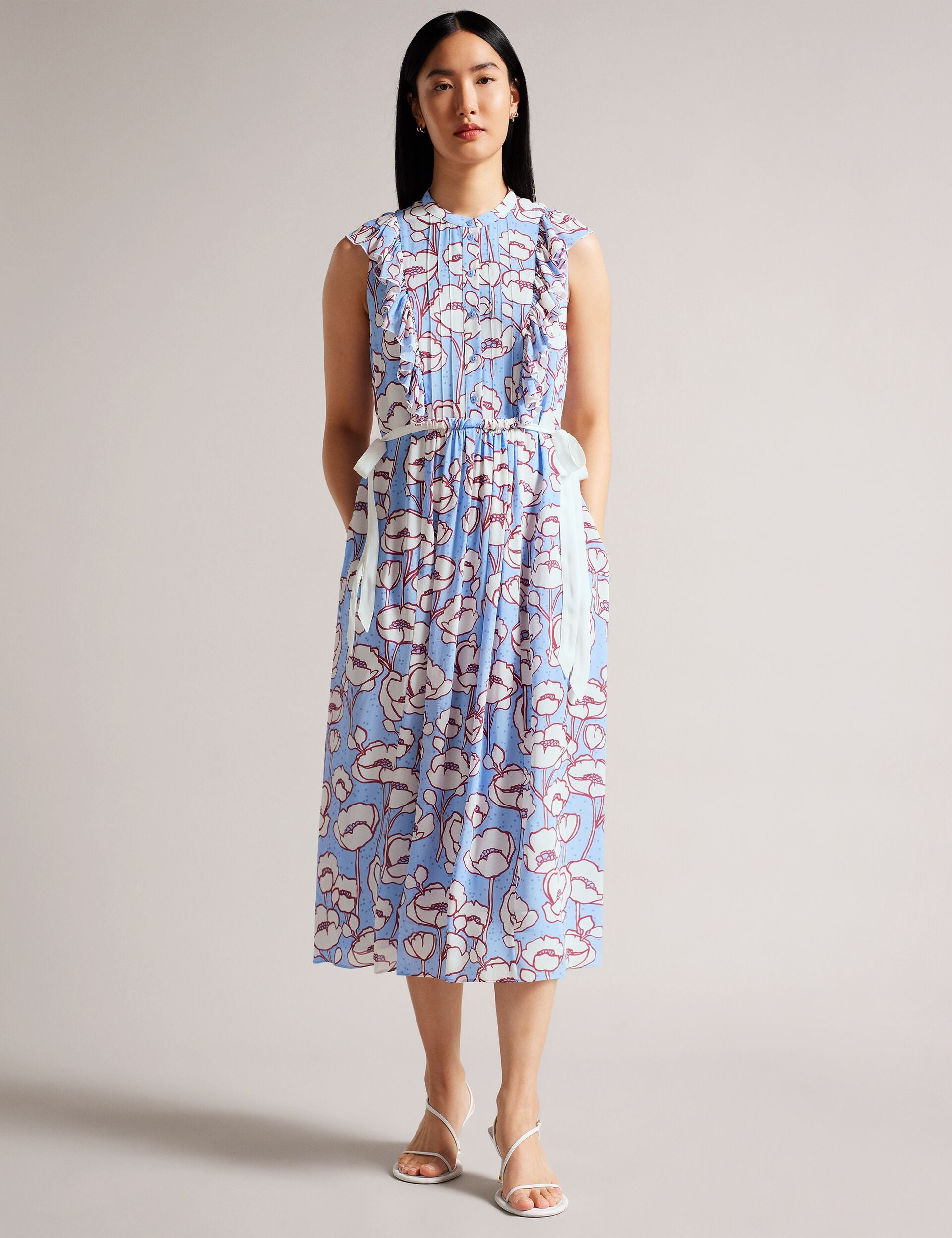 Introducing TINDRAA, the perfect dress to brunch in style or impress the family at your next get-together. This sleeveless stunner features a vibrant poppy print that's sure to turn heads, and the button fastening and waist ties ensure a flattering fit.