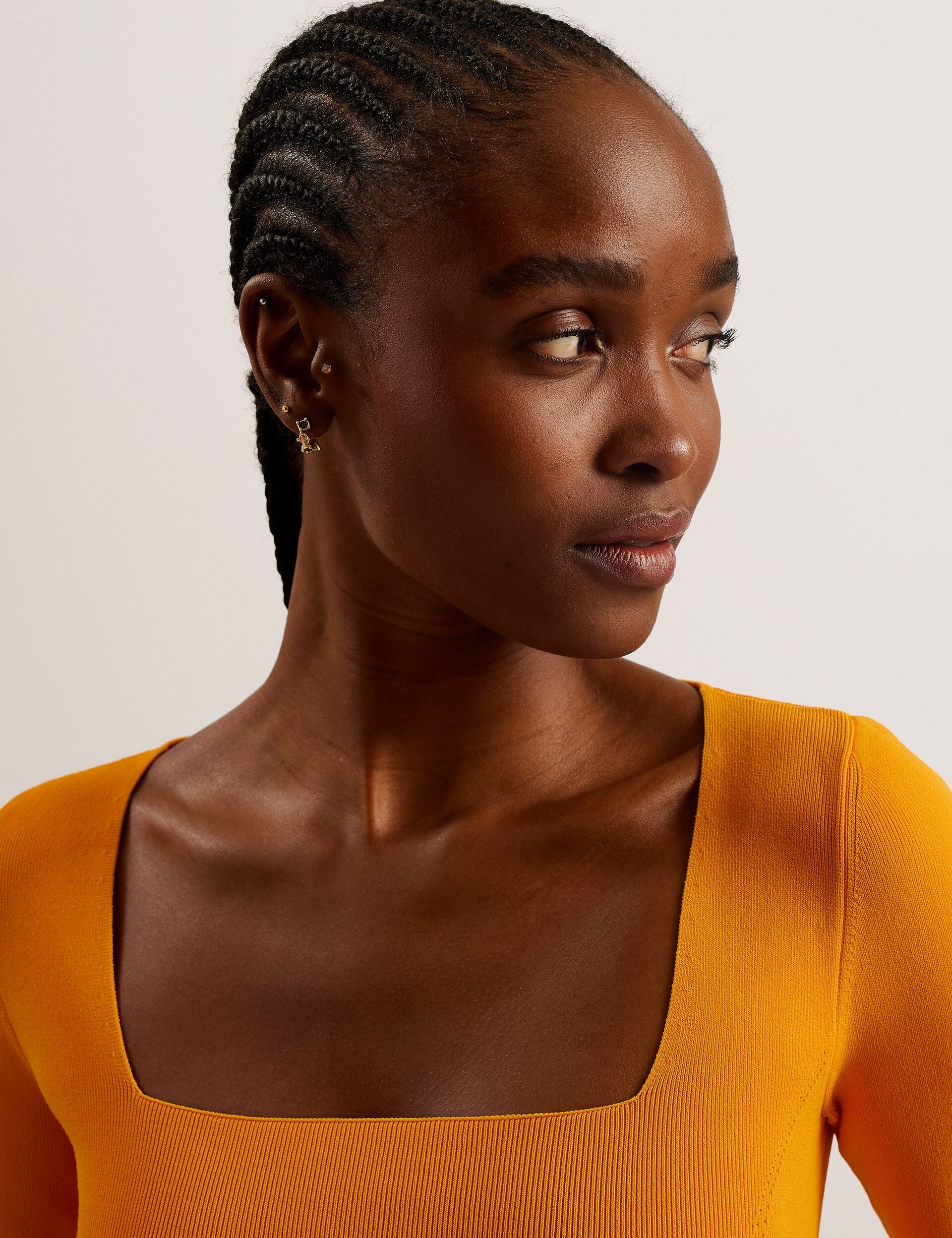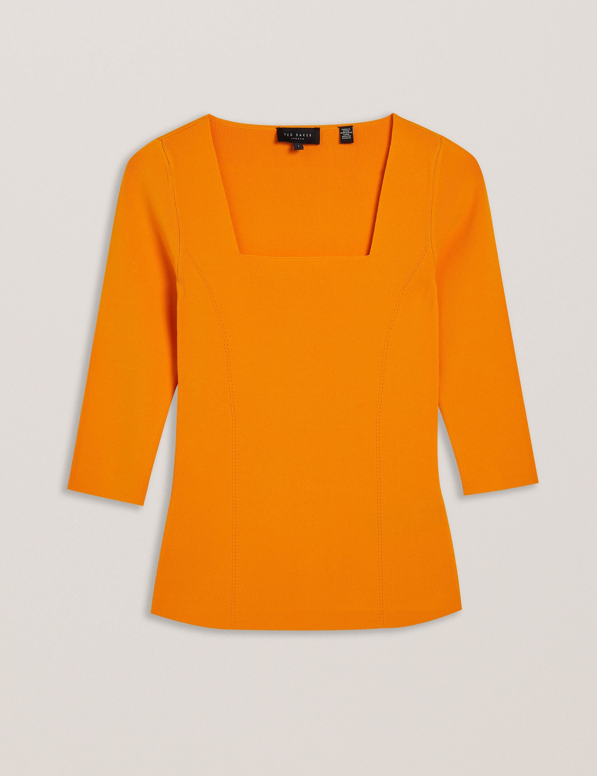 Elevate your wardrobe with our VALLRYY square-neck top. Featuring three-quarter length sleeves, a ribbed knit material, and an eyelet seam detail, this top is an elegant, flattering staple.