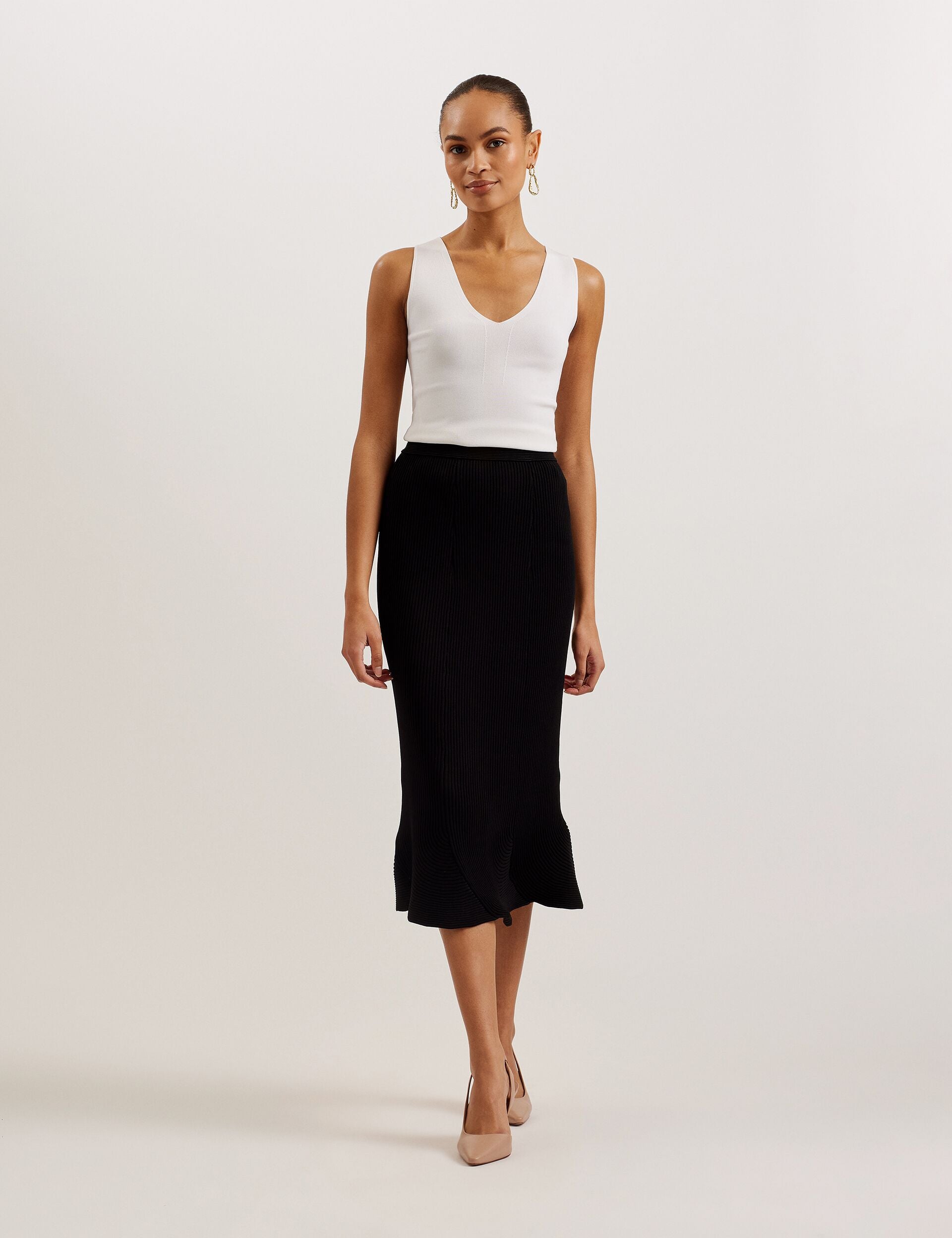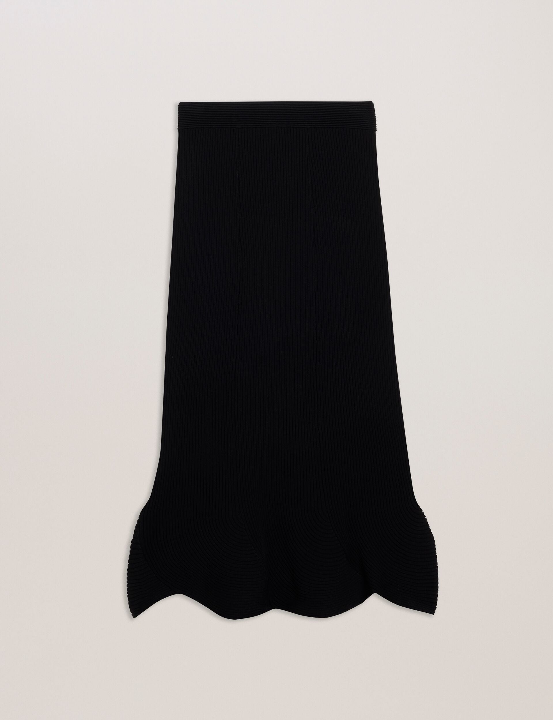 The VELENAA midi skirt cuts a stunning silhouette with a pencil shape that flares out at the end, whilst the curved shape detail on the hem adds a flouncy finish. The ribbed knit material not only hugs your shape but brings a comfortable and stretchy fit. Pair with your favorite heels for a party look, or a tailored blouse for the office.